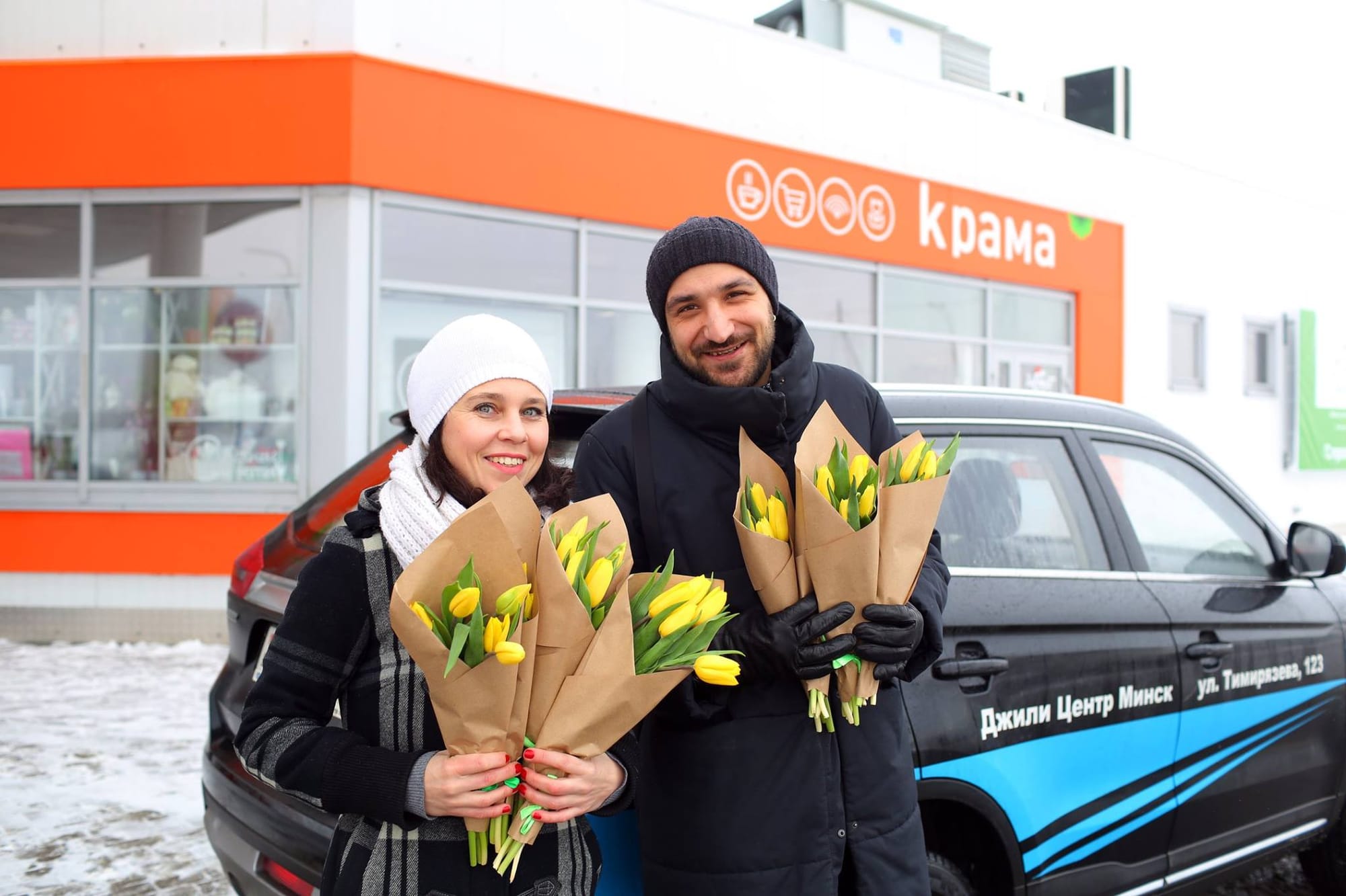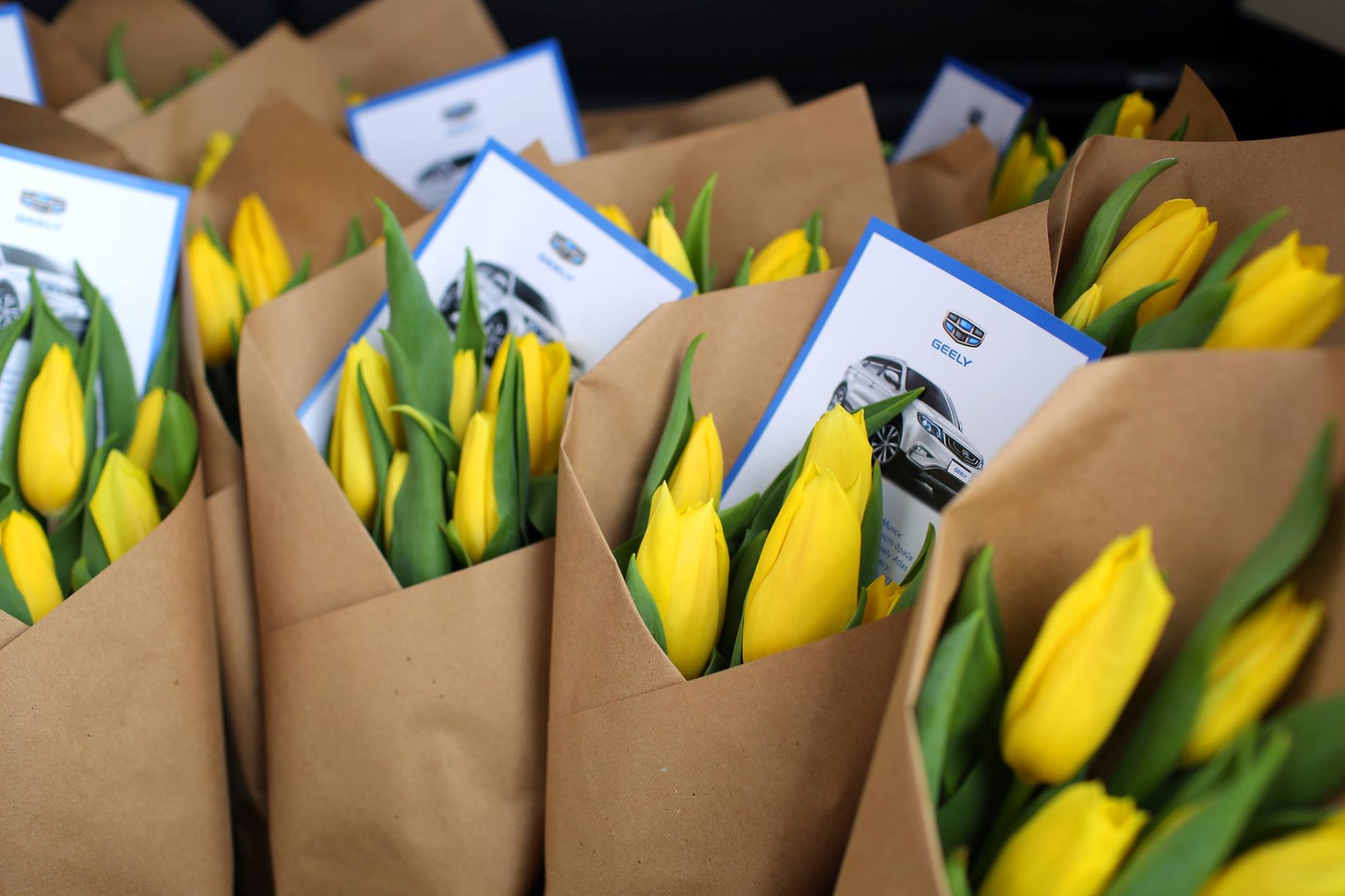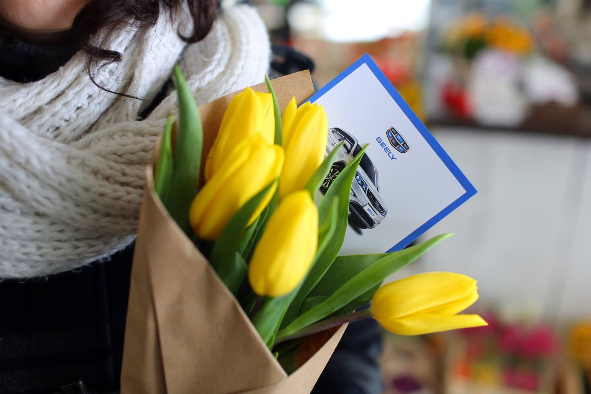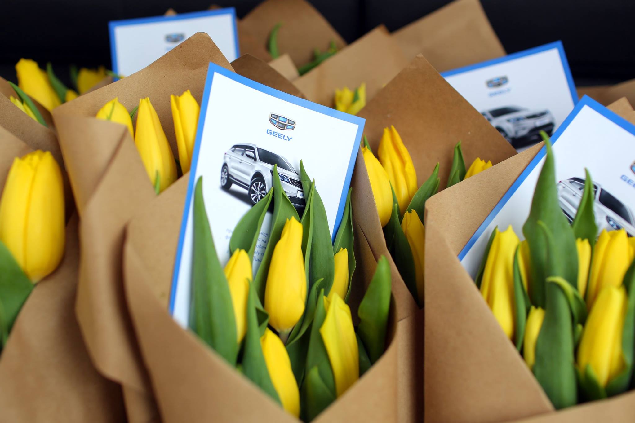 На заправках бесплатно им раздавали весенние букеты, которые они могли подарить любимым женщинам. Автомобиль Geely с полным багажником цветов курсировал целый день между автозаправочными станциями А-100. Каждый час он перемещался в новую точку.