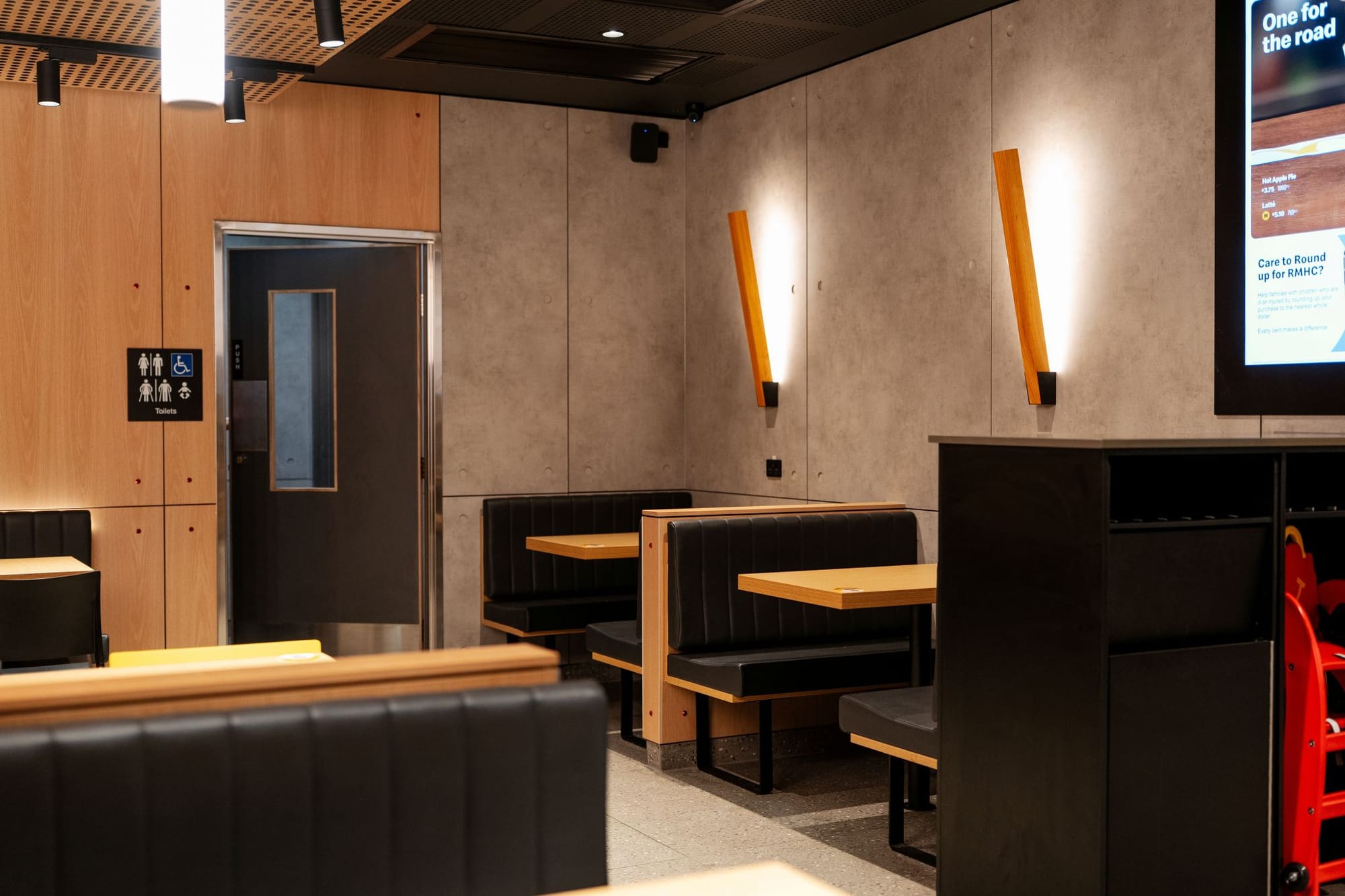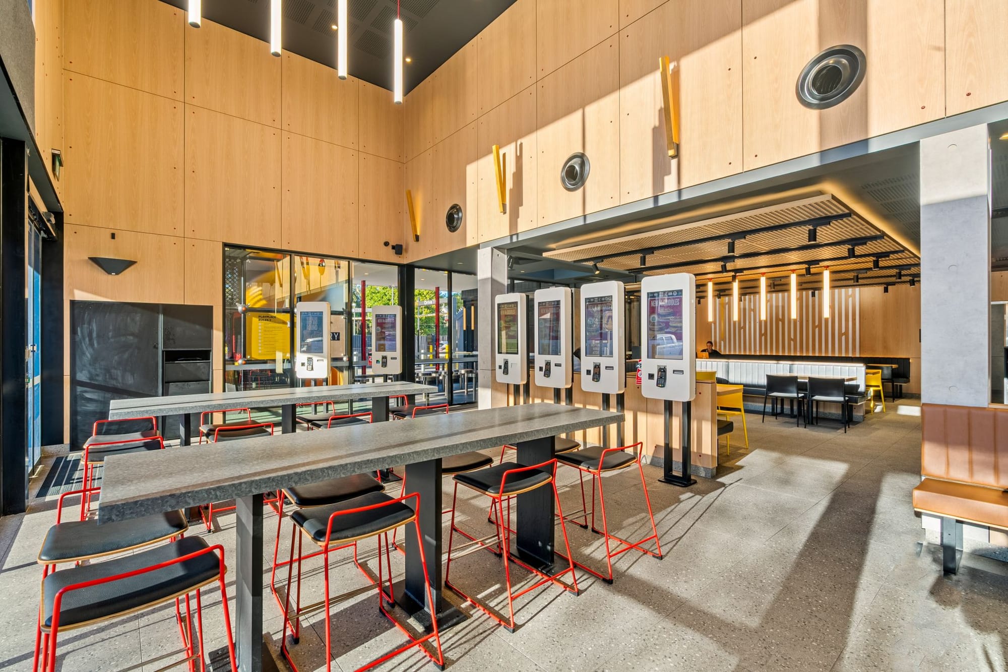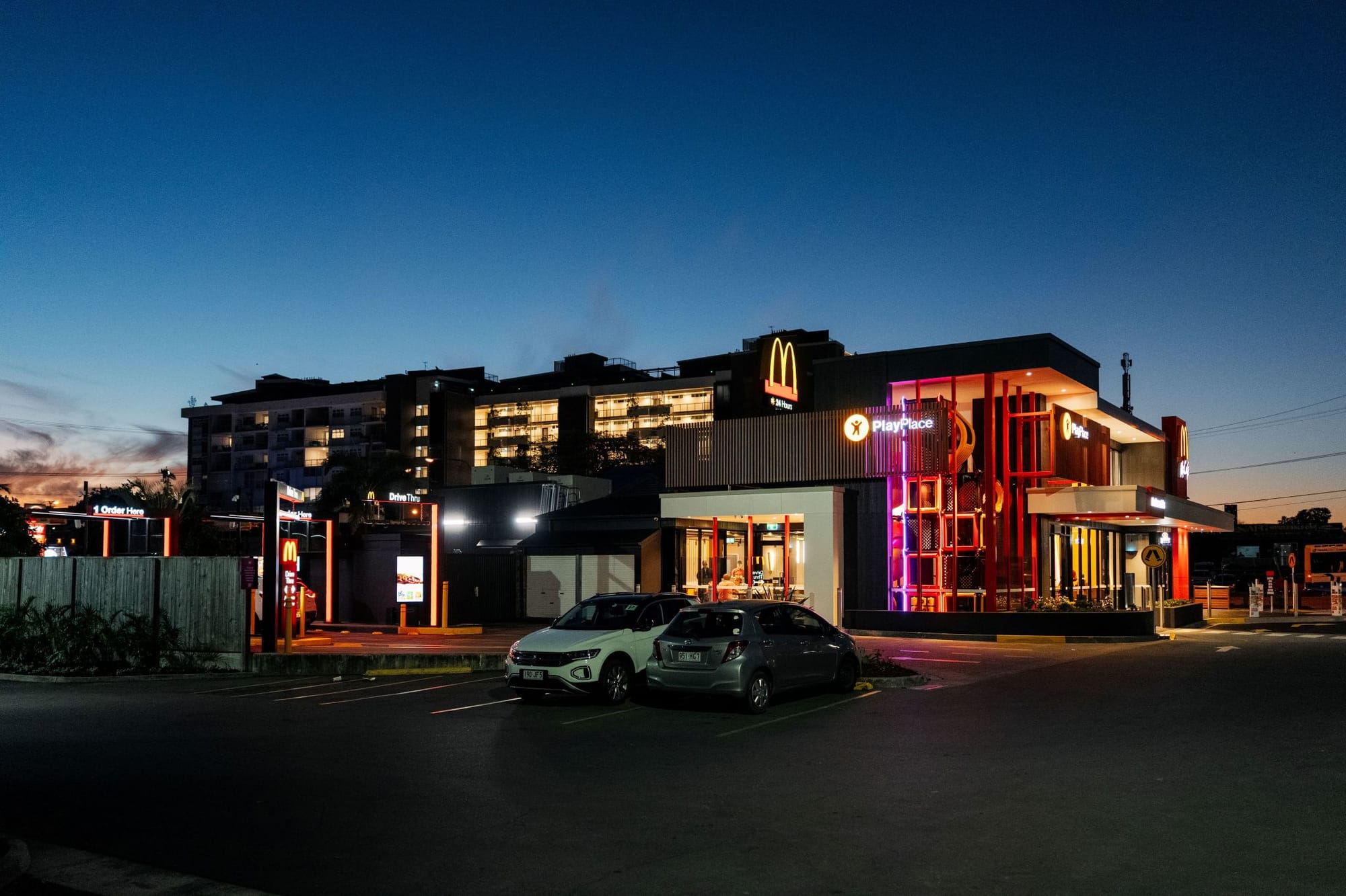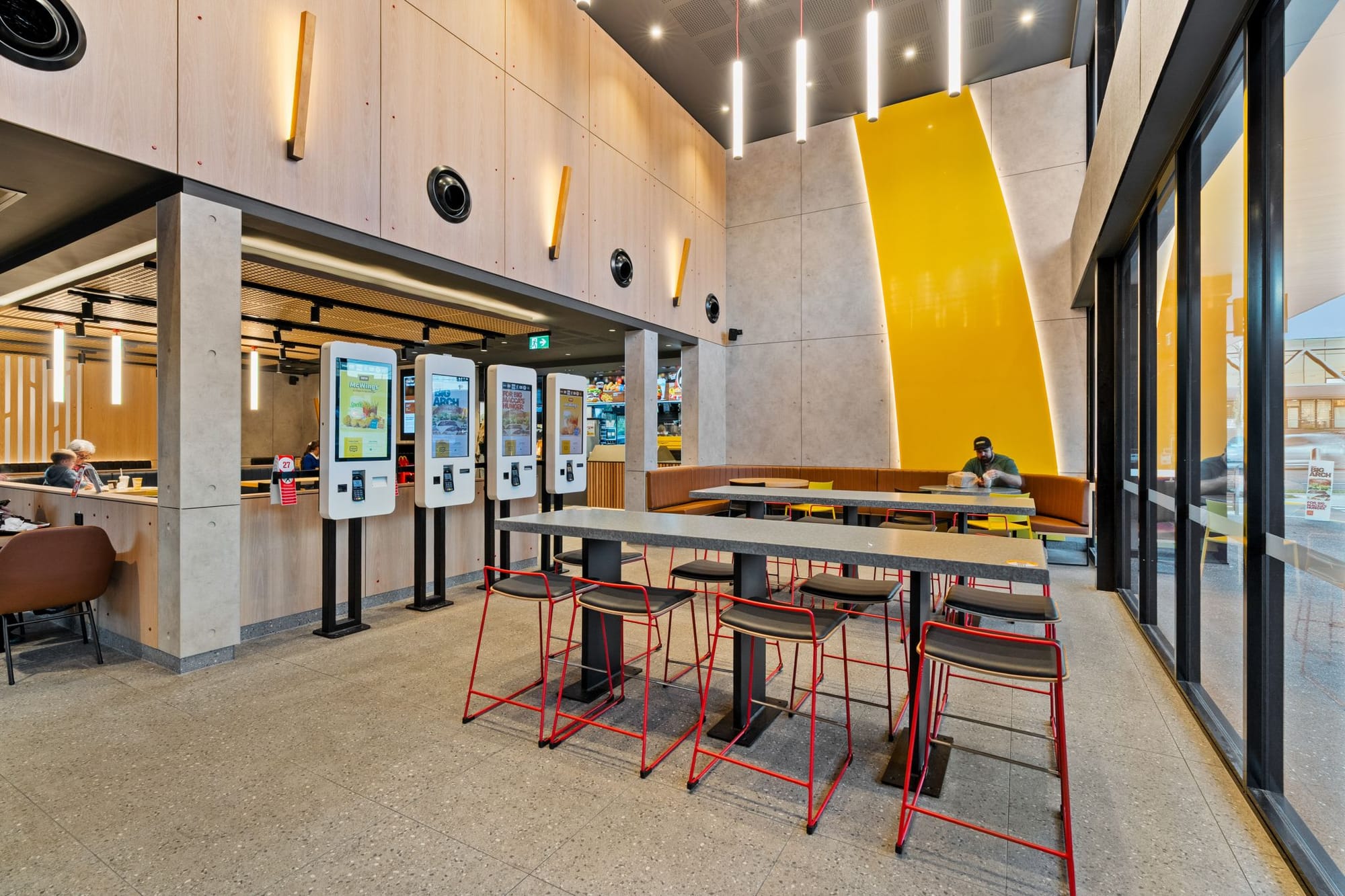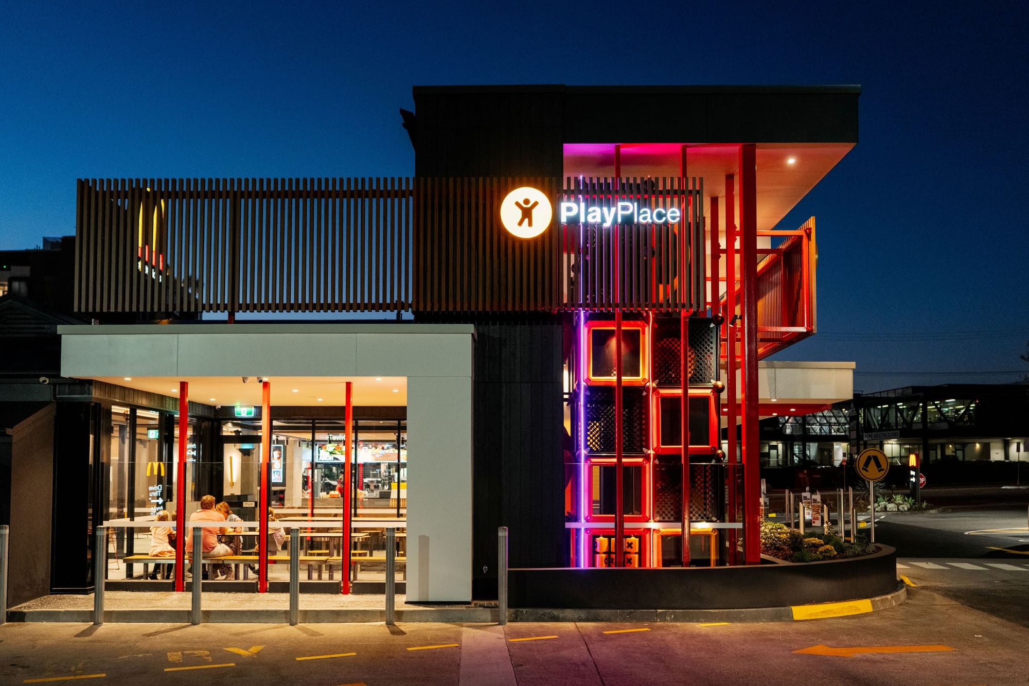 McDonald’s применил «архитектурный маяк» — интегрировав детскую игровую зону PlayPlace в общий фасад нового ресторана в Австралии. Она вынесена в отдельный вертикальный объем на углу здания — это создает акцент и добавляет динамики, одновременно выполняет роль ориентира, который виден издалека.