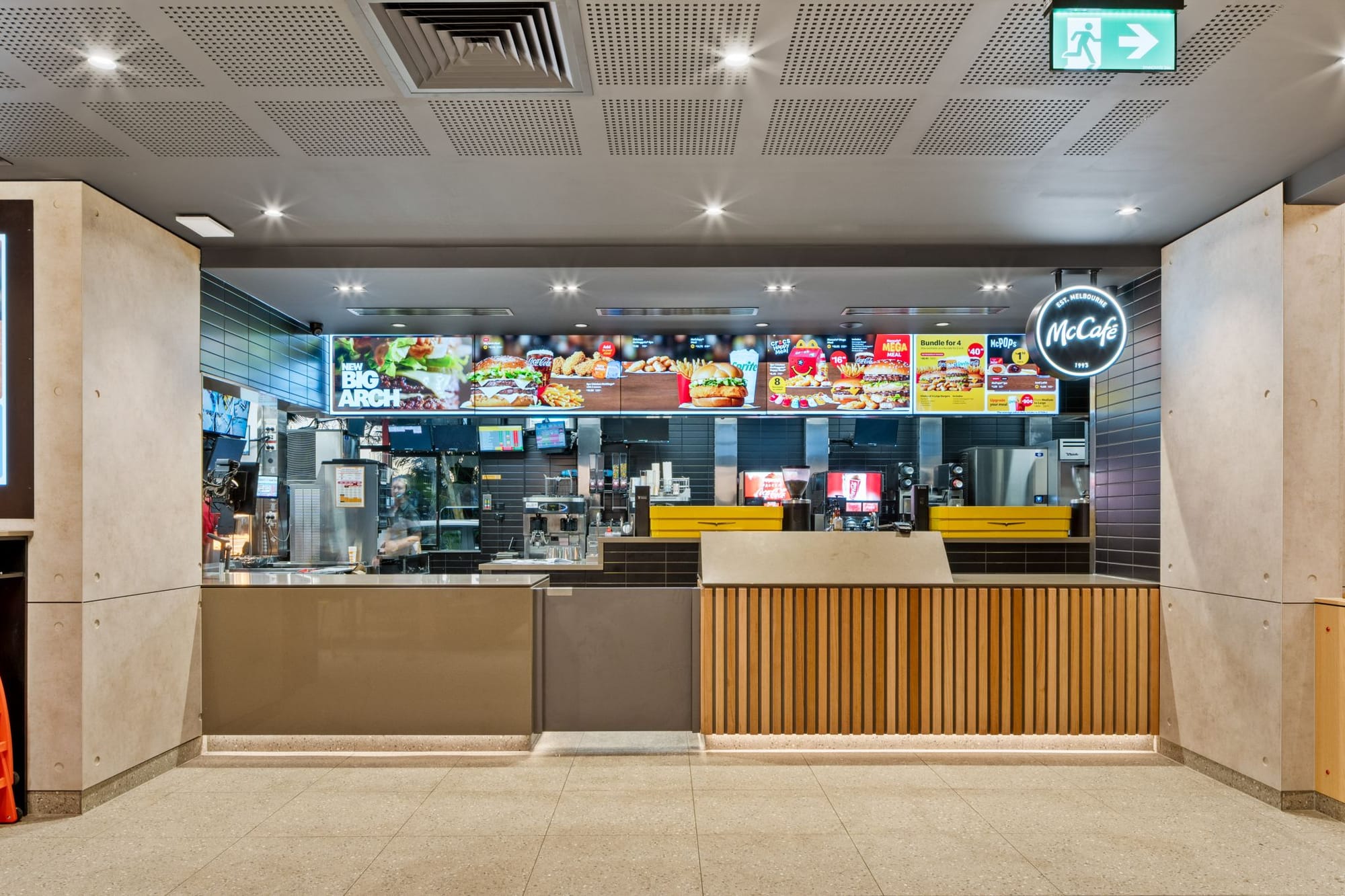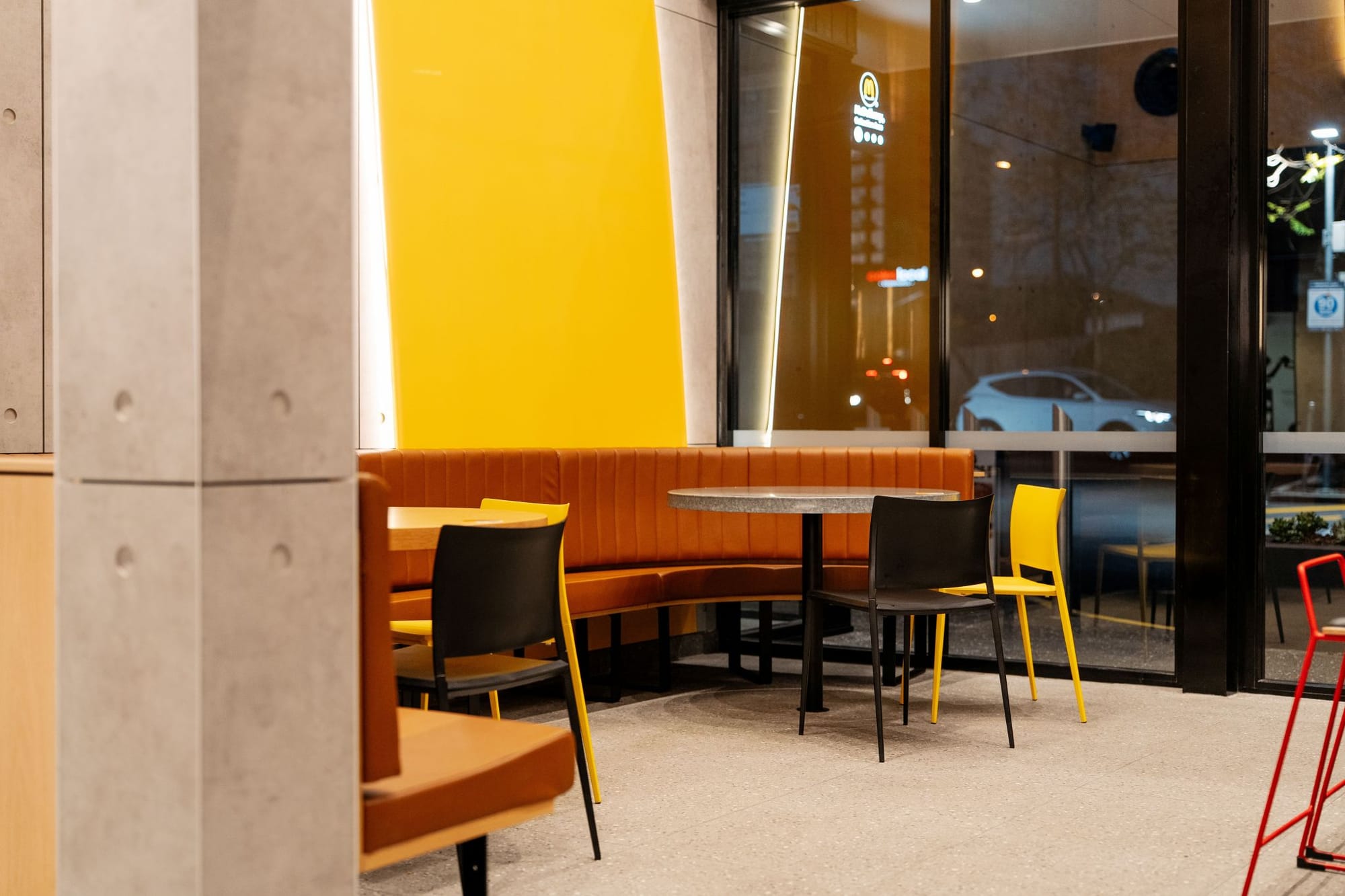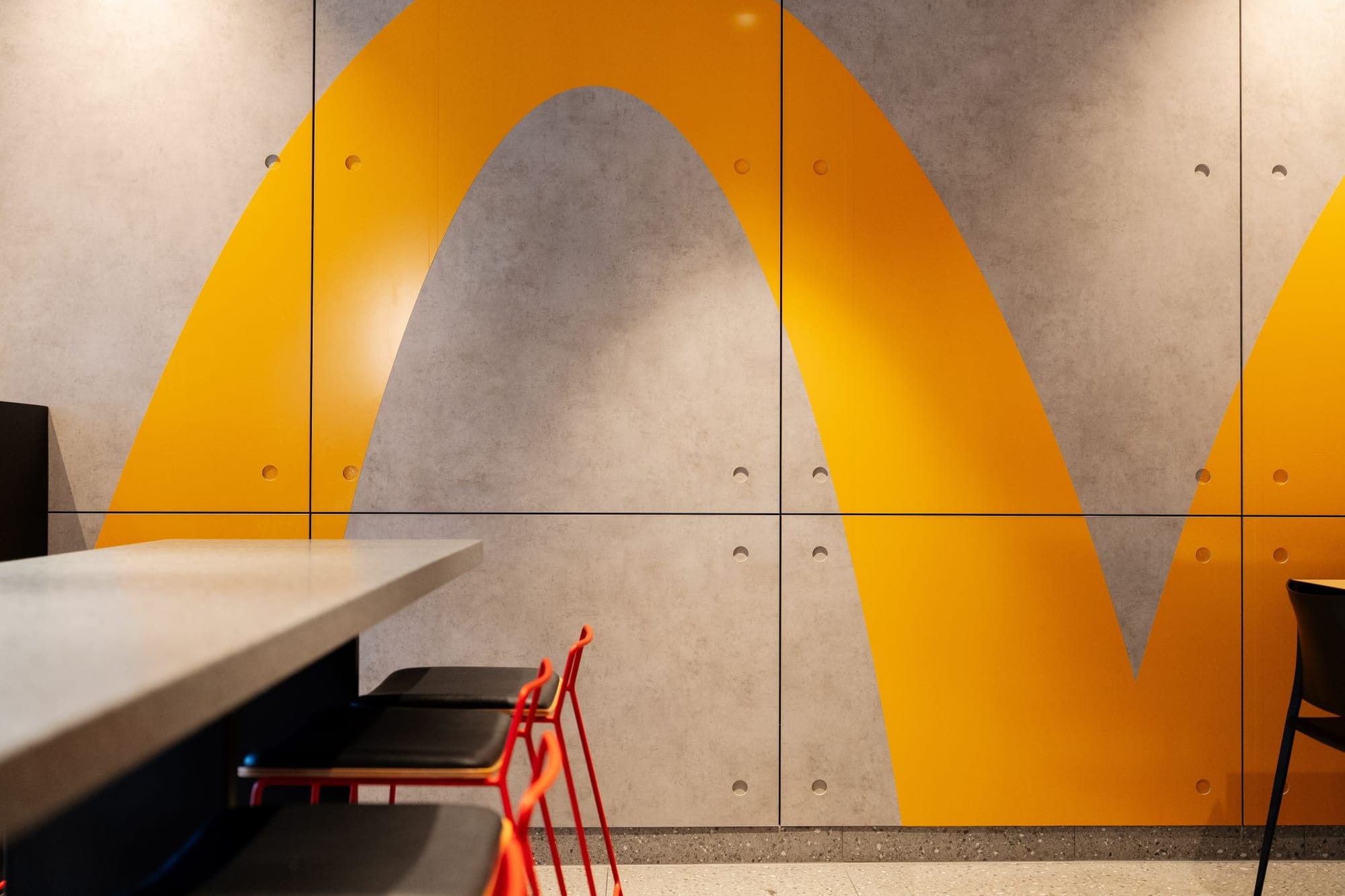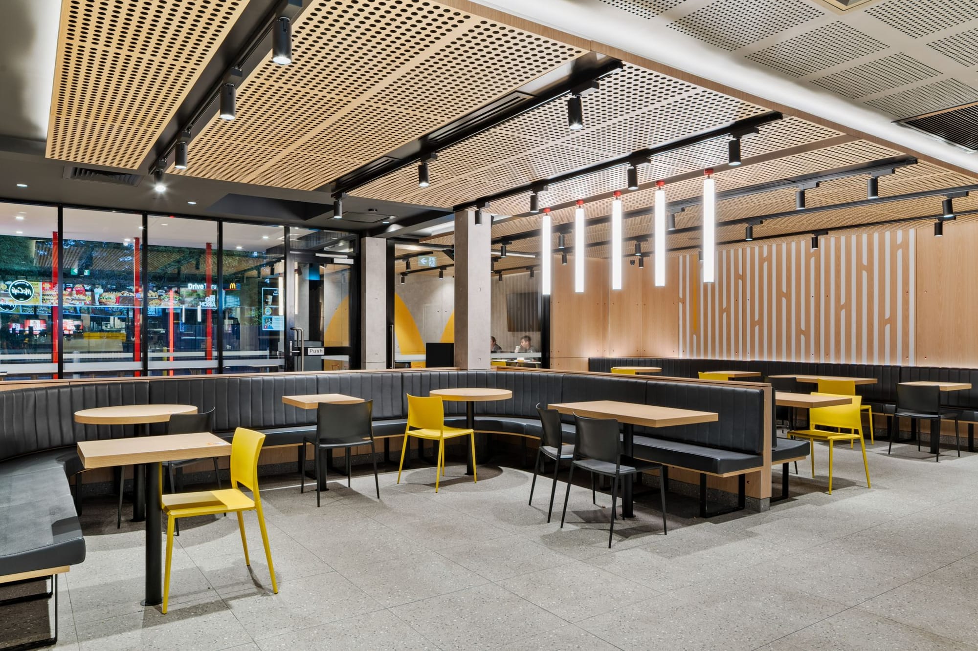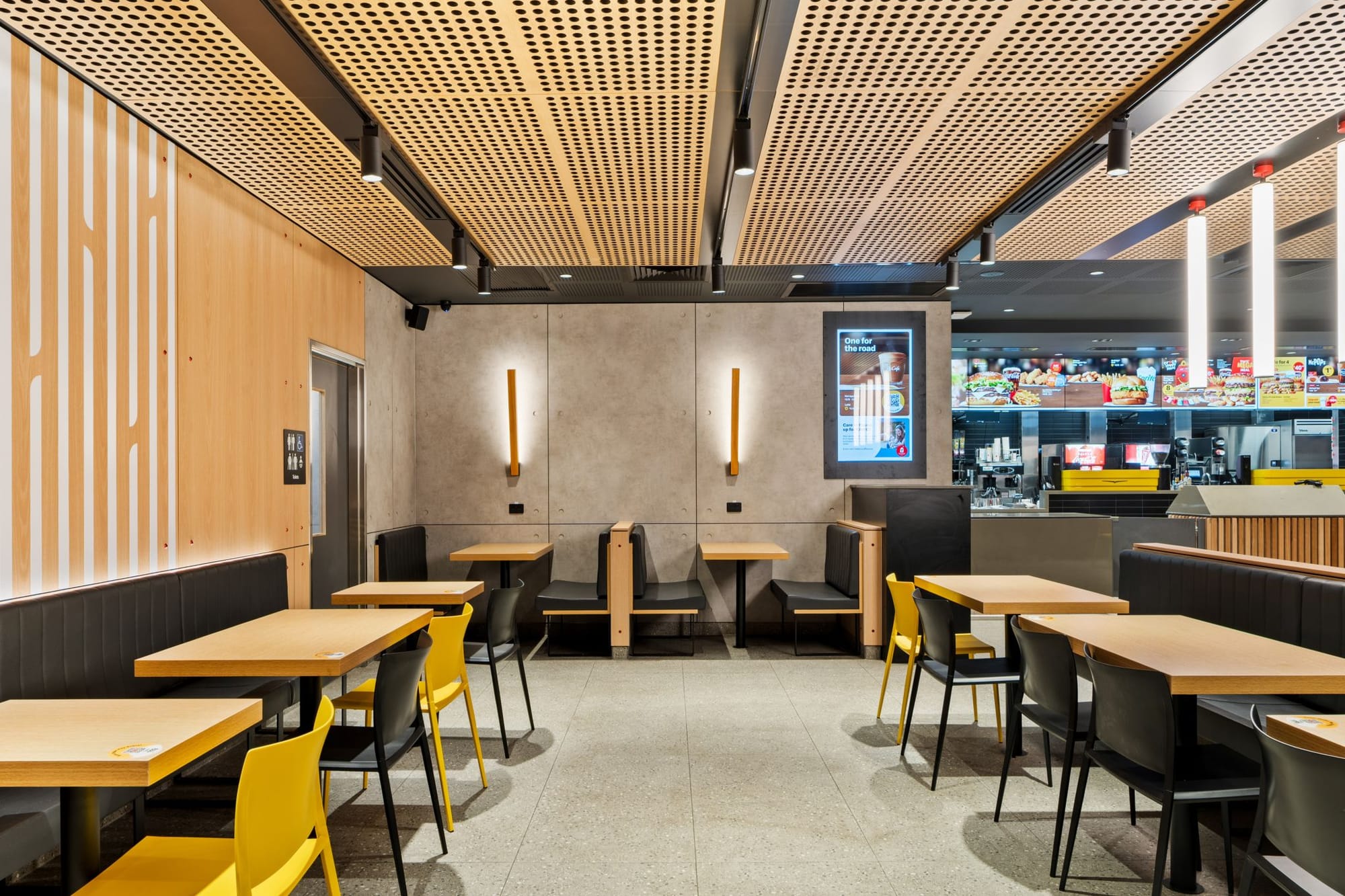 McDonald’s применил «архитектурный маяк» — интегрировав детскую игровую зону PlayPlace в общий фасад нового ресторана в Австралии. Она вынесена в отдельный вертикальный объем на углу здания — это создает акцент и добавляет динамики, одновременно выполняет роль ориентира, который виден издалека.