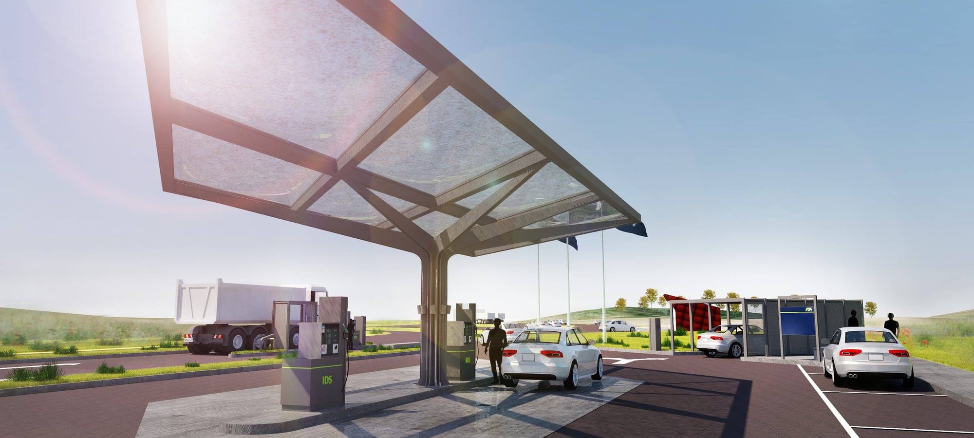 Навес является отличительным элементом станции. Подобно большому дереву в поле, он "укрывает" машины во время заправки. В течение дня естественный свет свободно проникает через крышу, выполненную из кровельной мембраны ETFE, а в темное время суток, освещение рассеивается и отражается от панелей, обеспечивая достаточную освещенность.