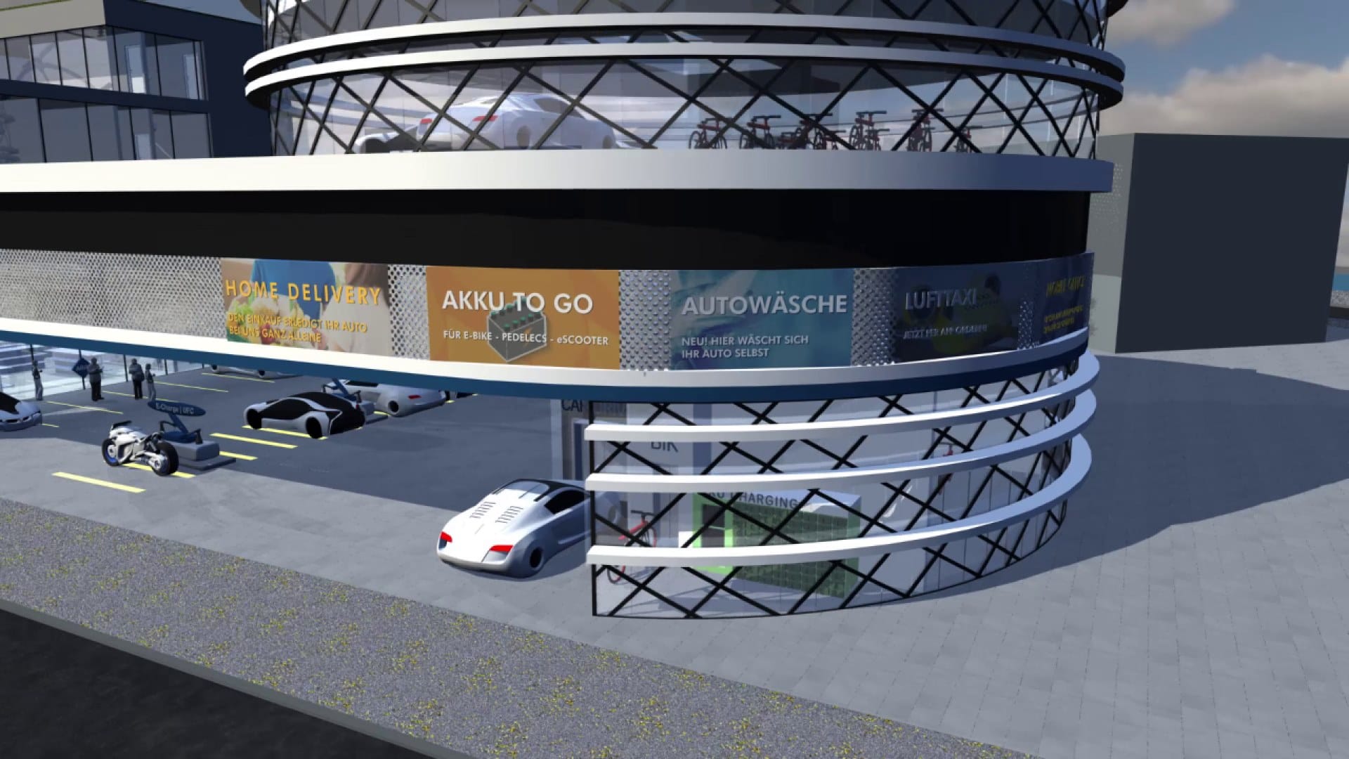 В больших городах быстрее всего меняется парк автомобилей. Ожидается, что будут преобладать электромобили и гибридные автомобили. Становится все больше двухколесных транспортных средств с электрическим приводом. Поэтому, станция объединяет в себе несколько предложений для передвижения, включая, электровелосипеды, автономные транспортные средства для совместного использования, воздушное такси. Электрические воздушные такси могут стать реальностью и использоваться для пассажирских перевозок. На станции предлагают удобное место посадки, тем более что подобные такси, скорее всего будут двигаться вдоль современных транспортных направлений. На АЗС представлены наряду с бензином и дизелем, биотопливо, СПГ, КПГ, водород, 3-4 быстрые зарядные станции. Владельцы двухколесных транспортных средств - курьеры или частные лица, могут быстро обменять аккумуляторы электровелосипедов и электроскутеров в торговых автоматах.