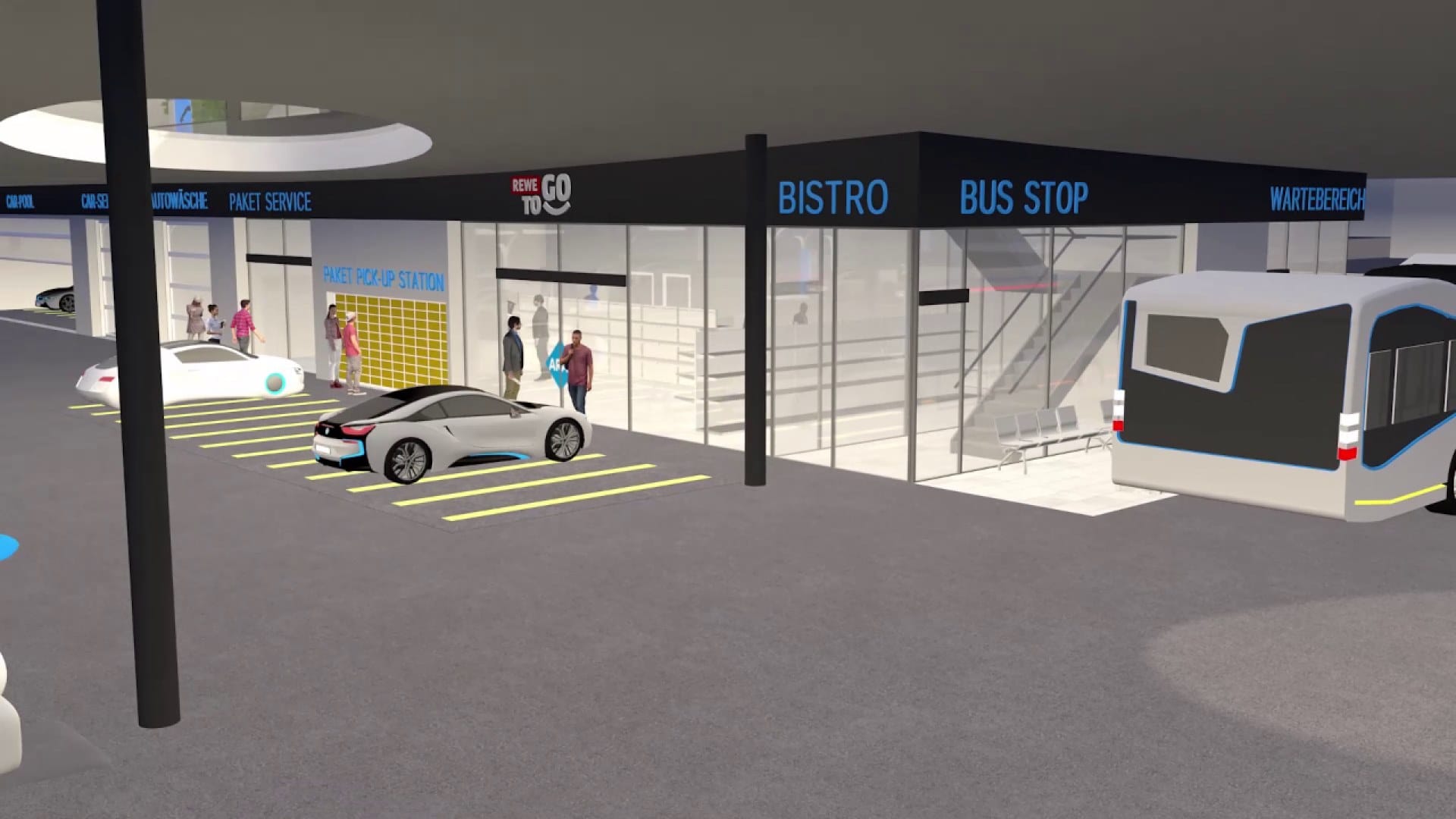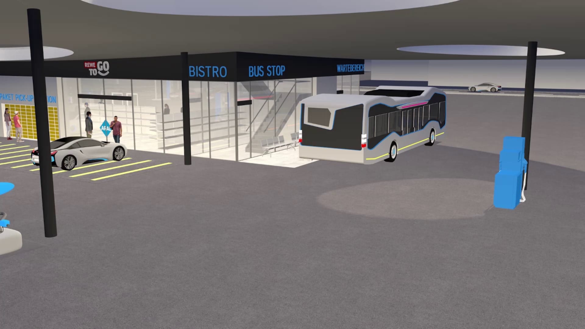 Станции могут взять на себя дополнительные функции - социальная роль, как “место встреч”, расширенное предложение магазина, пункт доставки. Новая модель обслуживания объединяет пассажирские и грузовые перевозки для отдаленных мест. Сверхбыстрые зарядные станции доступны для клиентов, но их немного, так как в основном электротранспорт заряжается в домашних условиях.