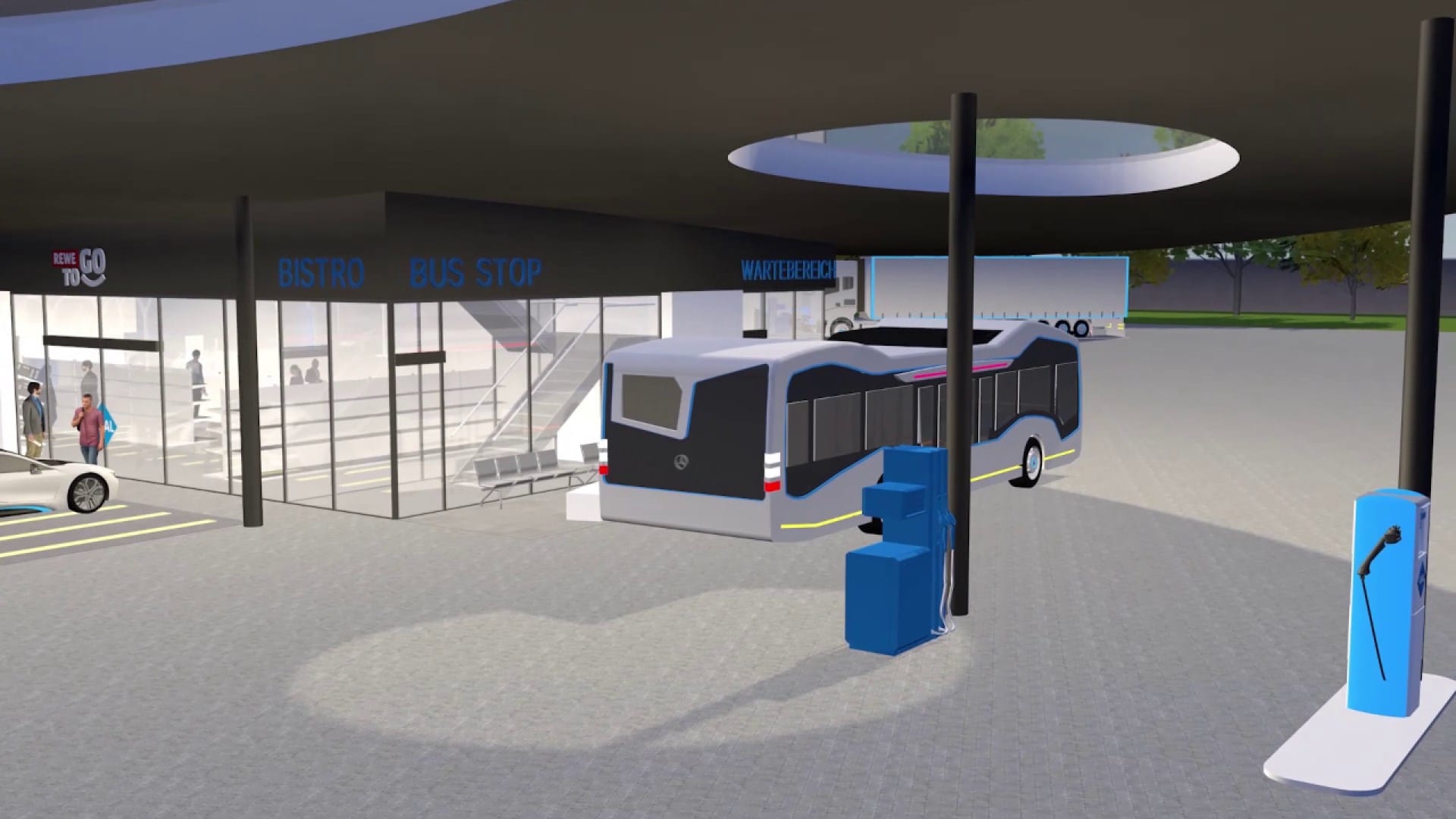 Трассовые станции заслуживают более пристального внимания, так как могут существенно измениться по сравнению с сегодняшним днем. Они становятся центрами передвижения по автомагистралям - местами остановки и пересадки для частных и профессиональных водителей, путешественников. Именно здесь могут появиться предложения и услуги в совершенно новых направлениях, прежде всего связанных с грузовыми и междугородними перевозками. Автономный трансфер доставляет профессиональных водителей на трассовые станции, а также пассажиров и туристов для пересадки на автобусы дальнего следования. Помимо бензина и дизеля на станциях доступны СПГ, КПГ, водород. Кроме того, на станциях предусмотрена сверхбыстрая зарядка как для легковых электромобилей, так и грузовых грузоподъемностью до 3,5 тонн, а также автобусов.