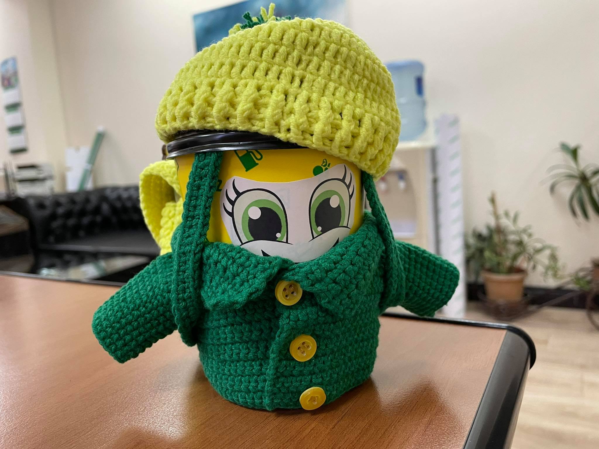 Специально для поездки стаканчику изготовили одежду в фирменных цветах компании. Все, как и положено настоящим путешественникам – куртка, теплая шапочка и рюкзачок, внутри которого талоны на топливо.