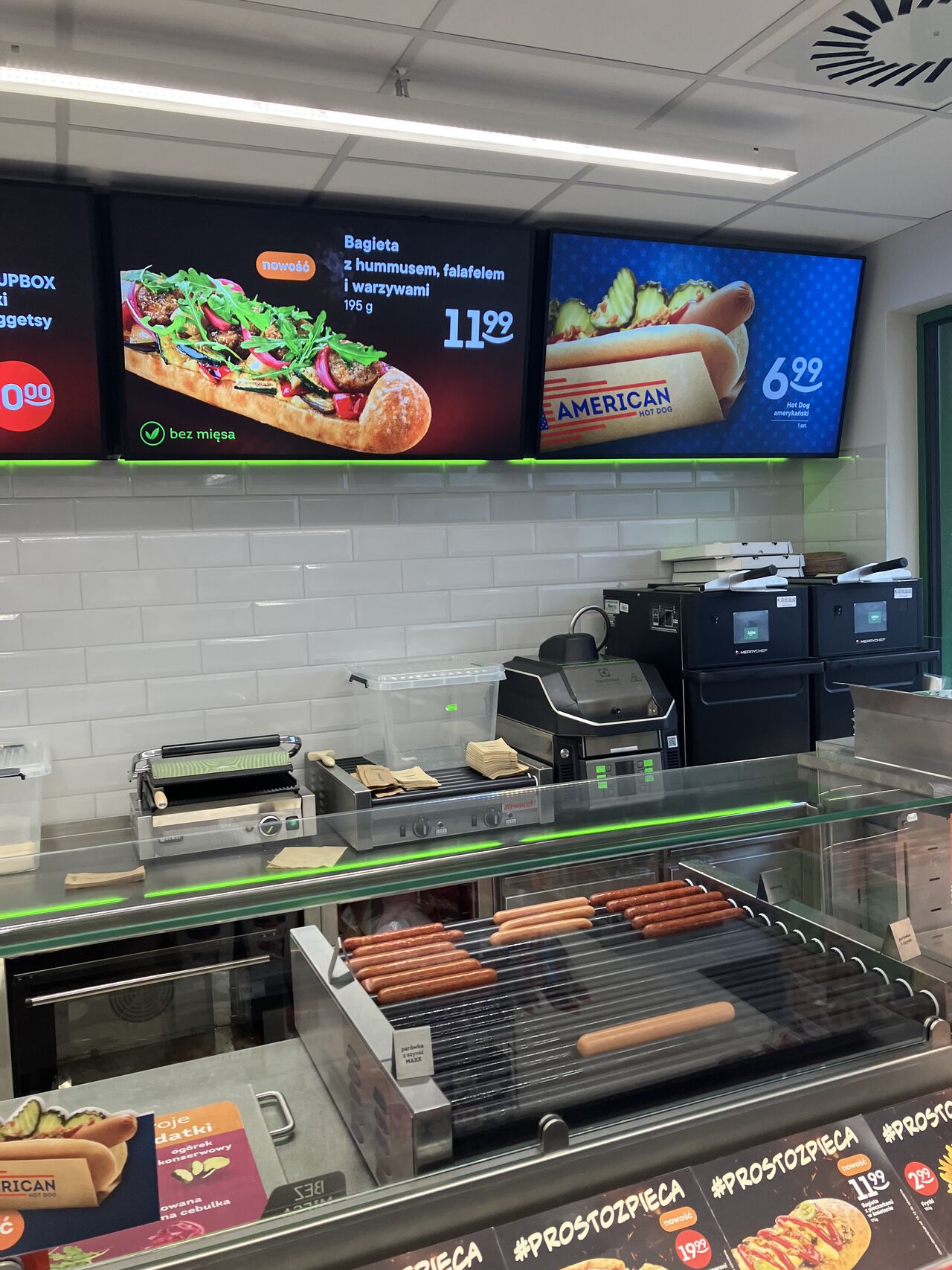 «Кухонная зона» магазина Żabka составляет около 8 м2. Основная часть ассортимента была приготовлена на центральной кухне до того, как она была упакована. Кассир одновременно является поваром.