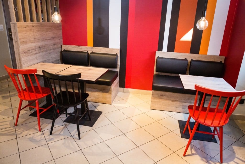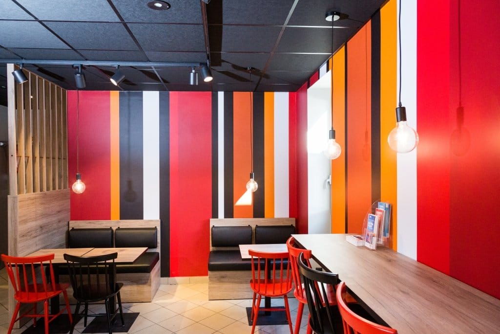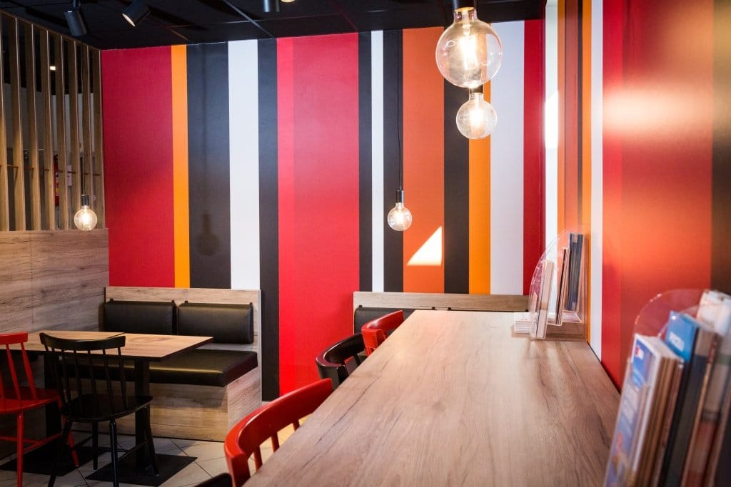 Проект совместно разработан норвежским дизайнером Ниной Кристоферсон и сотрудниками Circle K. В интерьере доминирует черный цвет, дополненный пепельным и темным кирпичом. Красные, белые и оранжевые полосы на стенах соответствуют корпоративным цветам. Для освещения используются подвесные светодиодные светильники в форме колес с теплым светом. Зона отдыха оборудована удобными диванами и стульями.