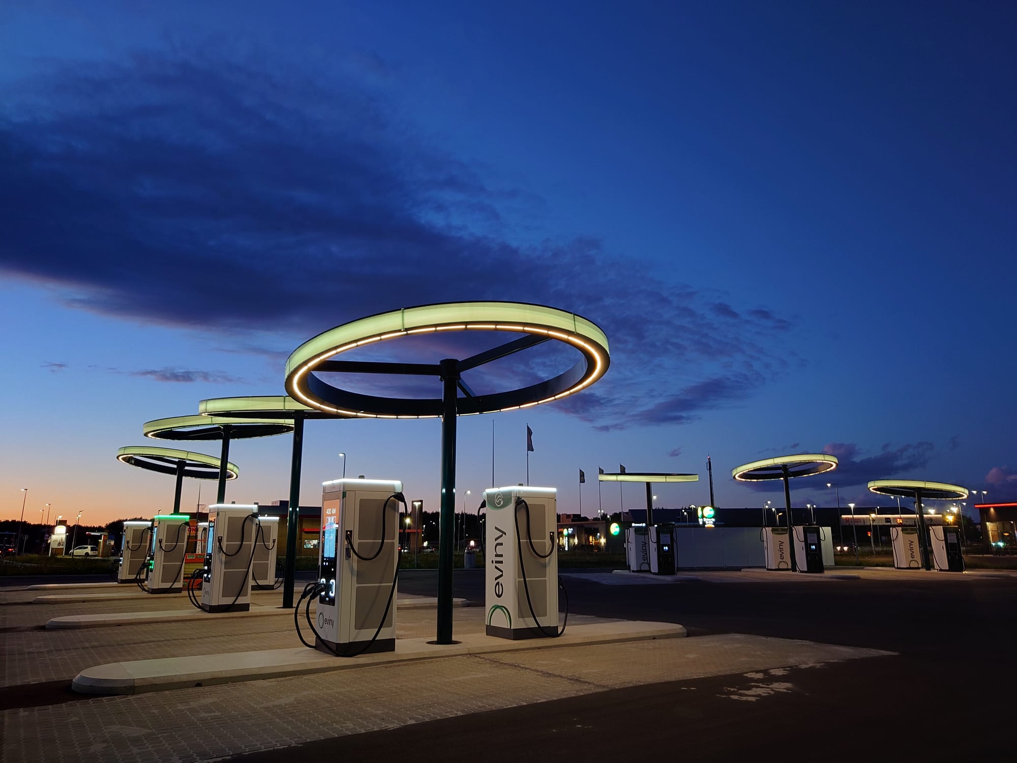 - Крупнейшие станции скоростной зарядки Eviny в настоящее время: Drejebænken в Оденсе (28 разъёмов скоростной зарядки), Holbæk Centrum и Havn (12 разъёмов), Frihedens Butikscenter в Видовре (12 разъёмов) и Kronen в Ванлёсе (10 разъёмов).