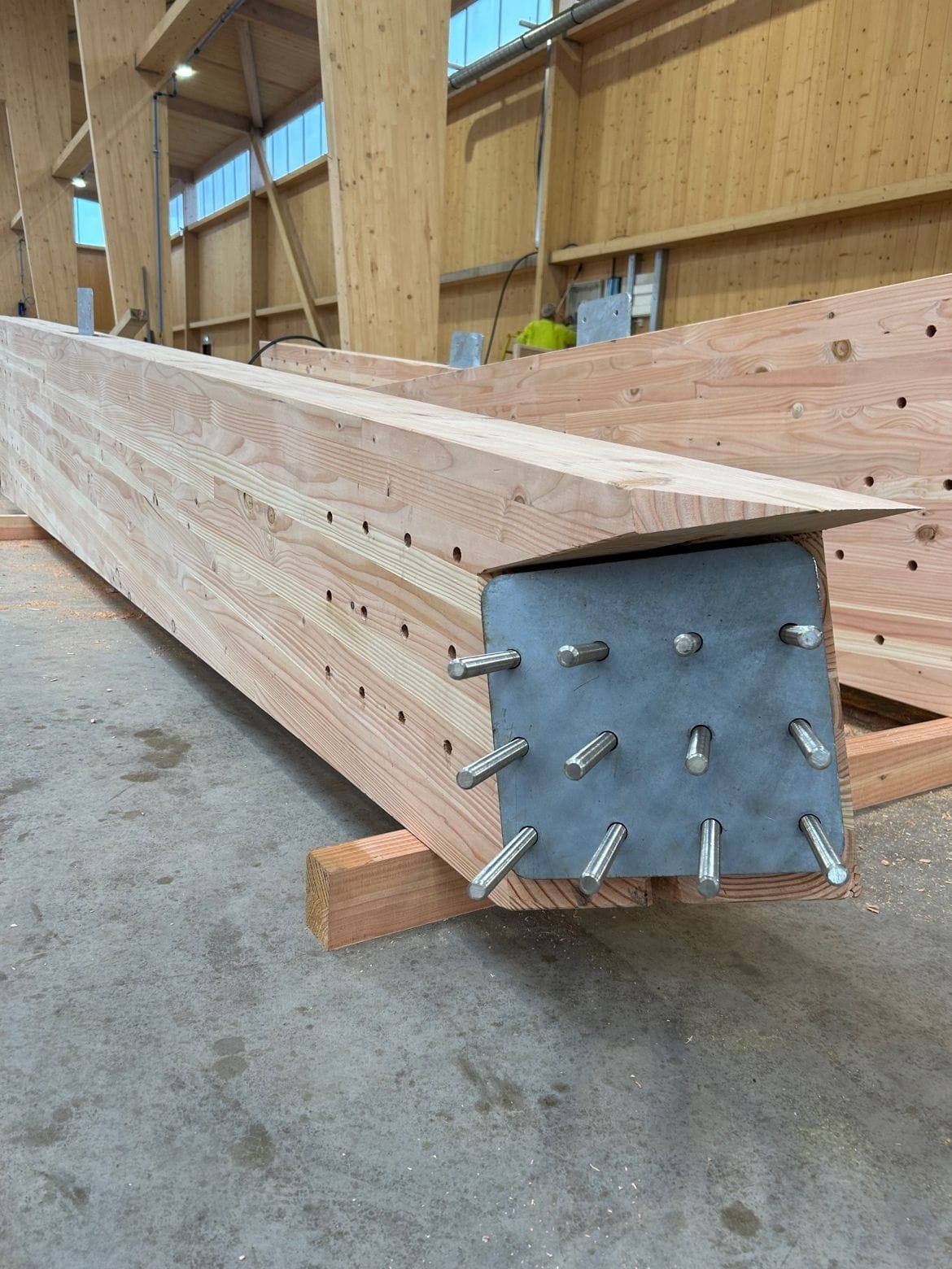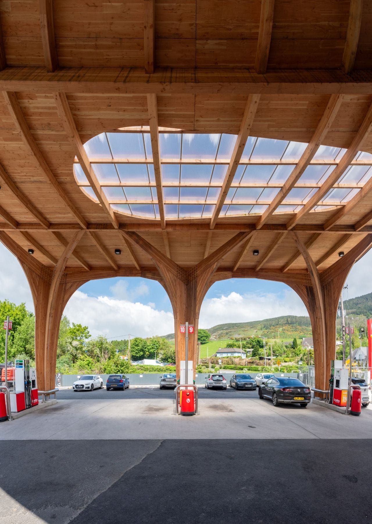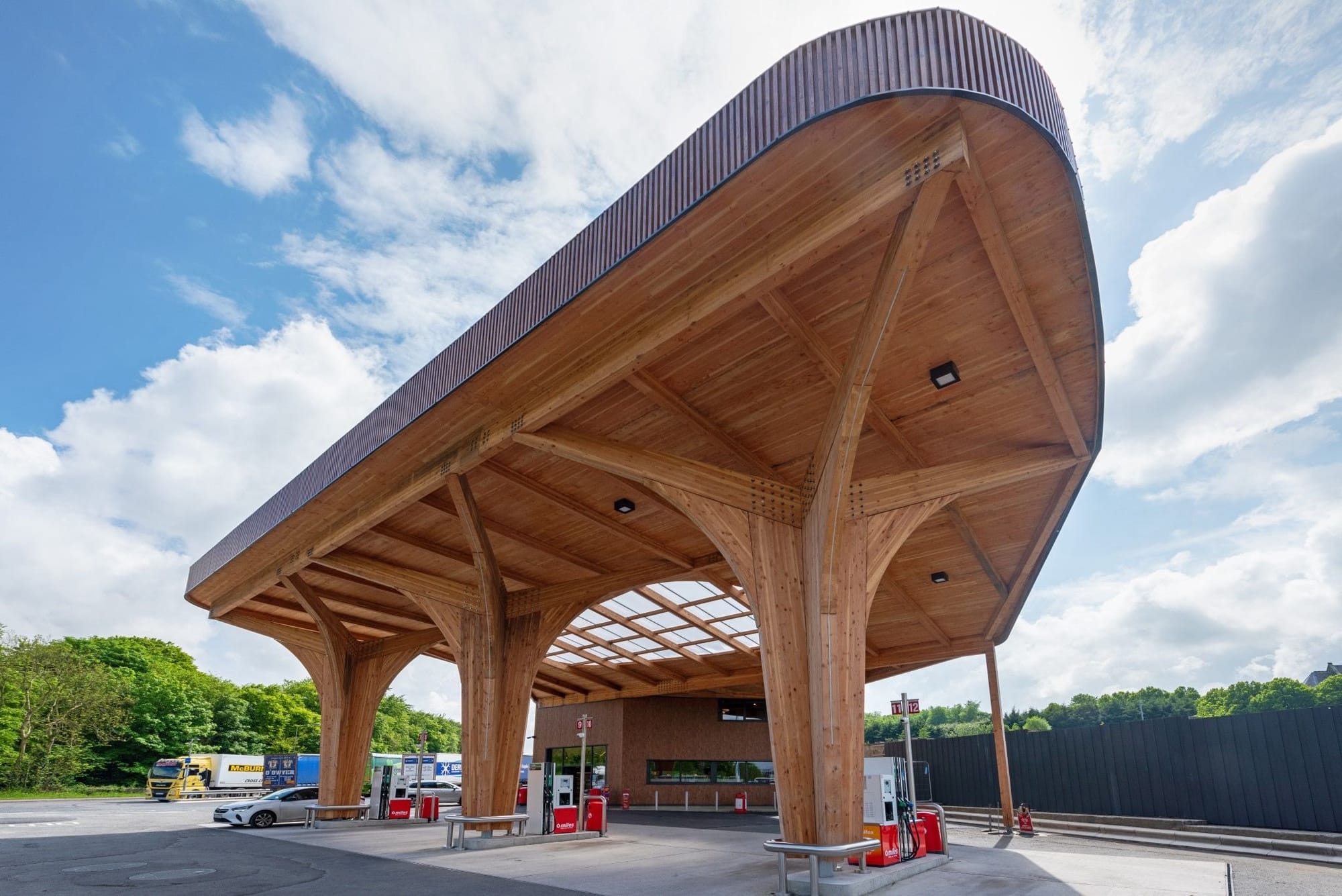 Навес над топливными колонками изготовлен из древесины дугласовой пихты, полученной из устойчивых источников. Поддерживающие конструкции выполнены из клееного бруса, который является более устойчивой и экологичной альтернативой традиционным стальным каркасам. Настил крыши из перекрестно-клееной древесины (CLT) частично покрыт поликарбонатом, что обеспечивает отличную освещенность и долговечность всей конструкции.