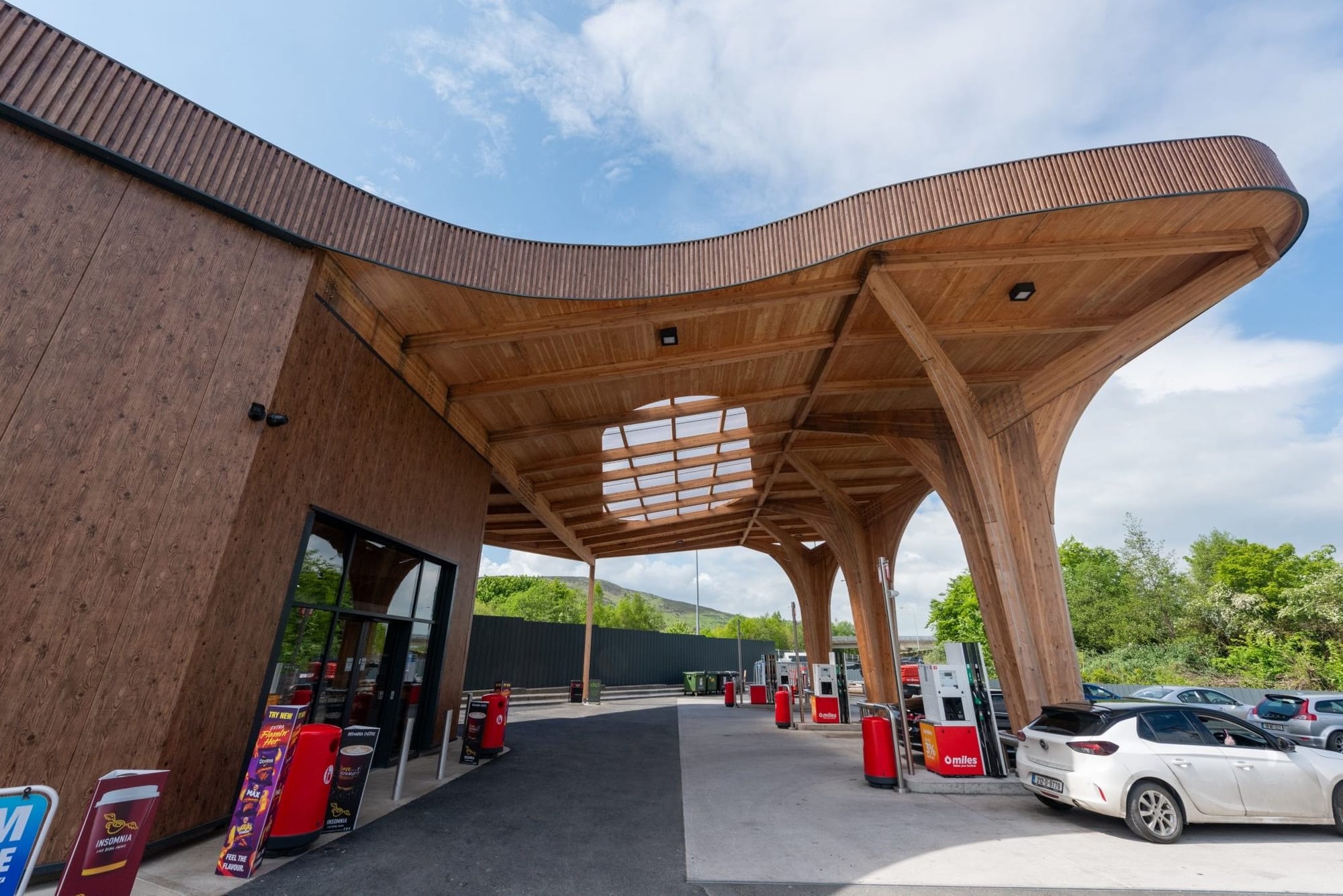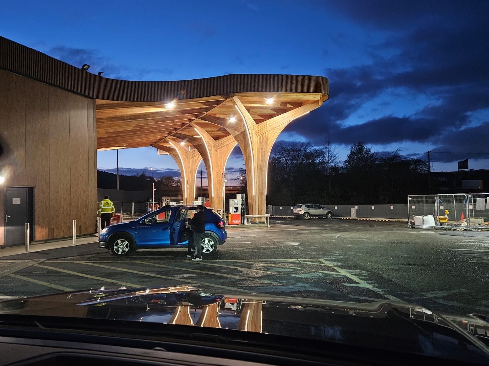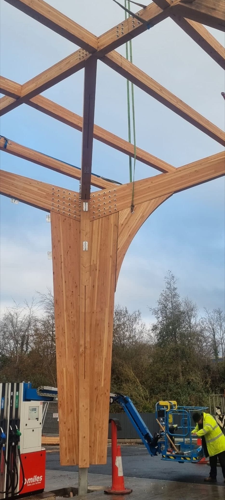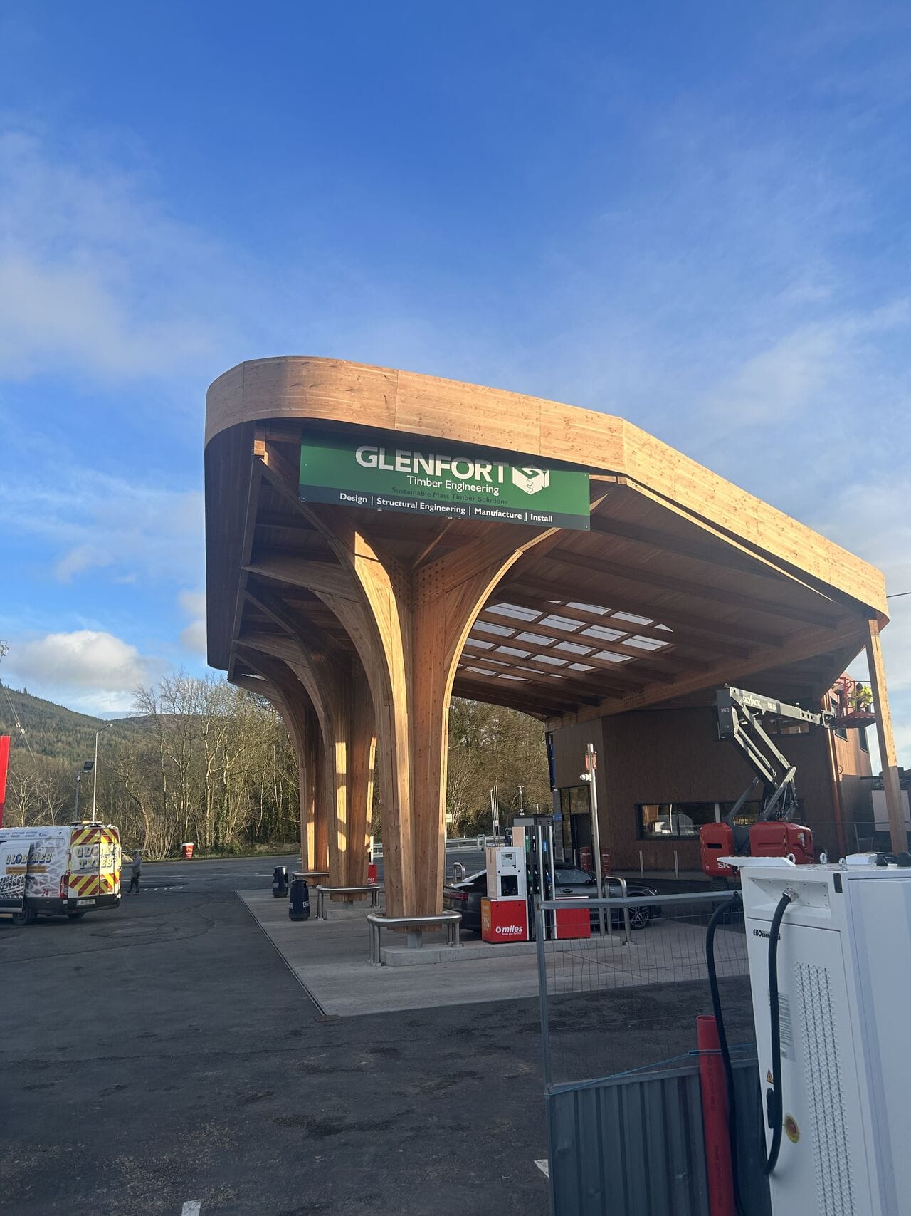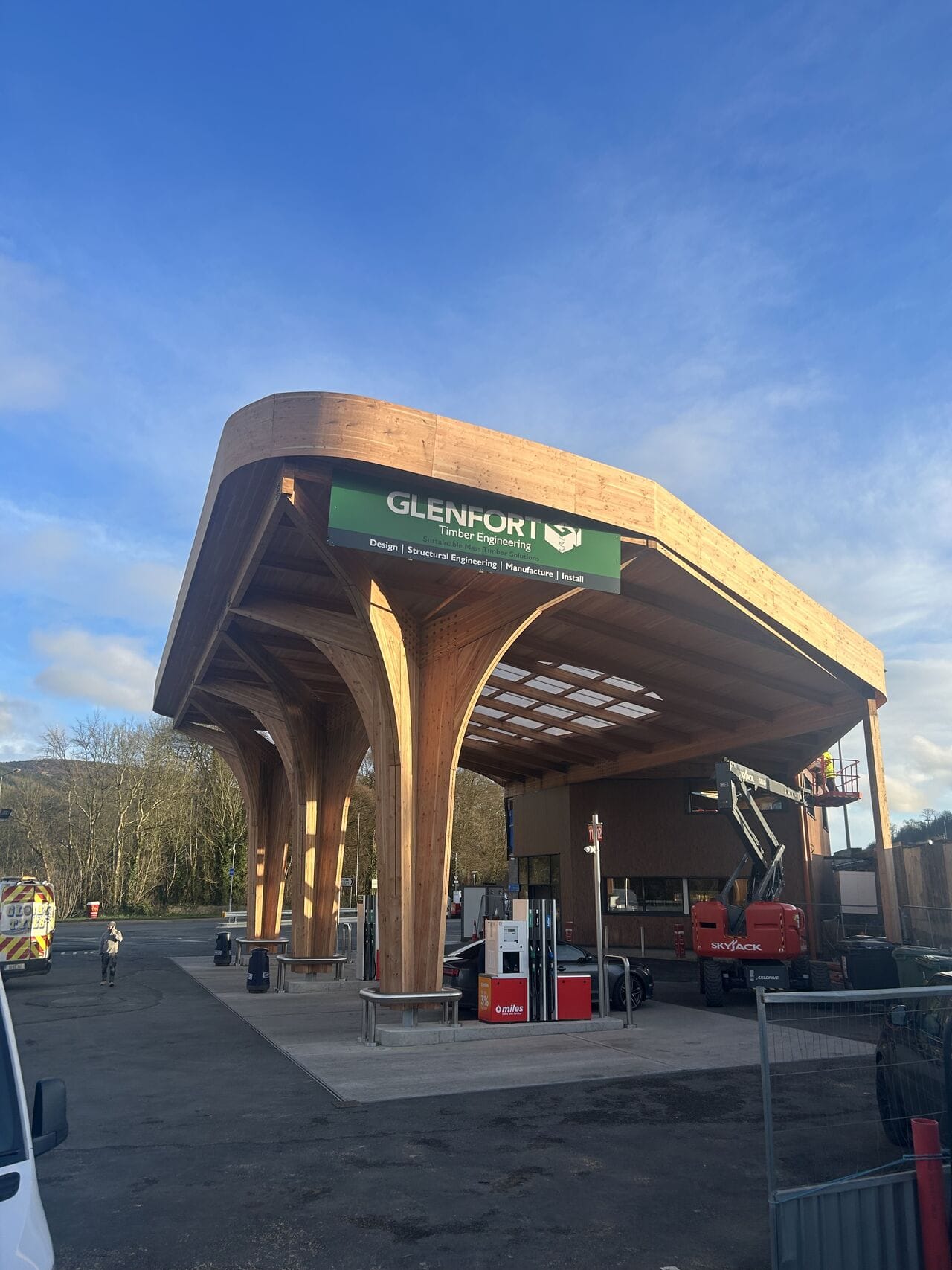 Уникальный проект реализован на трассе M1 в Великобритании – новый деревянный навес для автозаправочной станции Circle K, разработанный, спроектированный и изготовленный компанией Glenfort Timber Engineering.