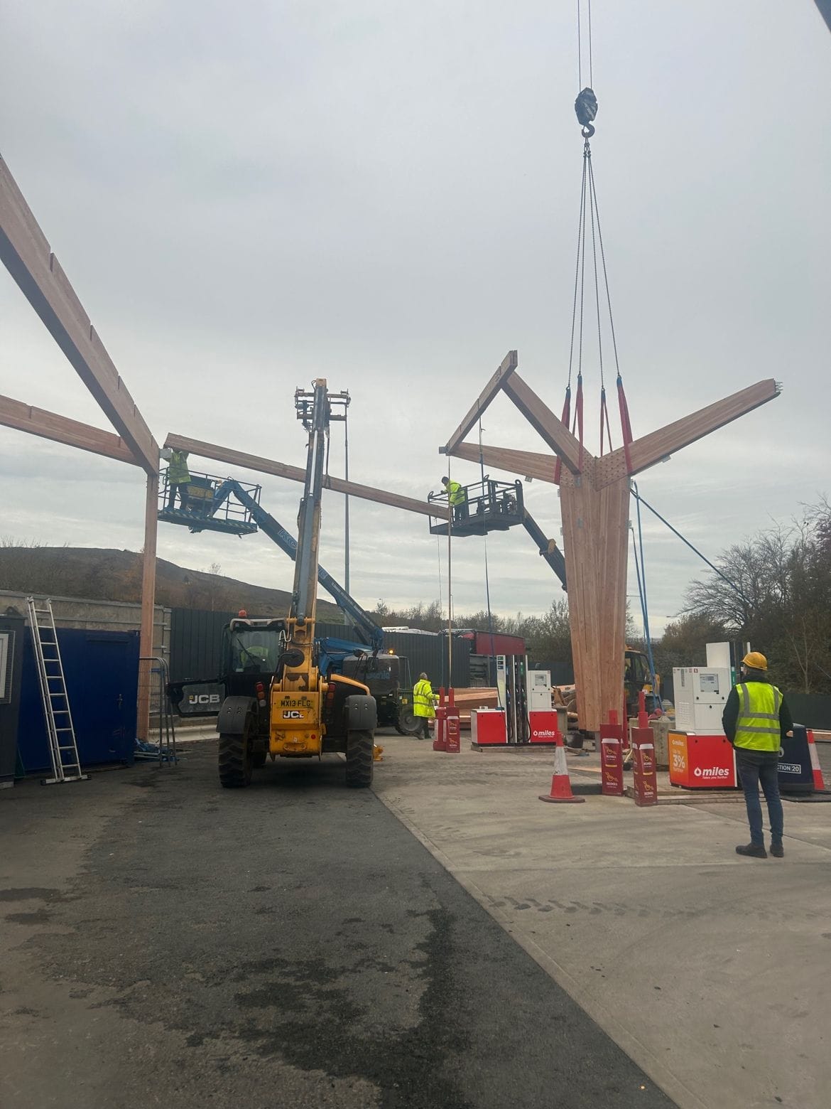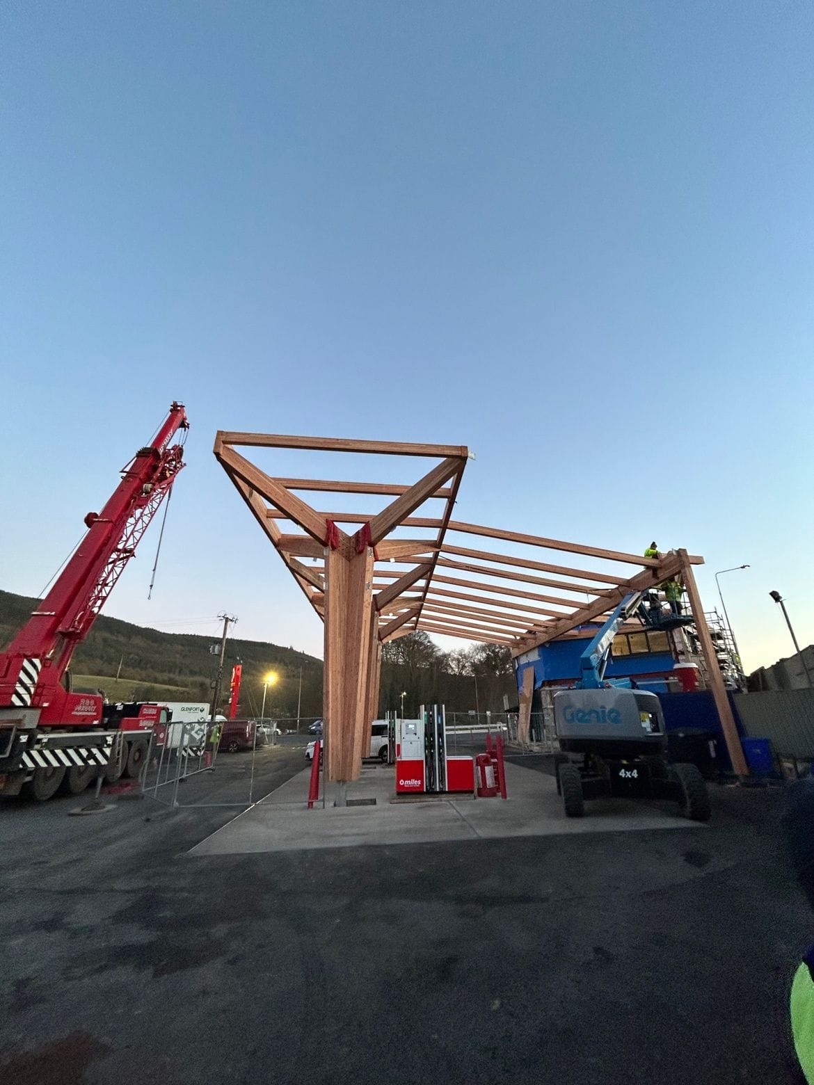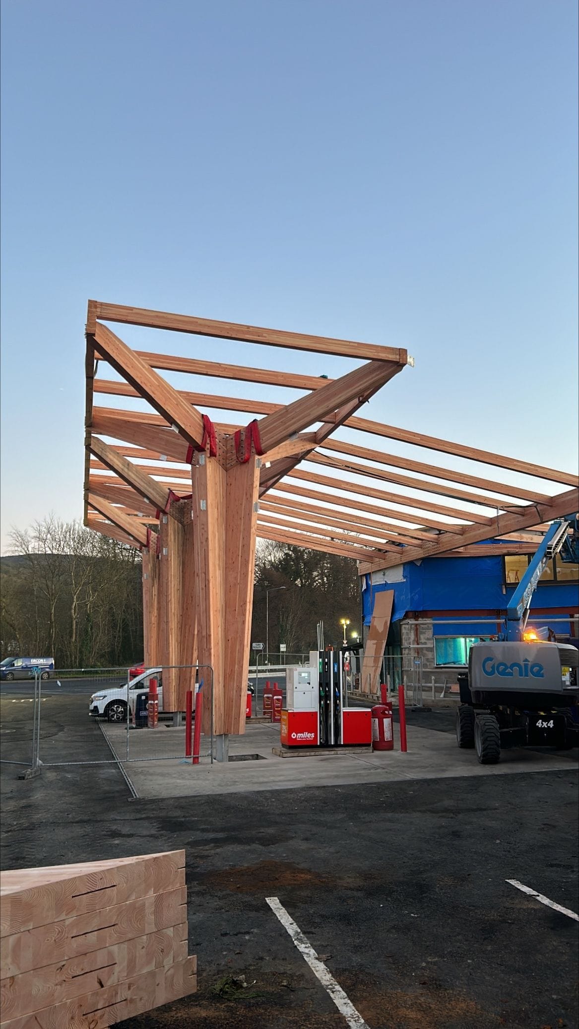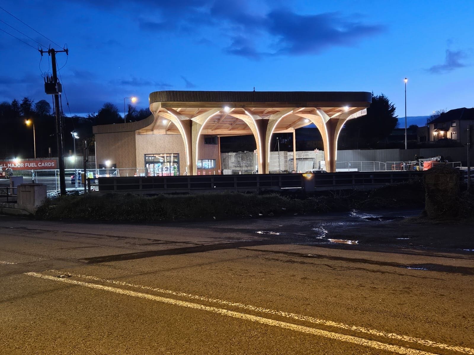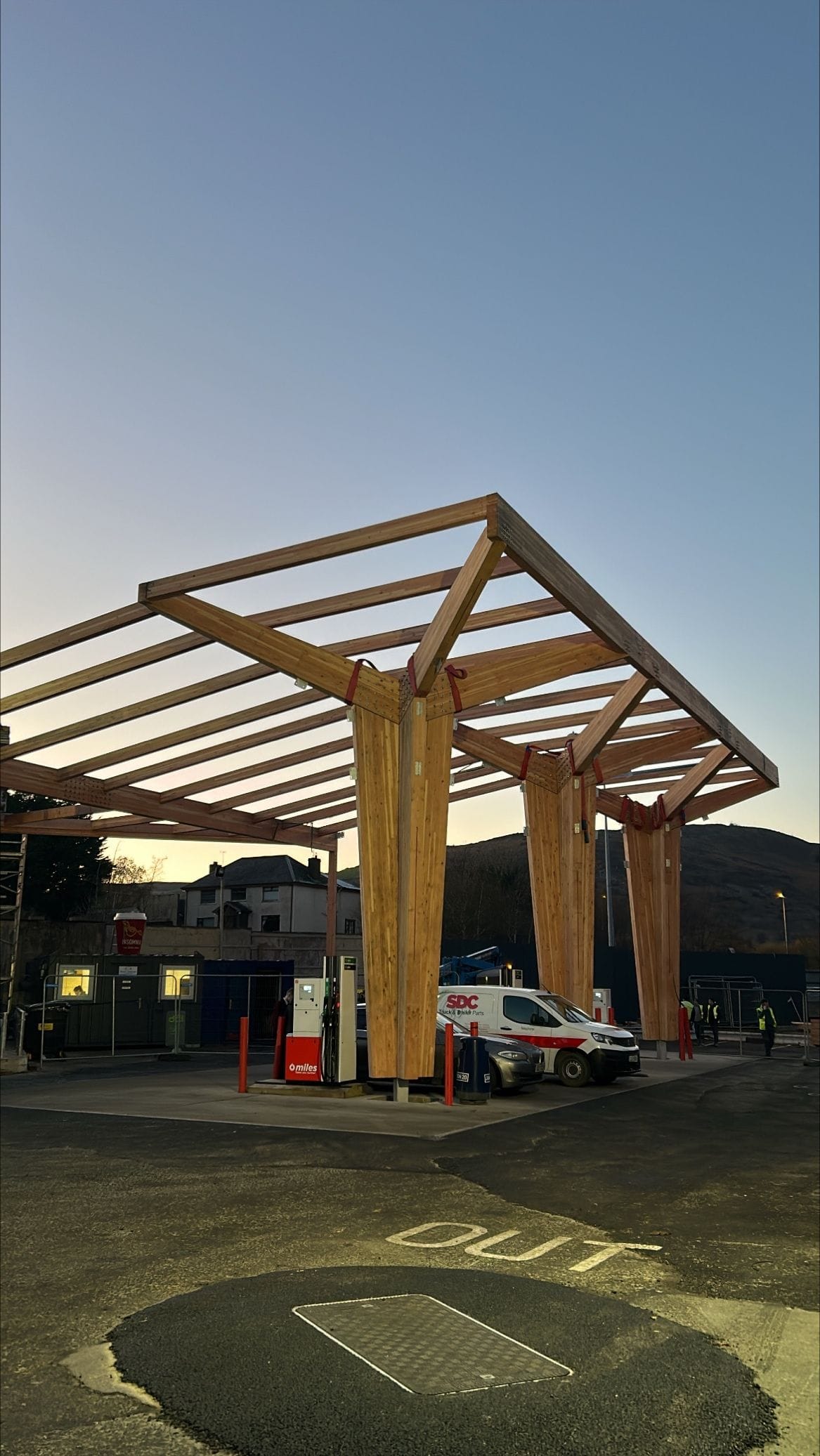 Уникальный проект реализован на трассе M1 в Великобритании – новый деревянный навес для автозаправочной станции Circle K, разработанный, спроектированный и изготовленный компанией Glenfort Timber Engineering.