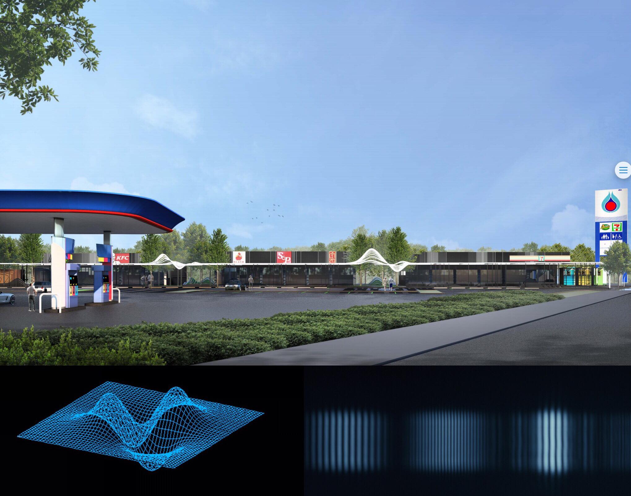 Проект реализован студией Openbox Architects в 2017 году на АЗС в Бангкоке. Локальная идентичность выделяет станцию среди множества традиционных заправок. Удивительная атмосфера и аура созданного пространства, яркая непохожесть делает ее запоминающейся и привлекательной для клиентов.