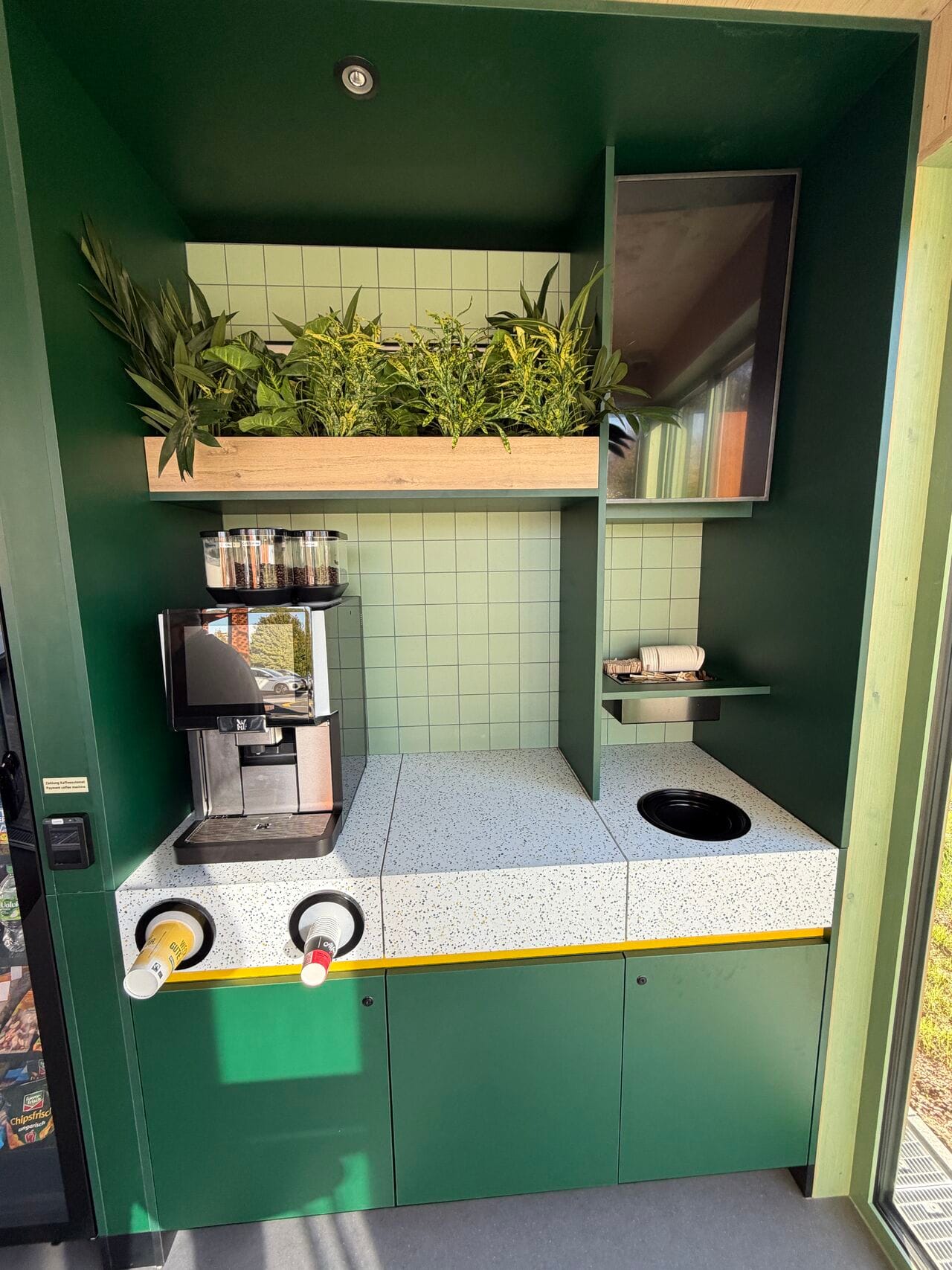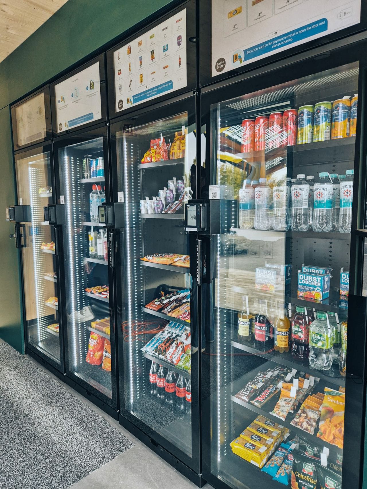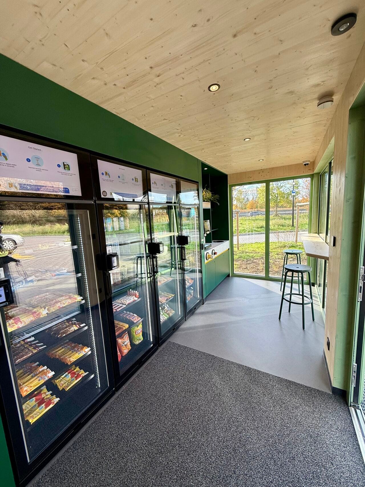 Внутри реализована модель полного самообслуживания: кофейное оборудование, вендинговые холодильники, автоматы со снеками и напитками. Концепция подчёркивает подход Fastned: зарядка — это не только про автомобиль, но и про человека.