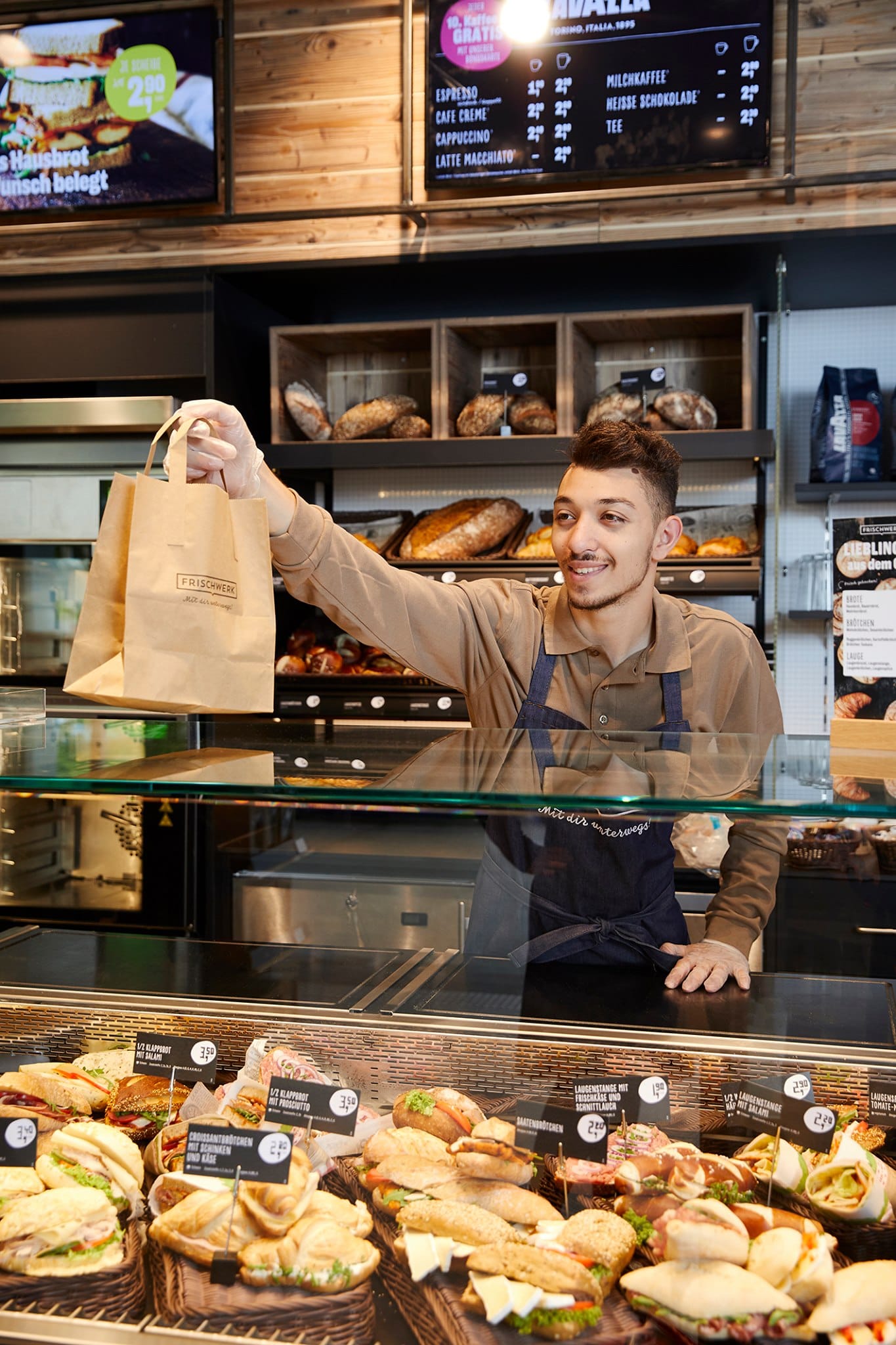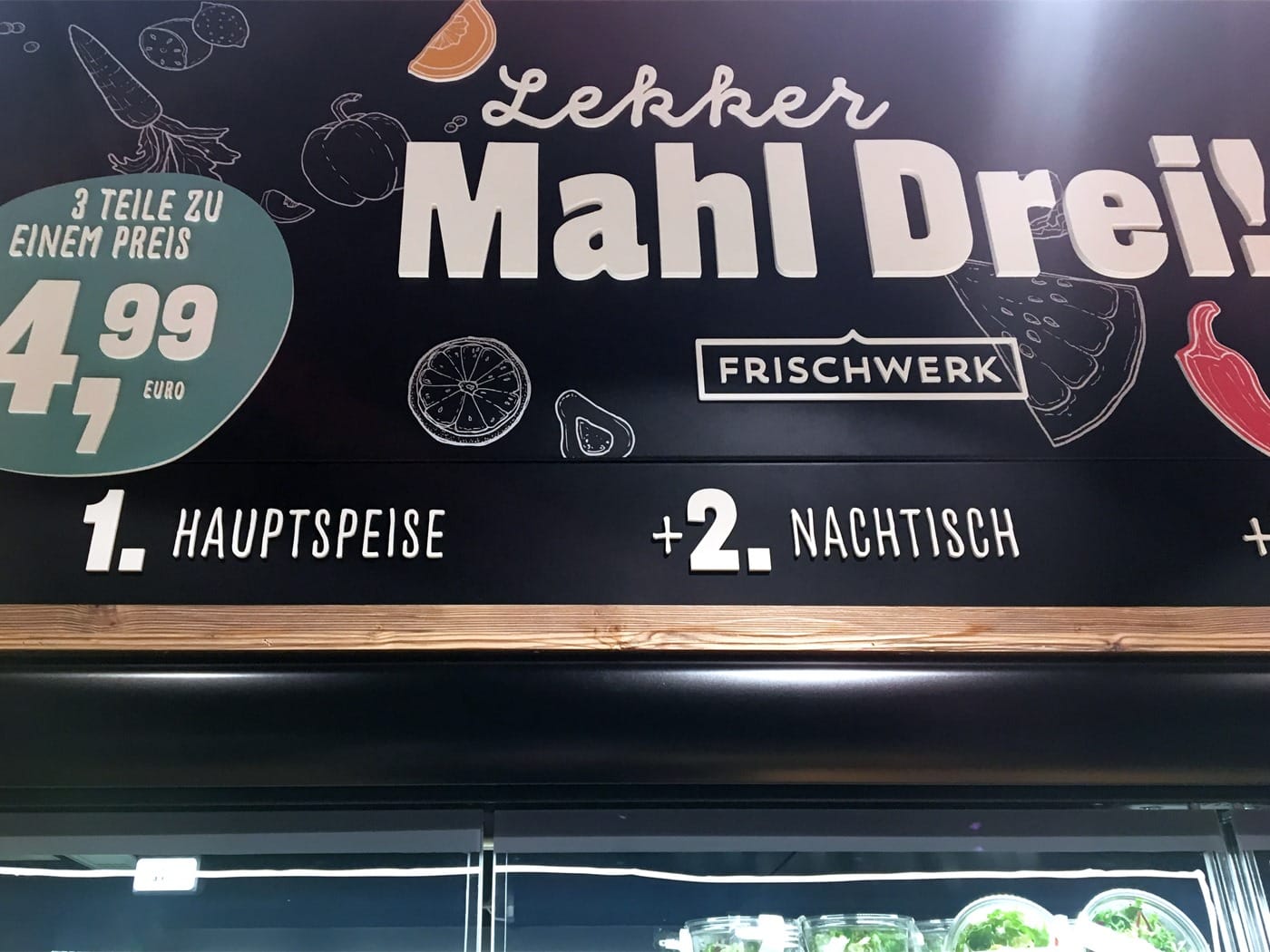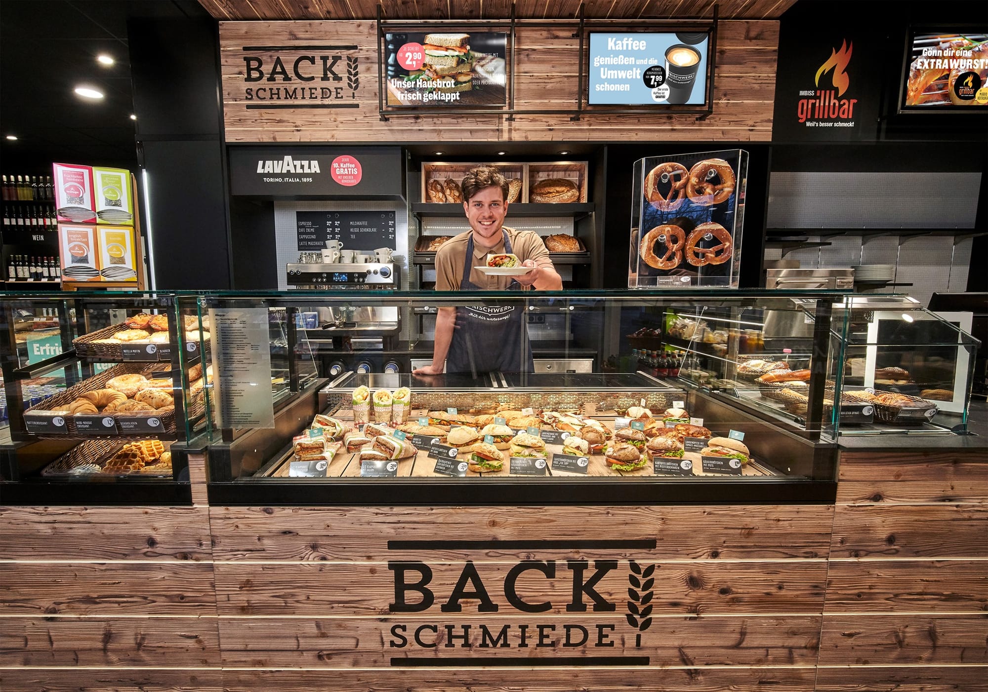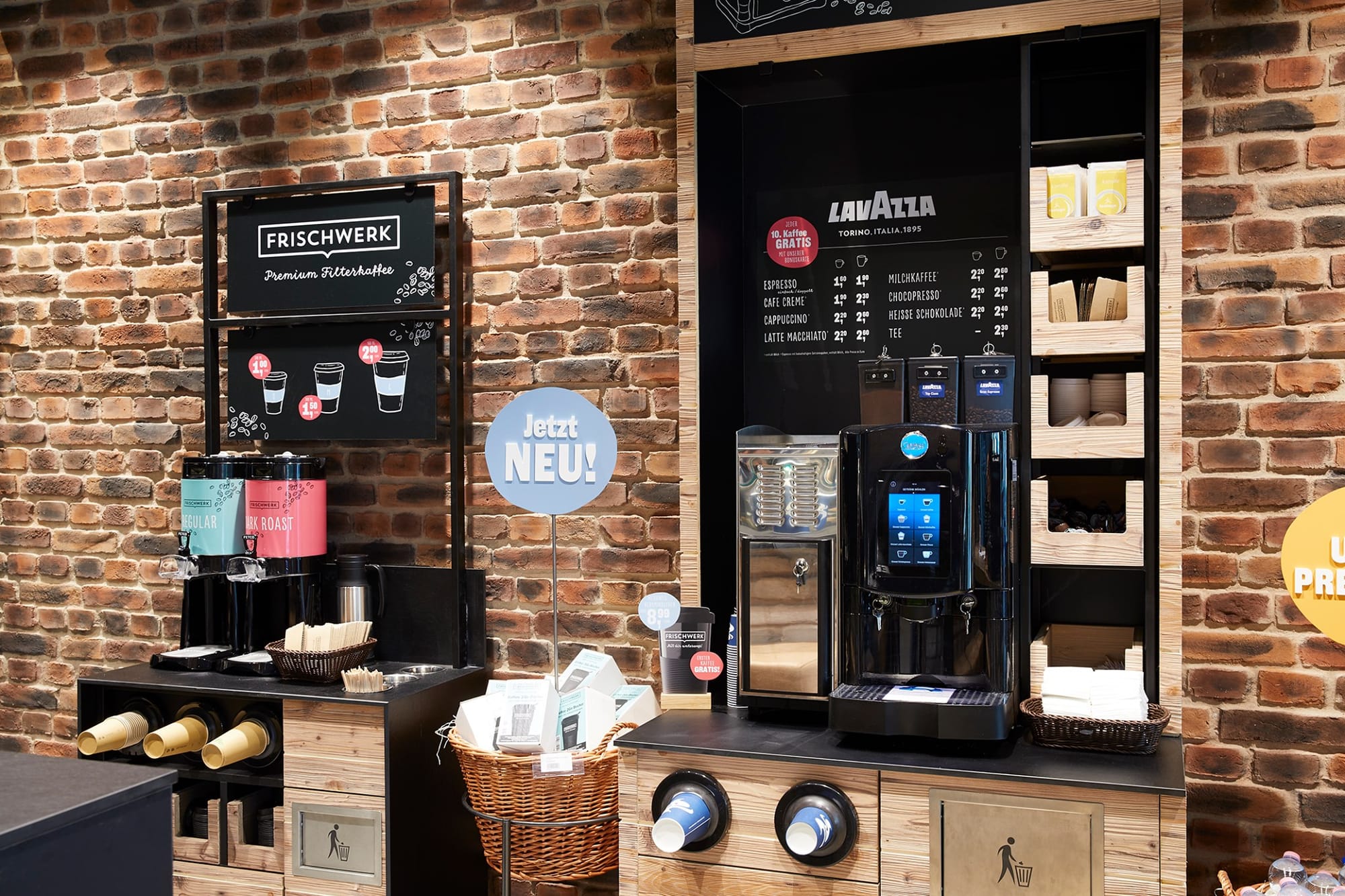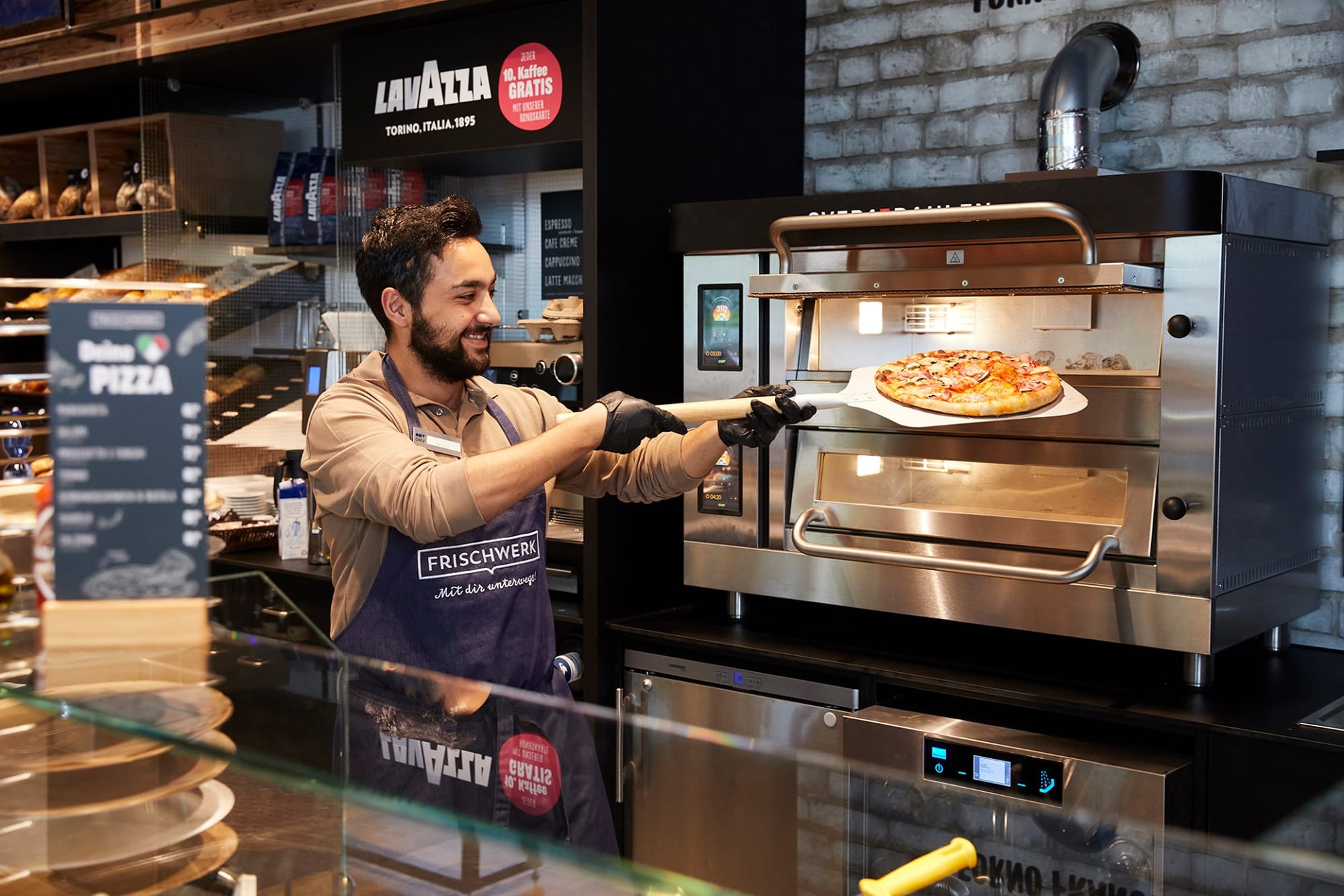 Одной из фишек Frischwerk является гриль-бар и минипиццерия. Гости могут купить карривурст, колбаски и картофель фри, или один из семи видов пиццы. Также в меню свежие салаты, сэндвичи, багеты, смузи и многие другие горячие и холодные закуски. Некоторые рецепты были созданы в сотрудничестве с телеведущим и звездным шеф-поваром Марио Котаской. Ассортимент #кофе включает различные сорта. С внедрением новой концепции фильтрованного кофе от Lekkerland магазин предлагает популярный классический вариант горячего напитка.