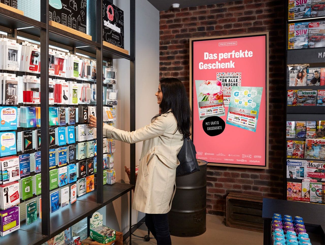 Задача цифровой системы состоит в том, чтобы побудить клиентов задержаться и совершить покупку. Все рекламные материалы выполнены в фирменном стиле Frischwerk, который адаптирован для совместного брендинга с другими компаниями. Рекламные ролики привлекают внимание и интерес покупателей. Они разделяются для четырех периодов дня и зон магазина (пекаря, касса, непродовольственных товаров).