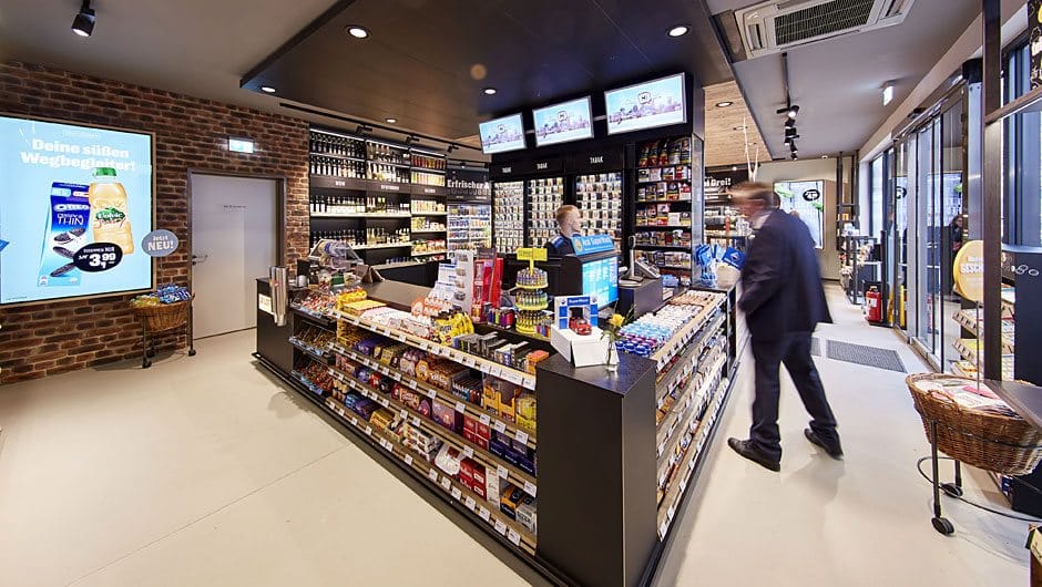 Чтобы повысить качество обслуживания клиентов применяется система Digital Signage. Широкоформатный экран привлекает внимание покупателей к зоне питания со свежим ассортиментом и пекарне еще на площадке АЗС. Остальные 80- и 32-дюймовые дисплеи расположены в стратегических точках магазина. Потребители могут легко найти все товары, показанные рядом с соответствующей цифровой вывеской.