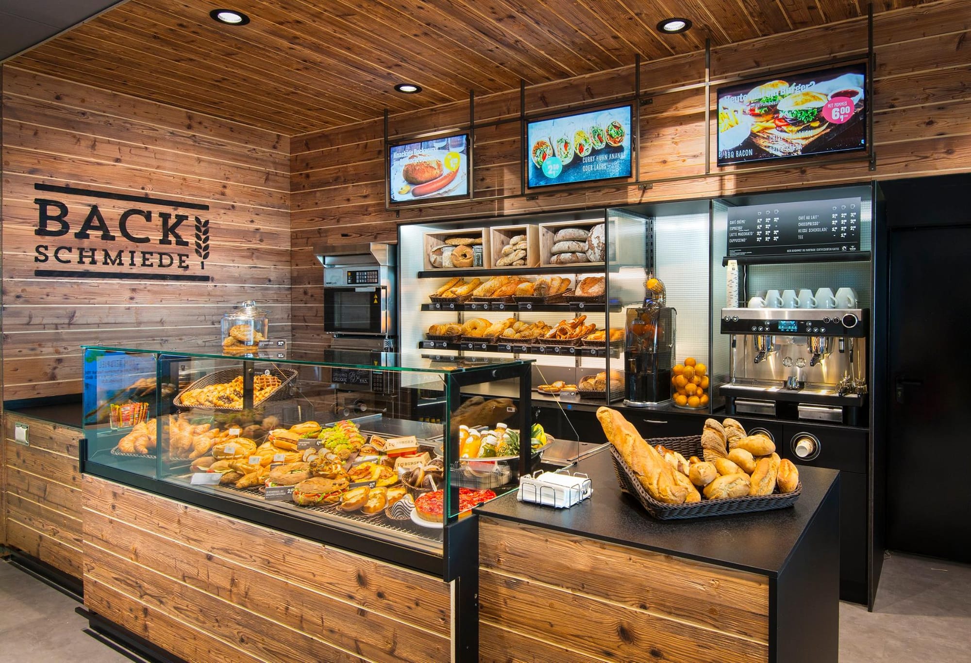 В дизайне магазина присутствует много дерева и металла. Теплый и приятный древесный цвет панелей, от прилавка к потолку в зоне пекарни, усиливает ощущение свежести предлагаемых блюд. Зона отдыха расположена таким образом, чтобы по виду из нее, посетители не думали что находятся на заправке. Визуально зона общественного питания отделена от остальной части автозаправочной станции. Четкое разграничение касается даже персонала. Сотрудники ресторанного сервиса носят даже другую форму. Навигация магазина ясная и понятная клиентам.