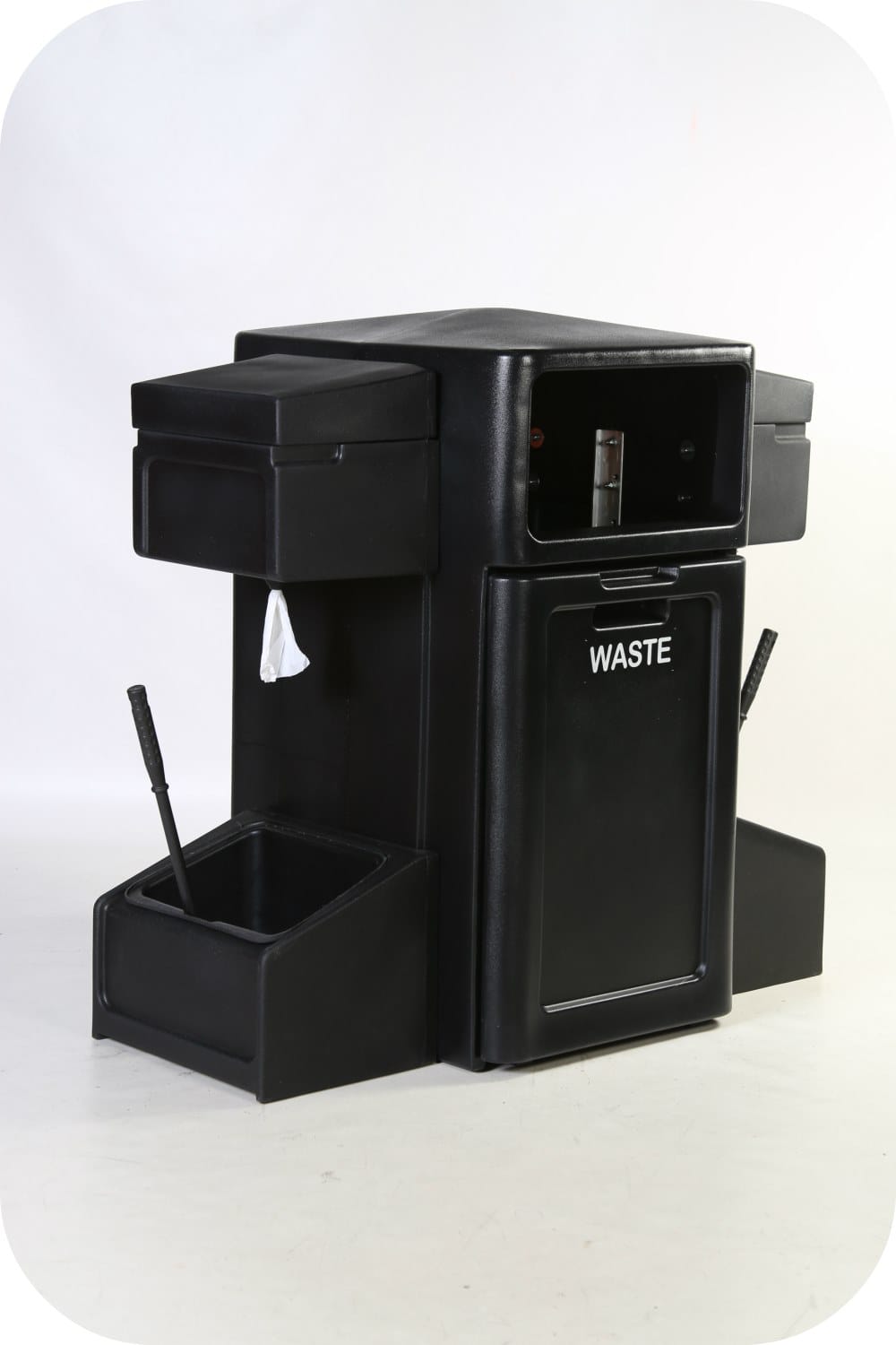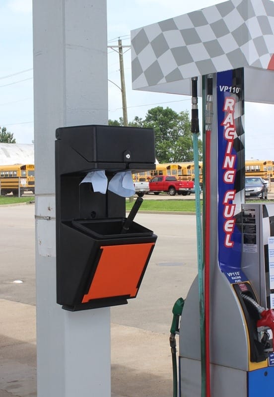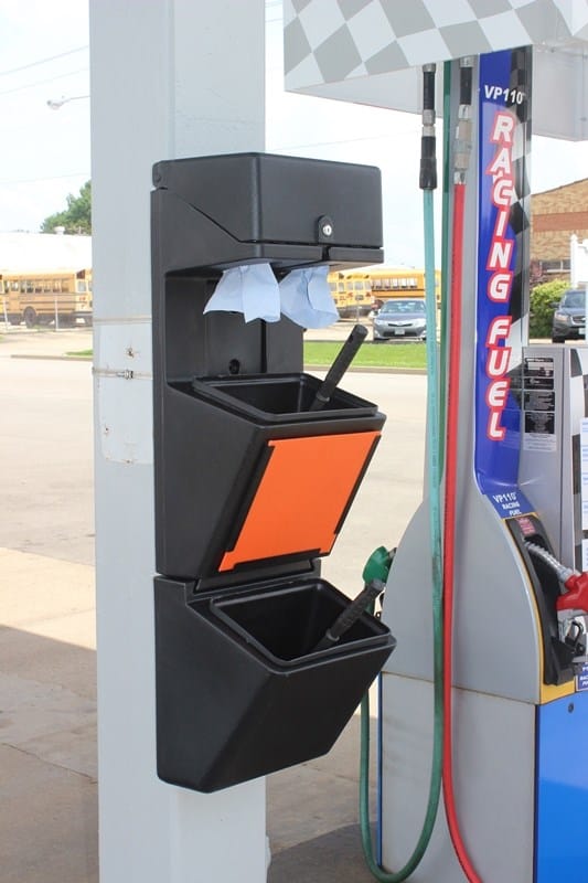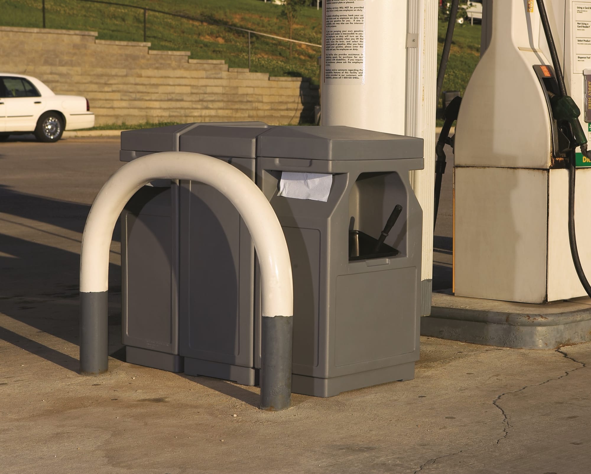 Комбинированный инвентарь на АЗС обеспечивает удобный и легкий доступ к уличной урне для мусора, диспенсеру для бумажных полотенец, емкости для мытья стекол автомобилей. Модели из прочного пластика выпускаются различного вида, стиля и функциональности. Они изготовлены с защитой от выцветания и механических повреждений. Стандартное исполнение продукции в сером или черном цветах, но могут быть и в других расцветках в соответствии с фирменным стилем компании.