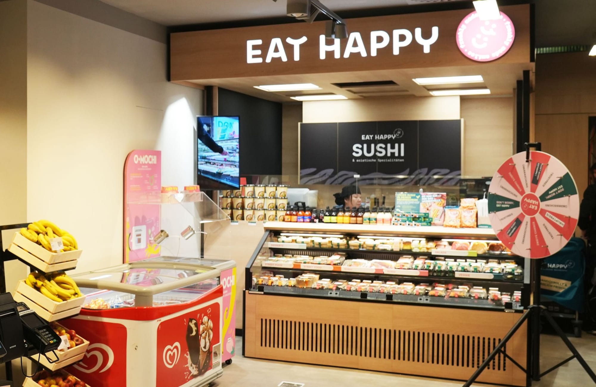 Интеграция Eat Happy Shop добавляет уникальное ценностное предложение — свежеприготовленные суши и блюда азиатской кухни готовятся ежедневно внутри помещения. Эта модель «магазин в магазине» поднимает точку продаж на новый уровень, позиционируя ее как более специализированный опыт.