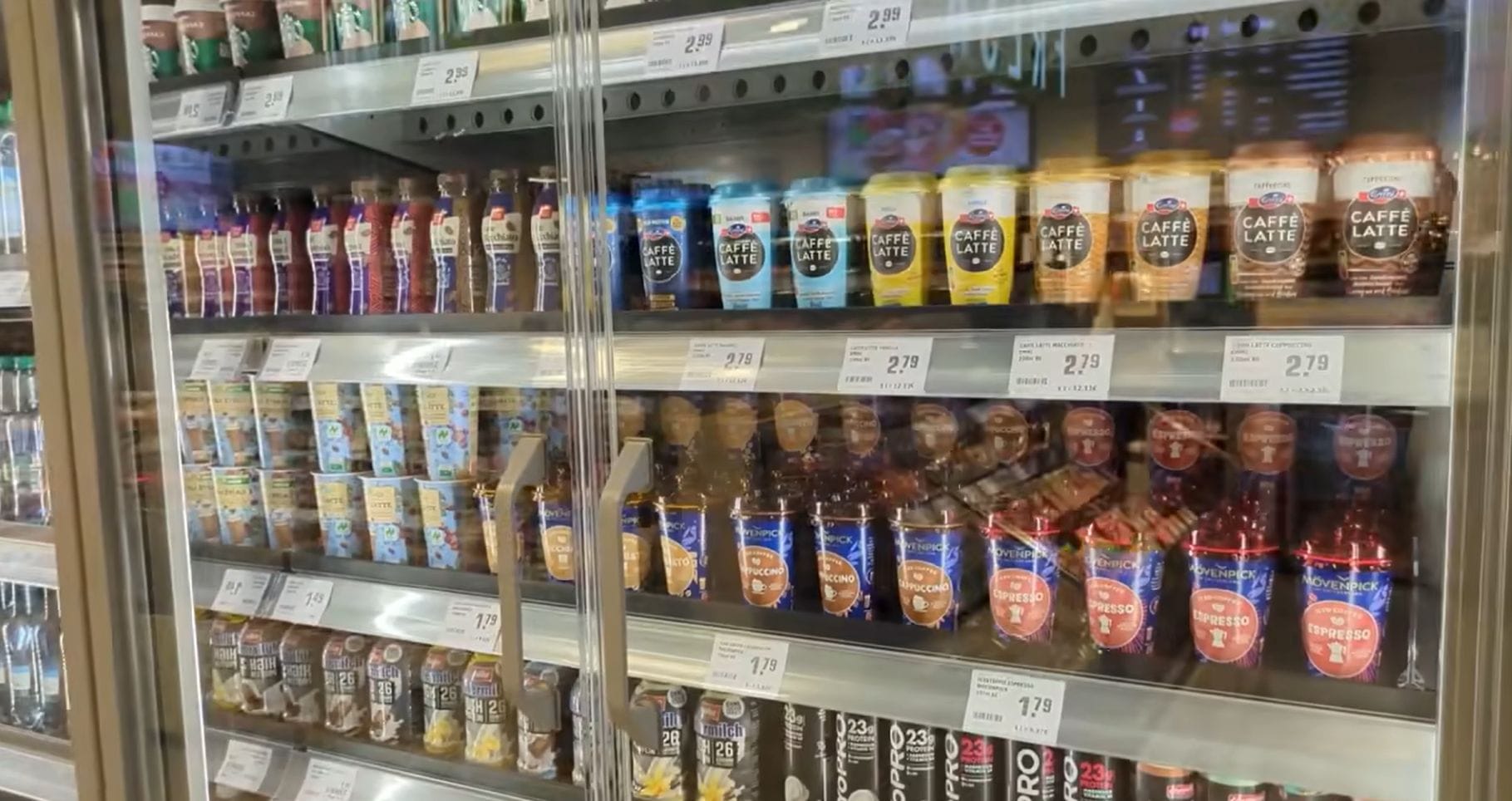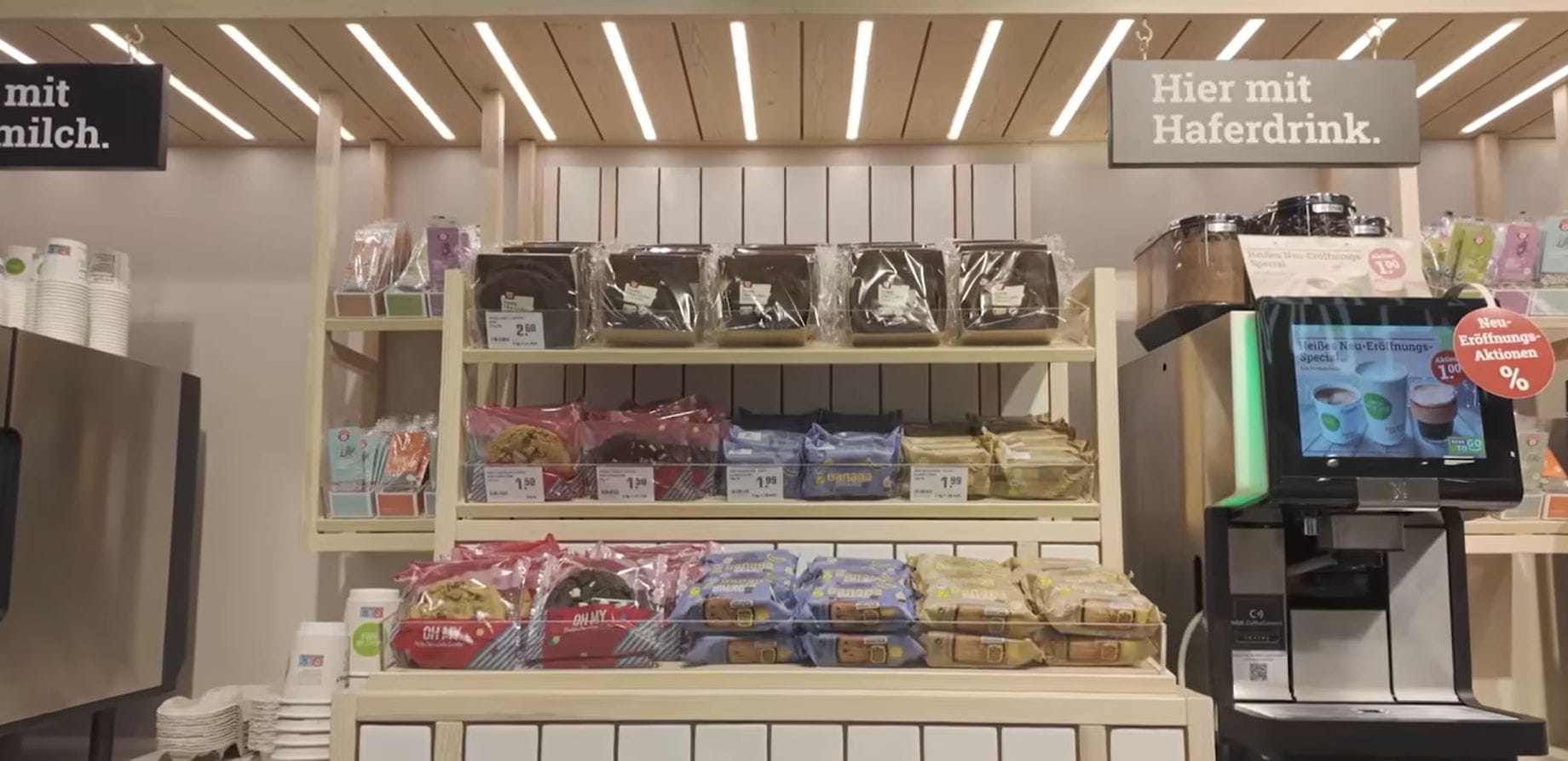 Кофе — еще один ключевой элемент, доступный как в самообслуживании, так и через бариста, с вариантами, адаптированными к новым тенденциям, такими как овсяное молоко и кофе со льдом. Привлекательно выглядит кофемодуль с выделяющимся в центре морозильником.