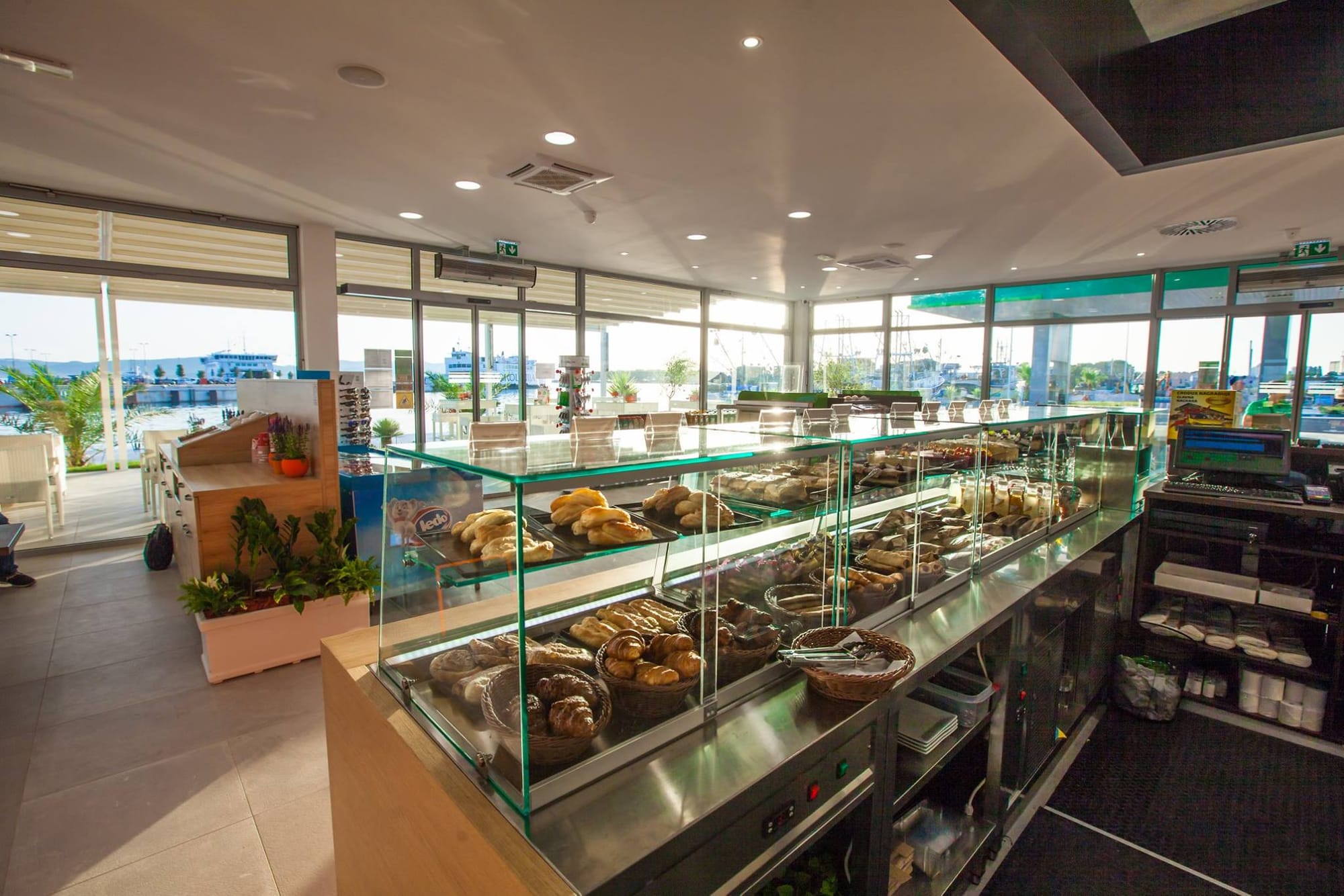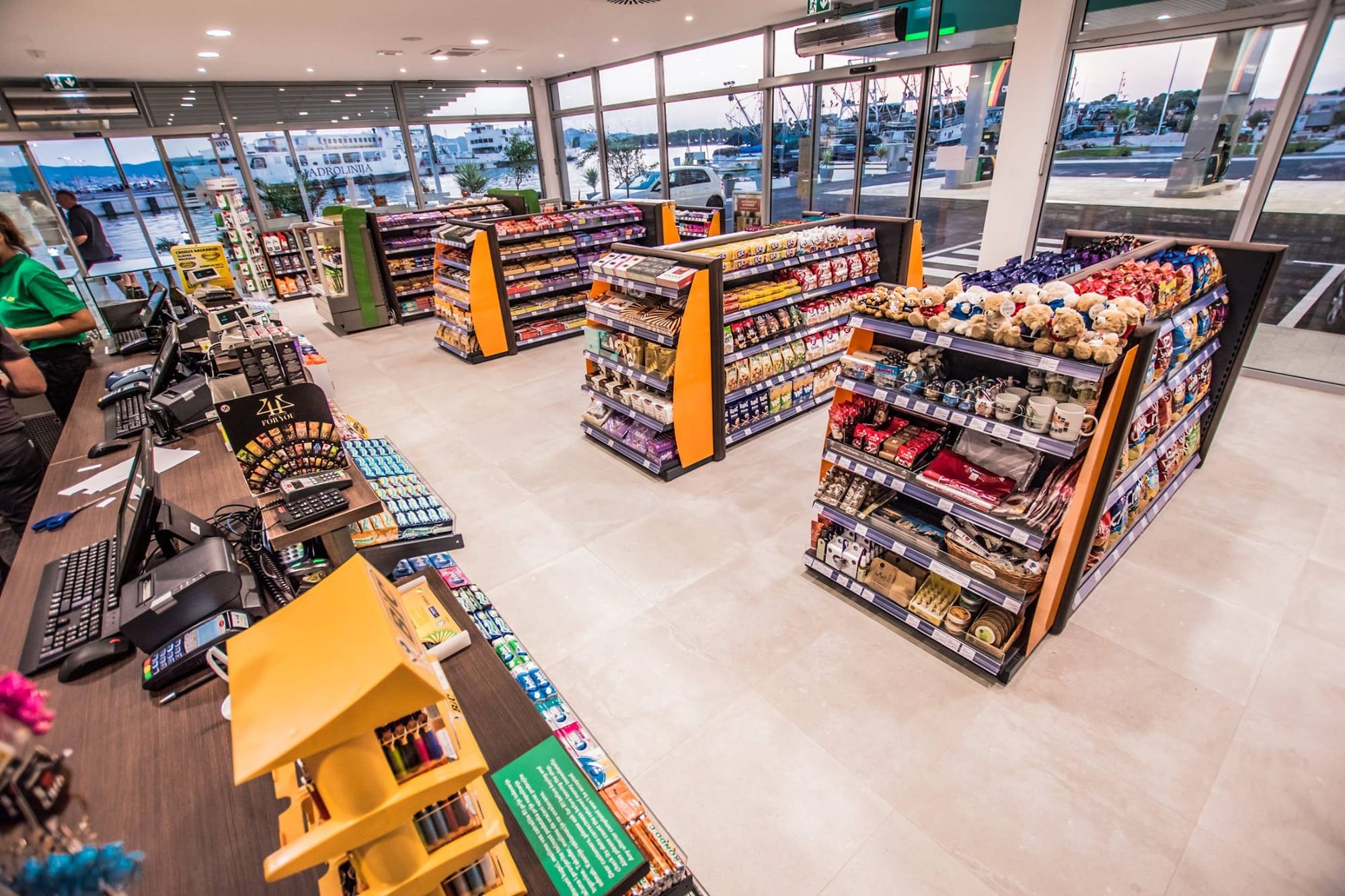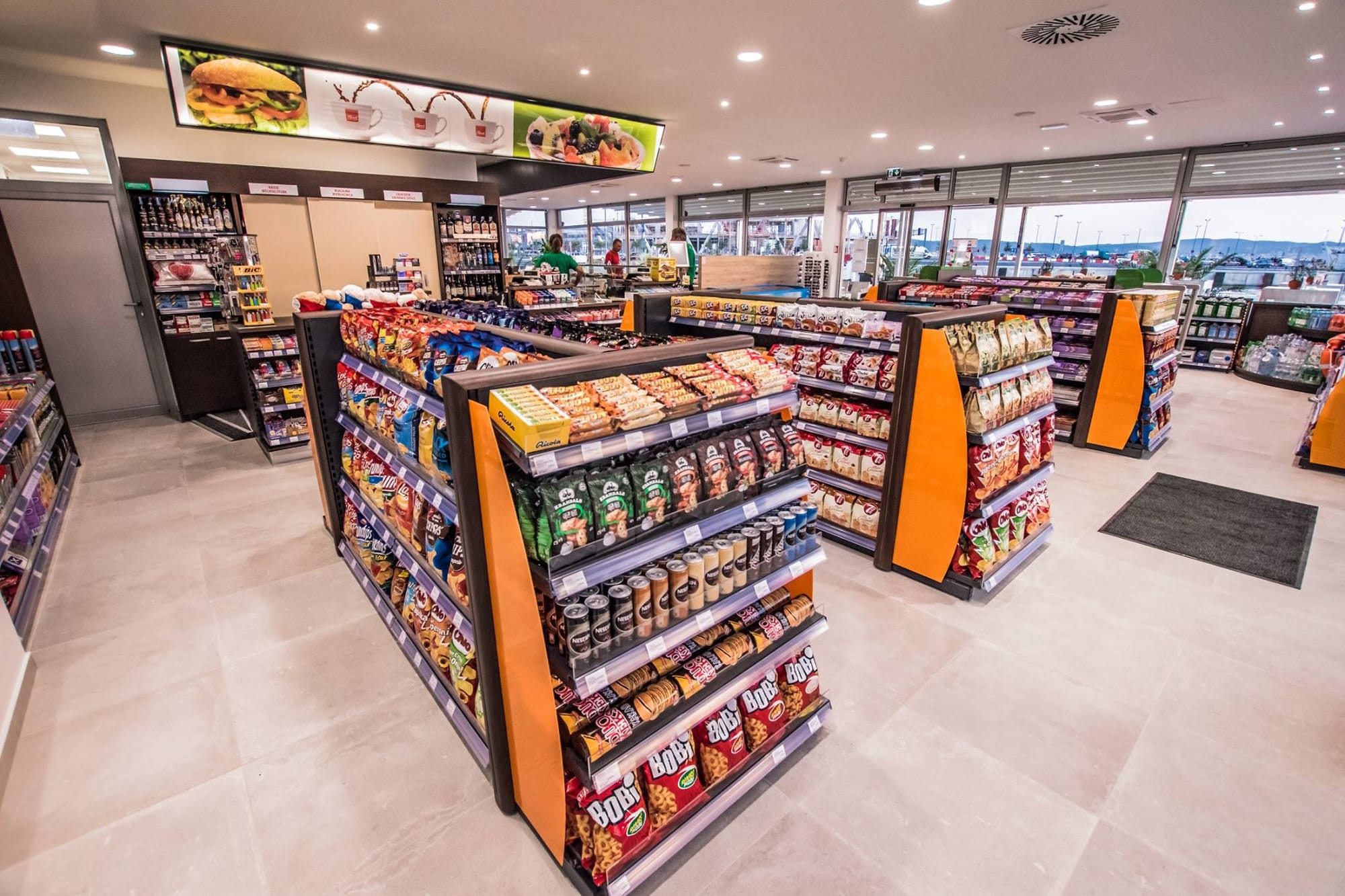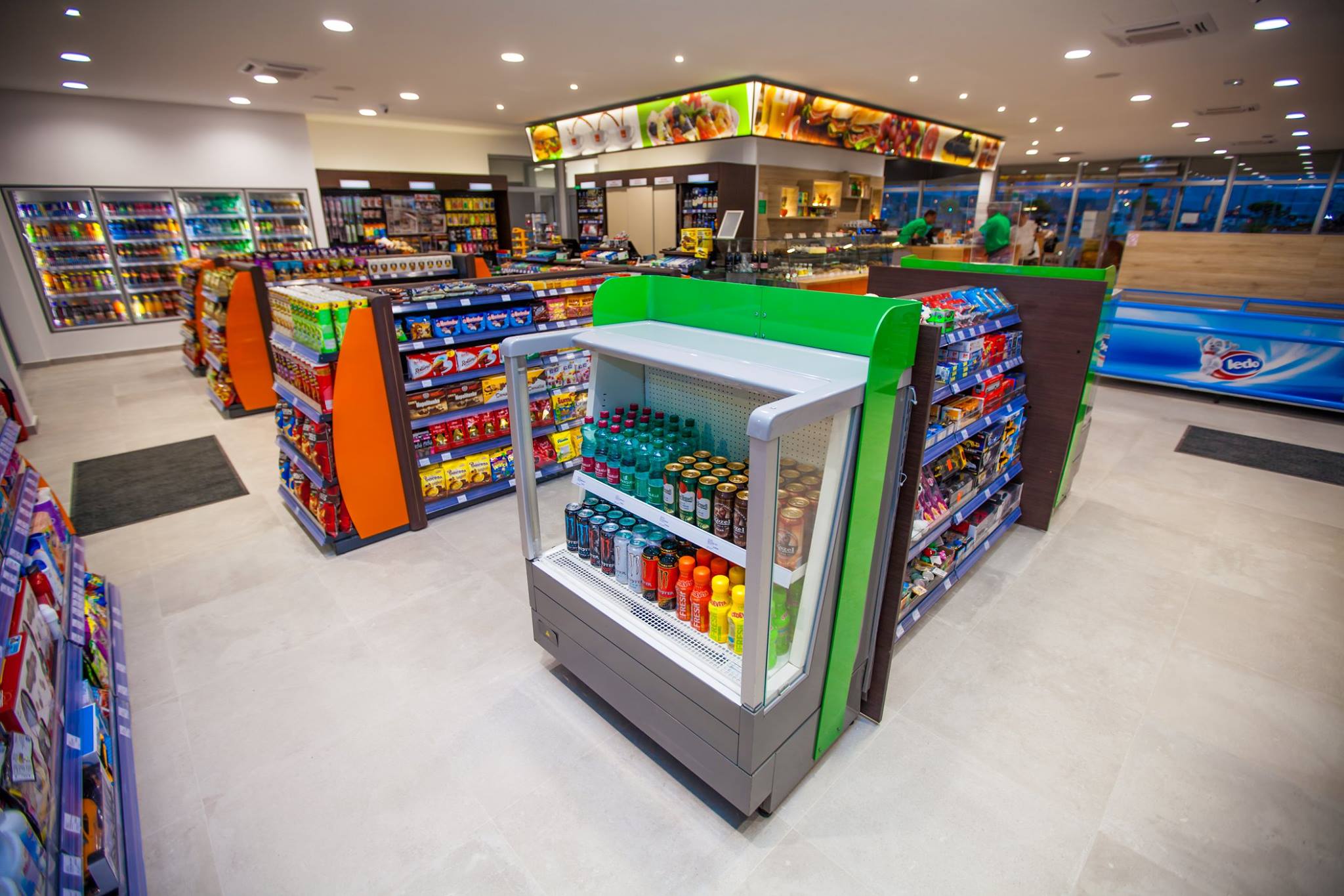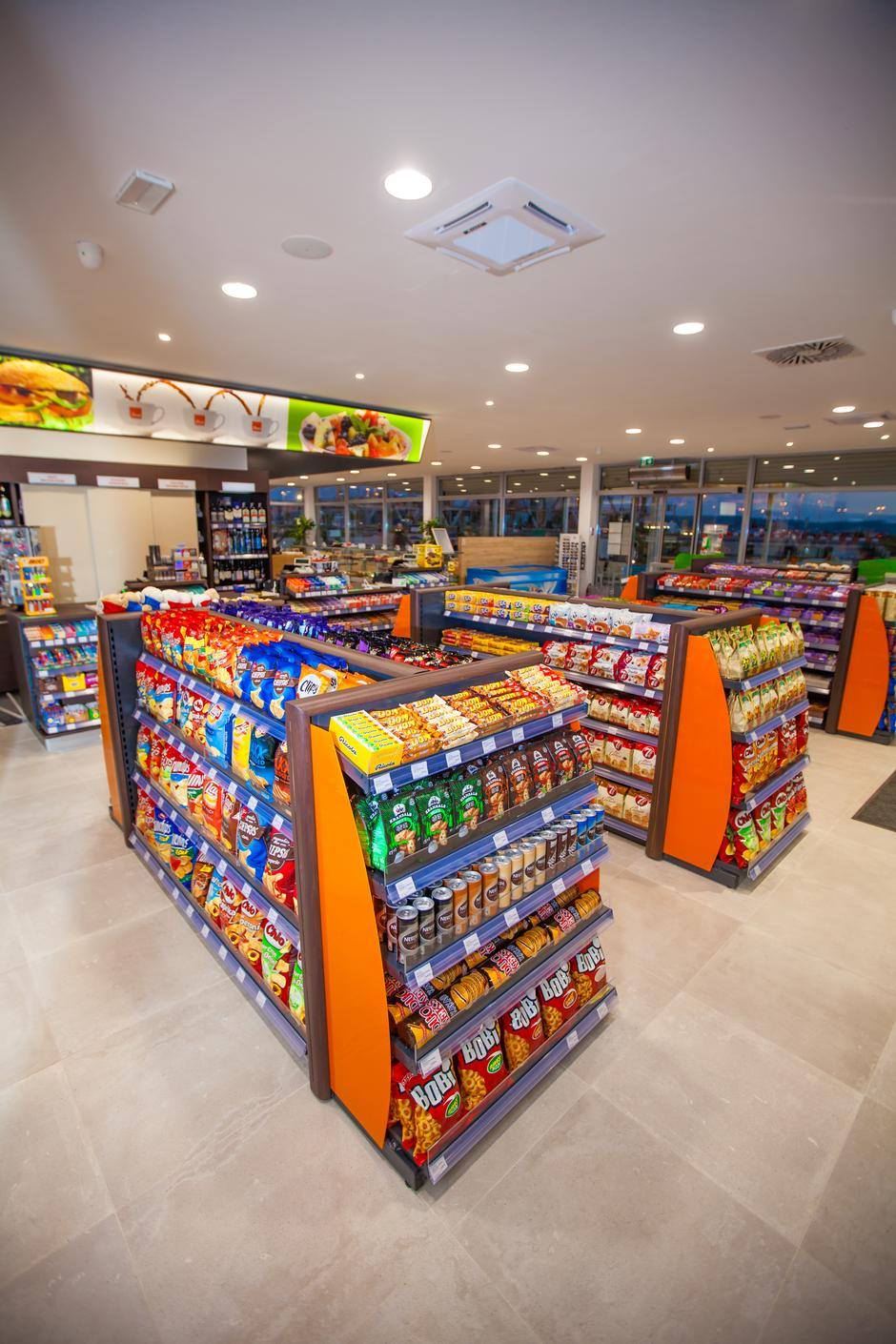 В магазине покупателям предлагают широкий ассортимент товаров, продуктов питания, прохладительных и алкогольных напитков, товаров для отдыха, предметов гигиены, игрушек, автомобильных аксессуаров и автохимии. Разнообразное гастрономическое предложение кафе-бара включает: свежеприготовленные горячие и холодные бутерброды, сладкие и соленые закуски, выпечка, кондитерские изделия, пирожные, фрукты и фреши, кофе.