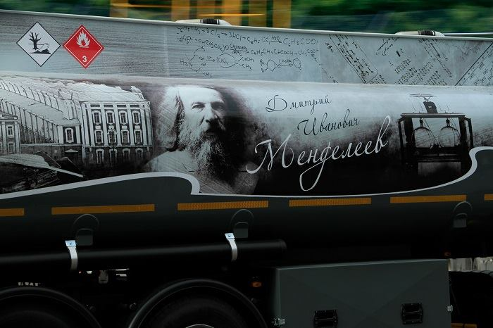 Бензовоз “Дмитрий Менделеев” назван по имени выдающегося русского ученого-энциклопедиста, который стоял у истоков такого важного технологического процесса как крекинг нефти, использующийся для получения лёгких моторных топлив из тяжёлых нефтепродуктов.