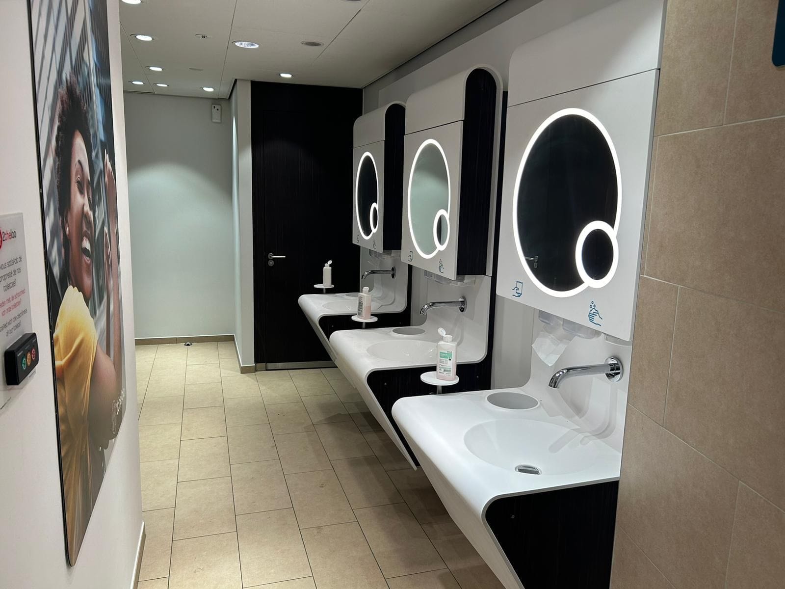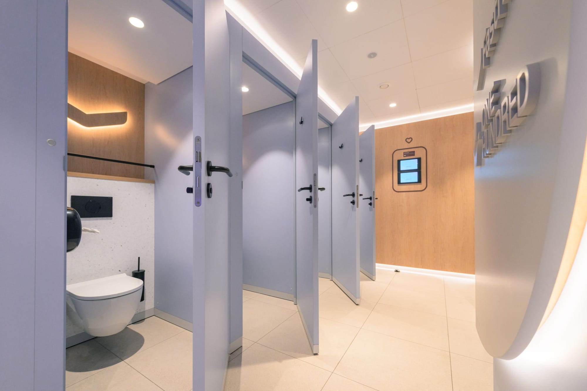 Такой формат гибко масштабируется под поток: все кабины универсальны, и это снижает среднее время ожидания по сравнению с ситуацией, когда, например, женская комната перегружена, а мужская — свободна. Дополнительно сокращается дублирование оборудования (одна зона раковин вместо двух) — экономия площади и затрат на уборку.