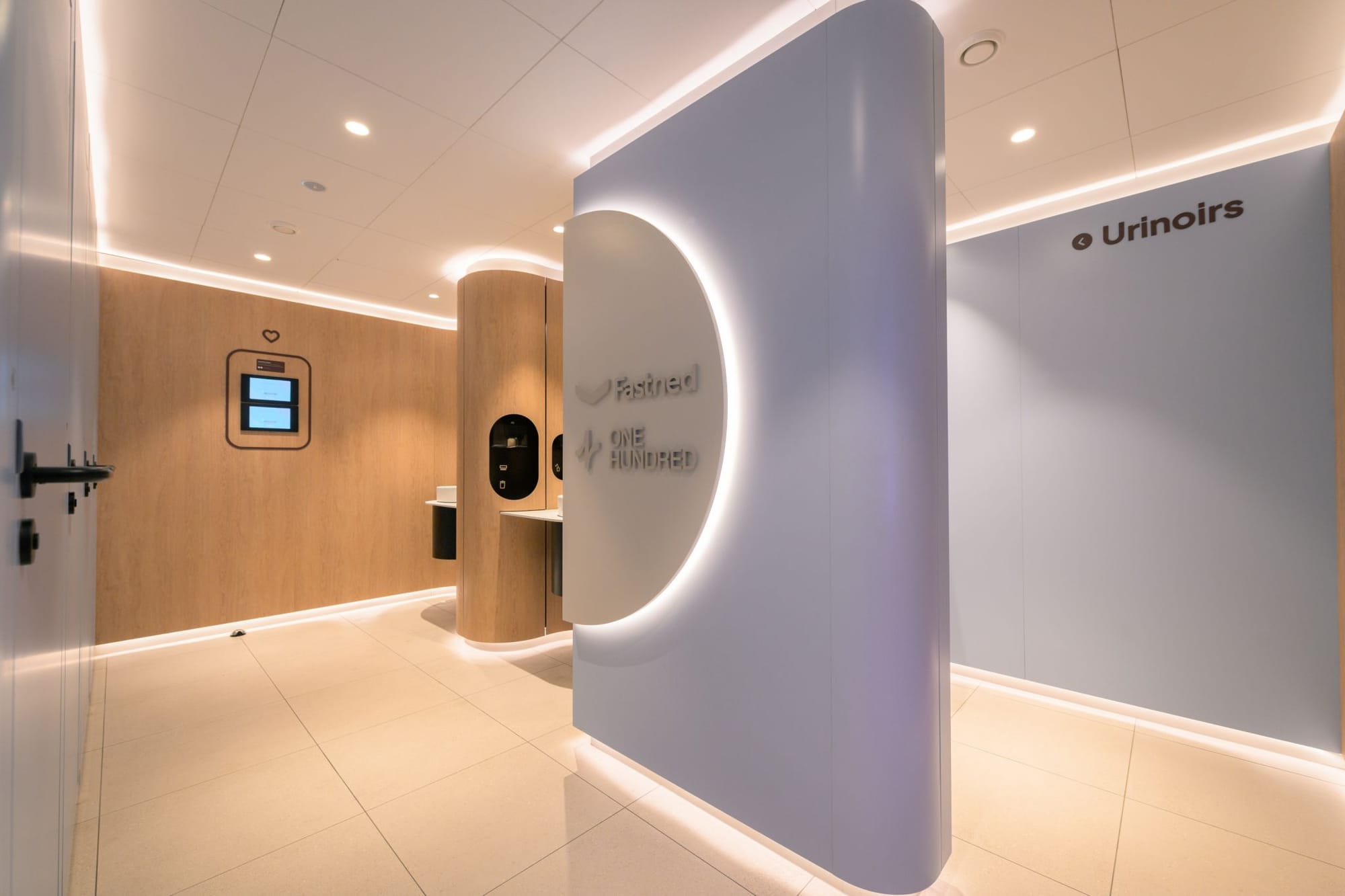 ONE HUNDRED Restrooms (Нидерланды) — компания, предлагающая «туалеты как опыт заботы о самочувствии». Концепт сформировался около 2017 года и реализован в Испании, Бельгии, Швеции, Нидерландах, Франции и других странах. ONE HUNDRED фокусируется на трёх китах: гигиена, здоровье и комфорт. Объекты отличаются стильным дизайном, постоянной уборкой и допсервисами: модули для проверки базовых показателей (например, давление), зоны релакса, питьевые фонтанчики, решения для поддержания гидратации. Компания активно выходит в сферу АЗС и зарядных хабов: партнёрства с TotalEnergies, Circle K (включая проекты на трассовых станциях), а также соглашение с оператором зарядных станций Fastned для оснащения точек по Европе высококачественными туалетами.
