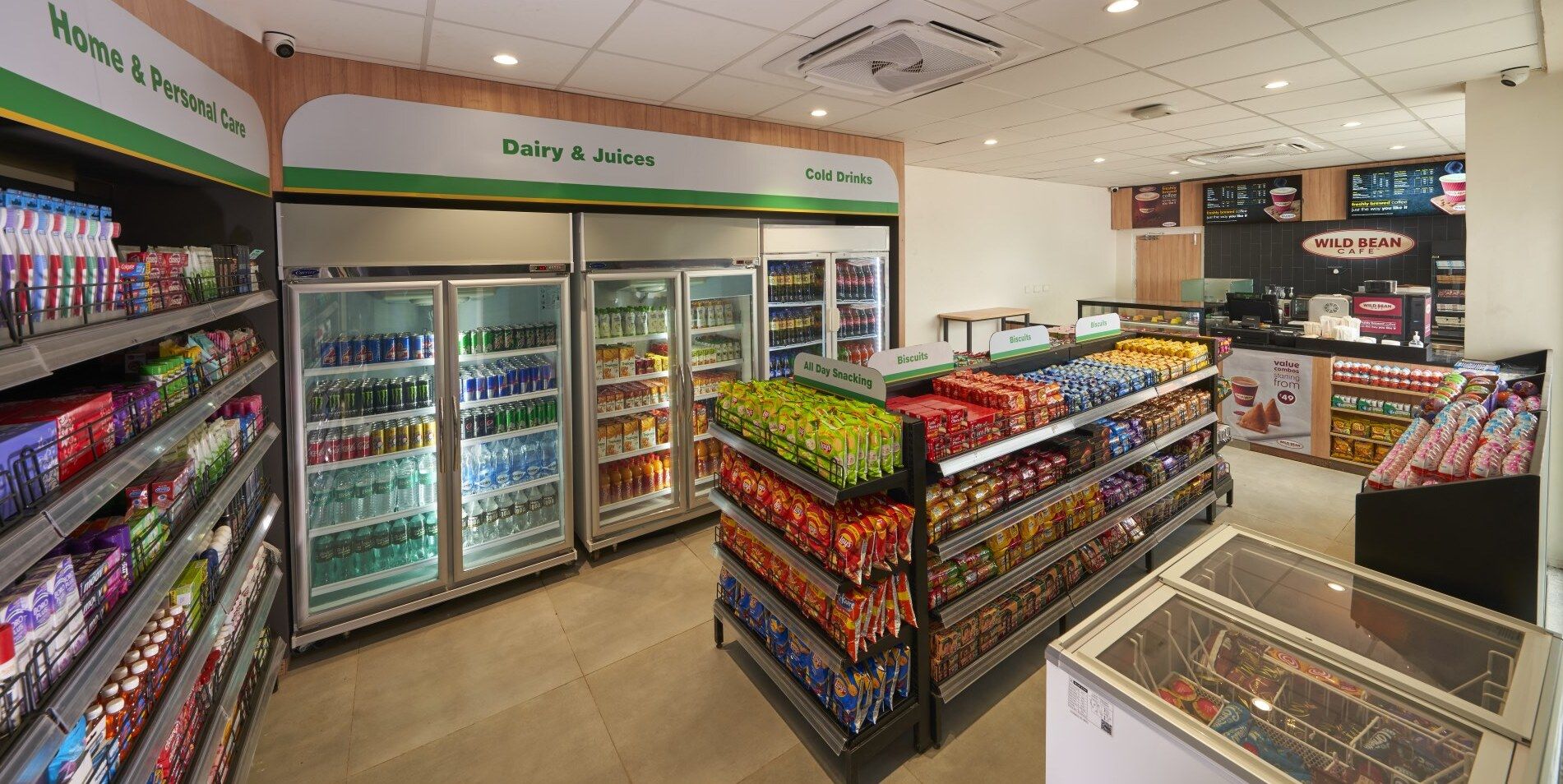 Суть предложения удобства – сделать гастрономическое предложение доступным для клиентов, которые находятся в пути, через Wild Bean Café. У круглосуточного магазина есть крупнейший розничный торговец в Индии Reliance Retail в качестве партнера по товарам повседневного спроса, закускам и кондитерским изделиям. Wild Bean Café, международный динамичный бренд от bp, будет предлагать свой фирменный кофе вместе с ассортиментом региональных и местных блюд, включая чай масала, самоса (жареное или печеное тесто с начинкой), упма (каша с овощами), ролл панир тикка и шоколадный торт лава.