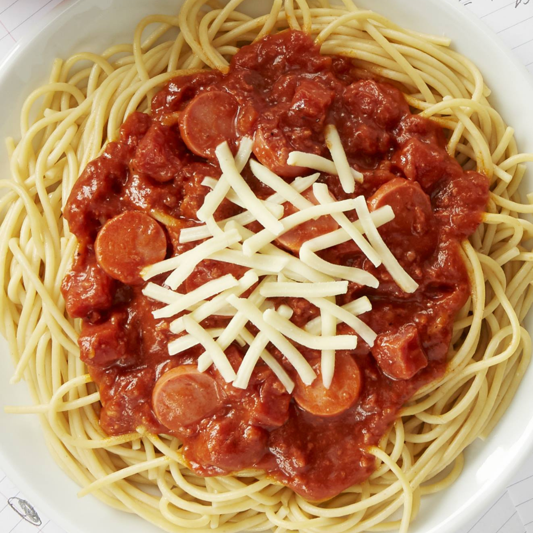 - Спагетти – это блюдо, любимое как взрослыми, так и детьми, включает фирменный сладкий соус, наполненный солеными ломтиками пикантной ветчины и сосисок, а сверху щедро посыпанным сыром.