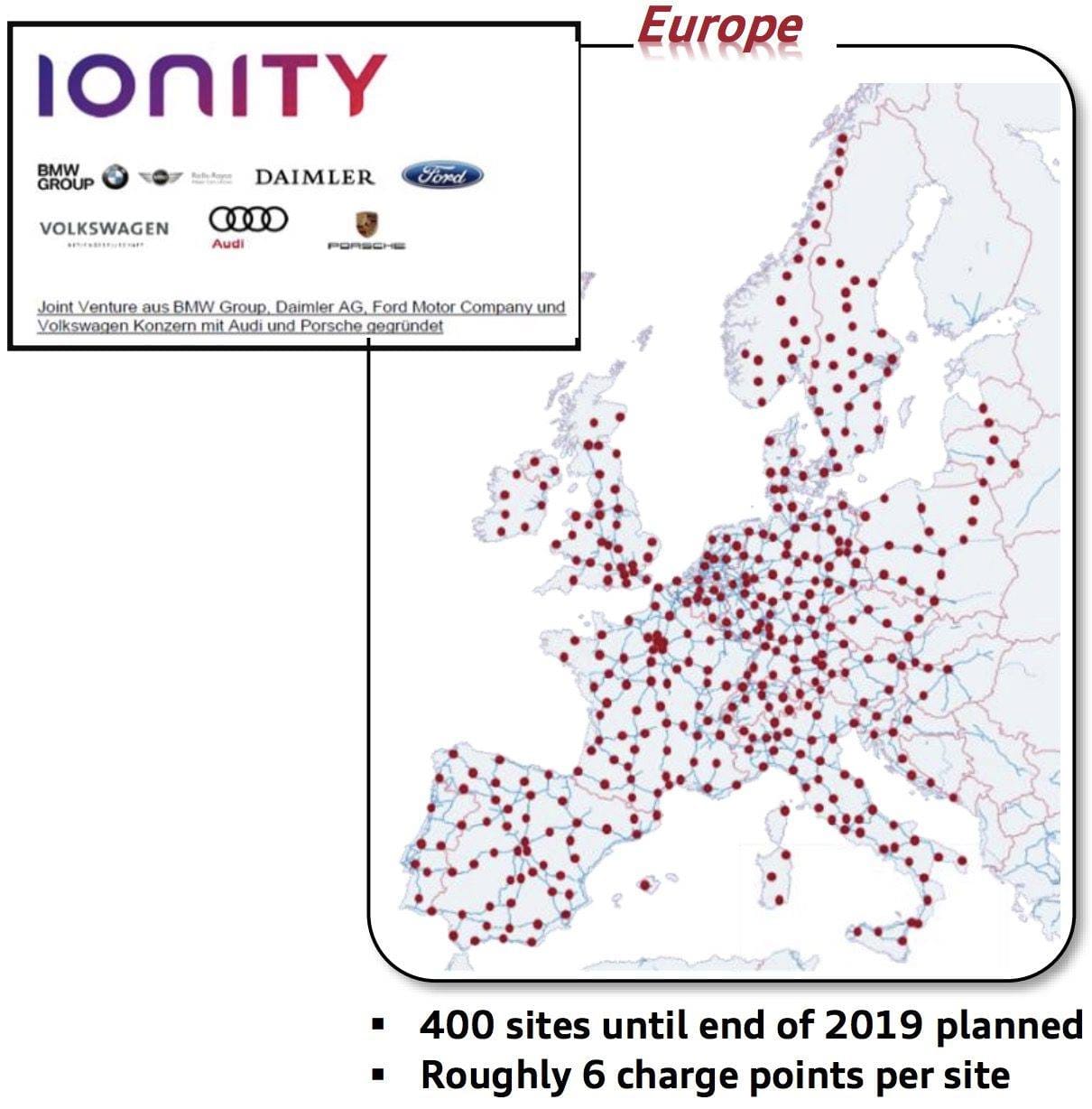 IONITY - это совместное предприятие автопроизводителей BMW Group, Daimler AG, Ford Motor Company и Volkswagen Group с Audi и Porsche. Компания запустит сеть надежных и высокопроизводительных зарядных станций по основным магистралям Европы. Мощность станций до 350 кВт позволит сократить время зарядки электромобилей (около 15 минут для подзарядки). К 2020 году планируется работа 400 станций EONITY в 18 европейских странах. Станции построят вдоль основных дорог через каждые 100-120 км.