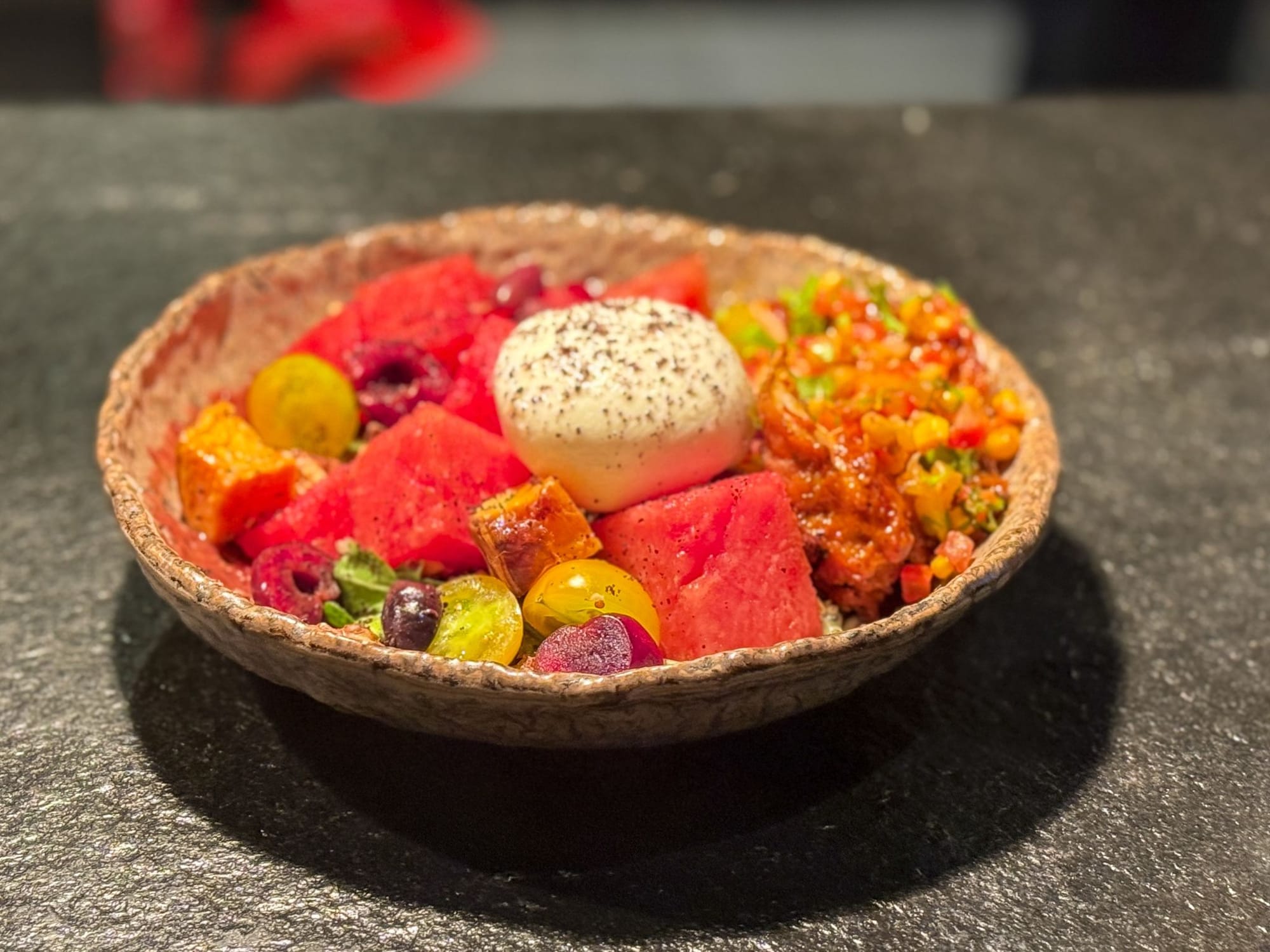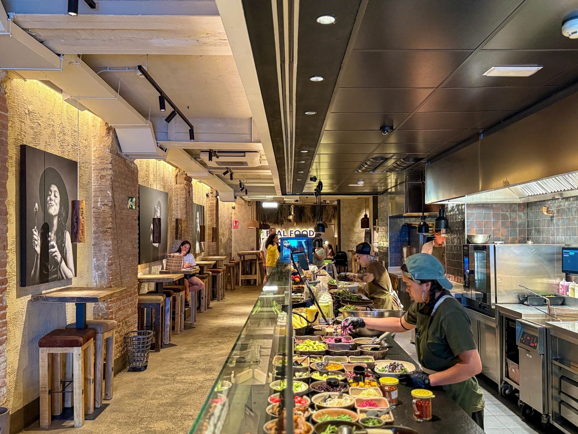 Еда строится вокруг того, что они называют «real food» (хотя так сегодня говорят многие). Однако здесь всё действительно готовится с нуля каждый день из свежих сезонных ингредиентов без добавок. А что ещё важнее — вы можете наблюдать за процессом приготовления прямо во время заказа.