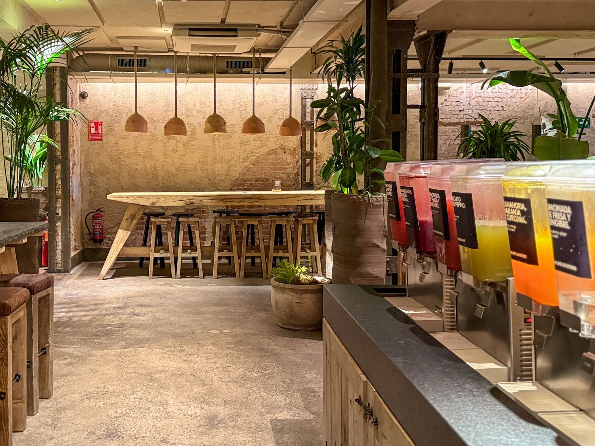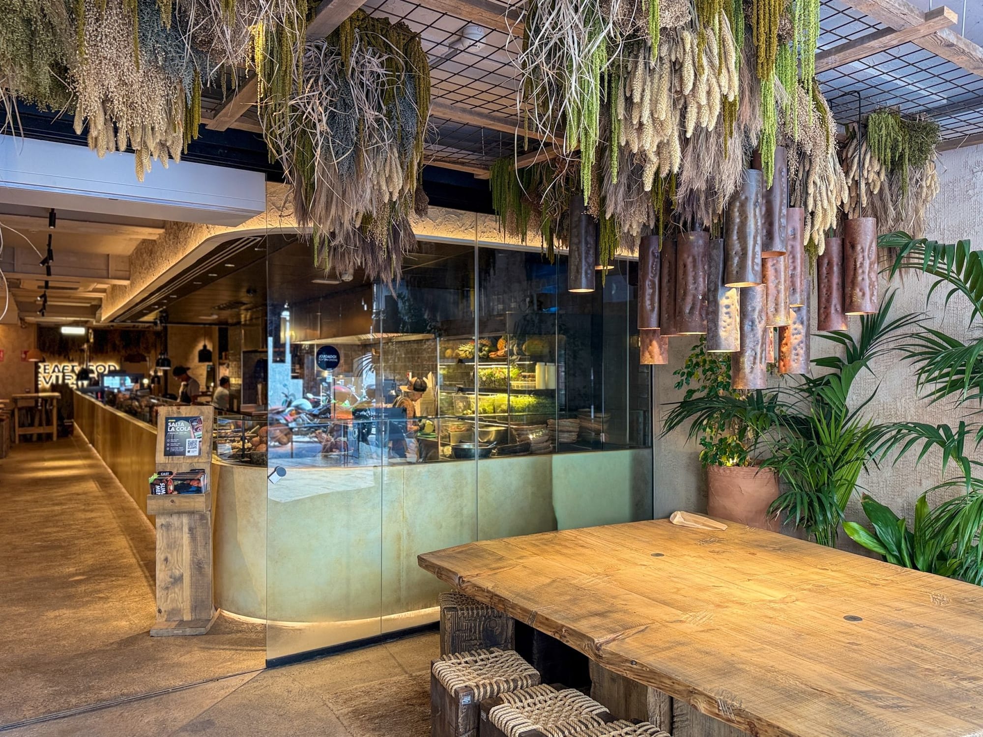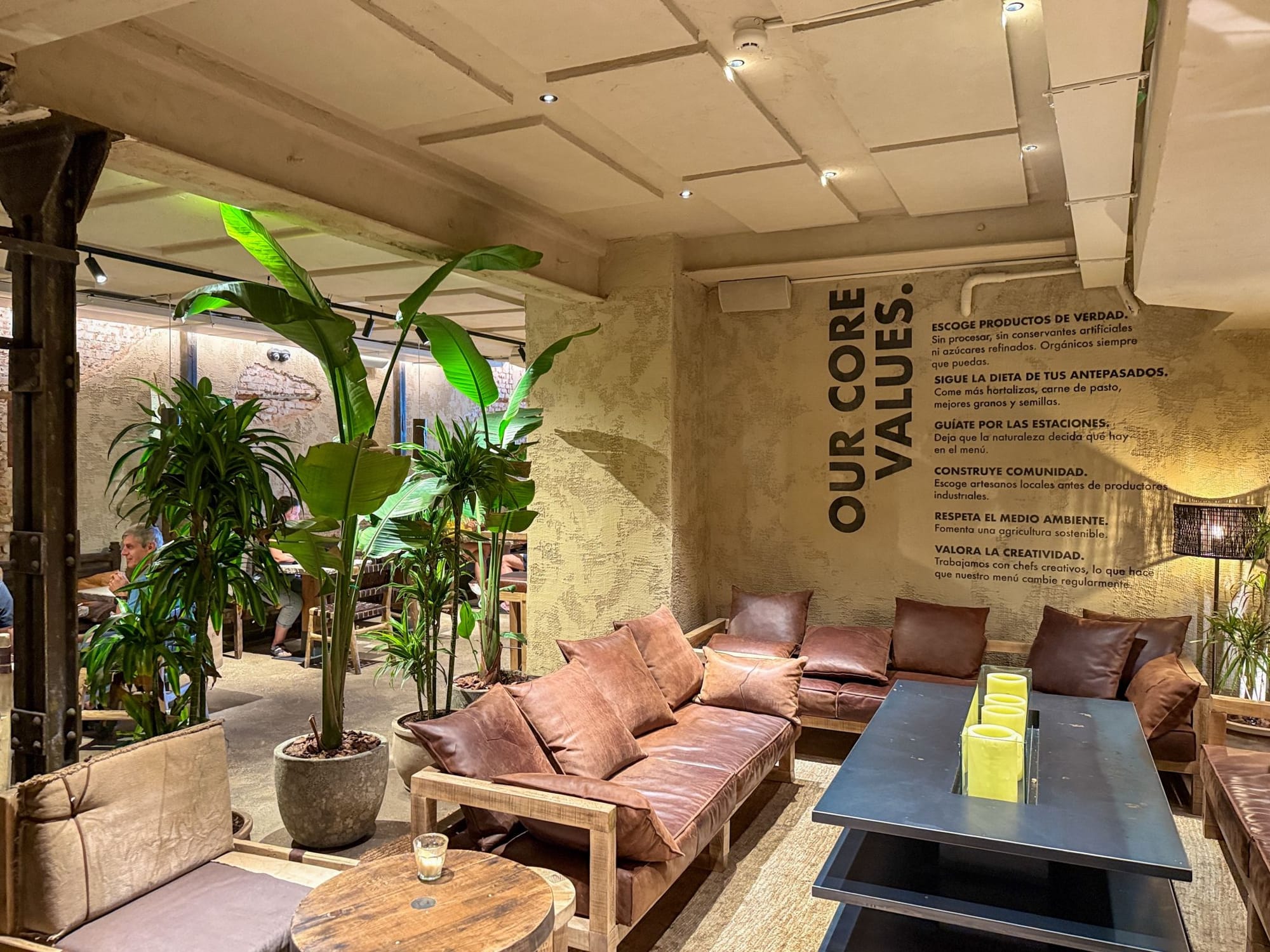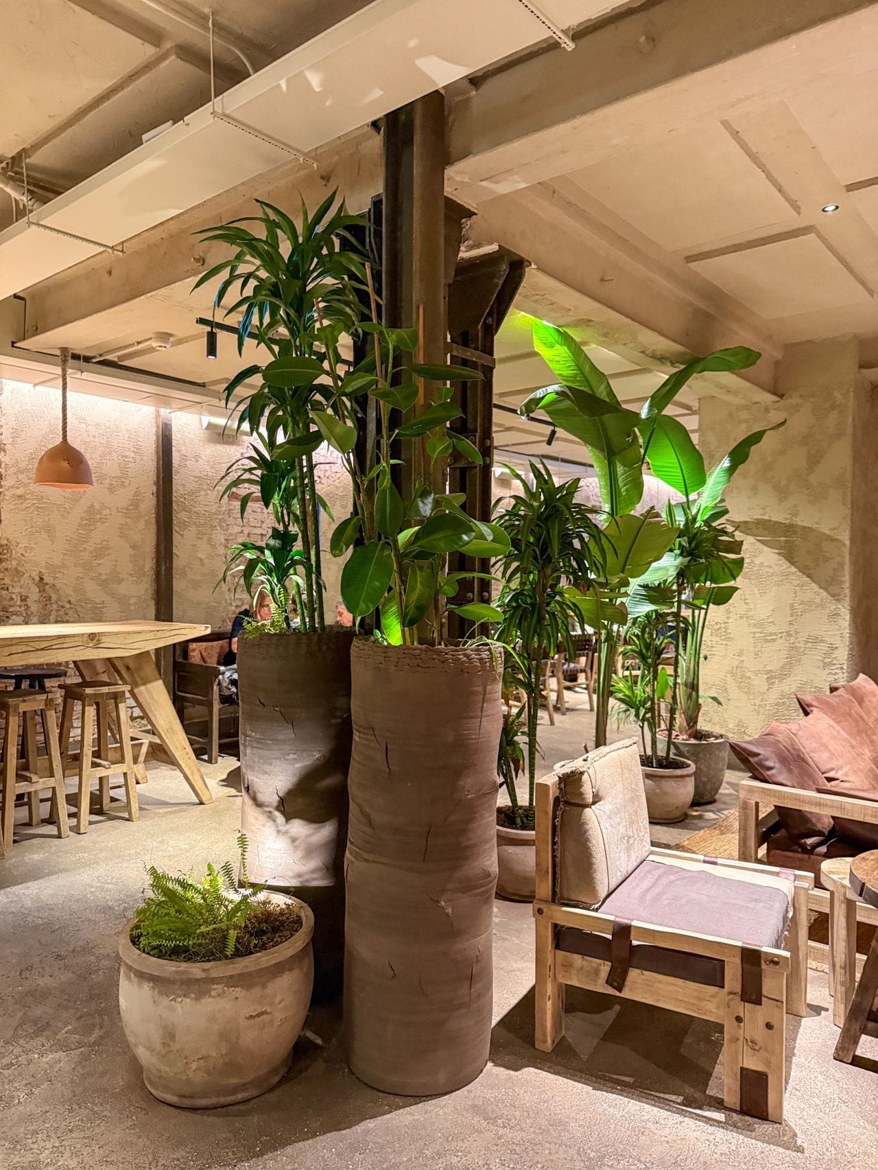 Каждый интерьер ресторана создаётся из натуральных материалов — глины, дерева и камня. Это обеспечивает бренду единый стиль и качество, которые выглядят одновременно продуманными и по-домашнему тёплыми. Посадочные зоны сочетают уютные уголки, огромные общие столы и функциональные табуреты — для потоков гостей, которые приходят сюда в течение всего дня.