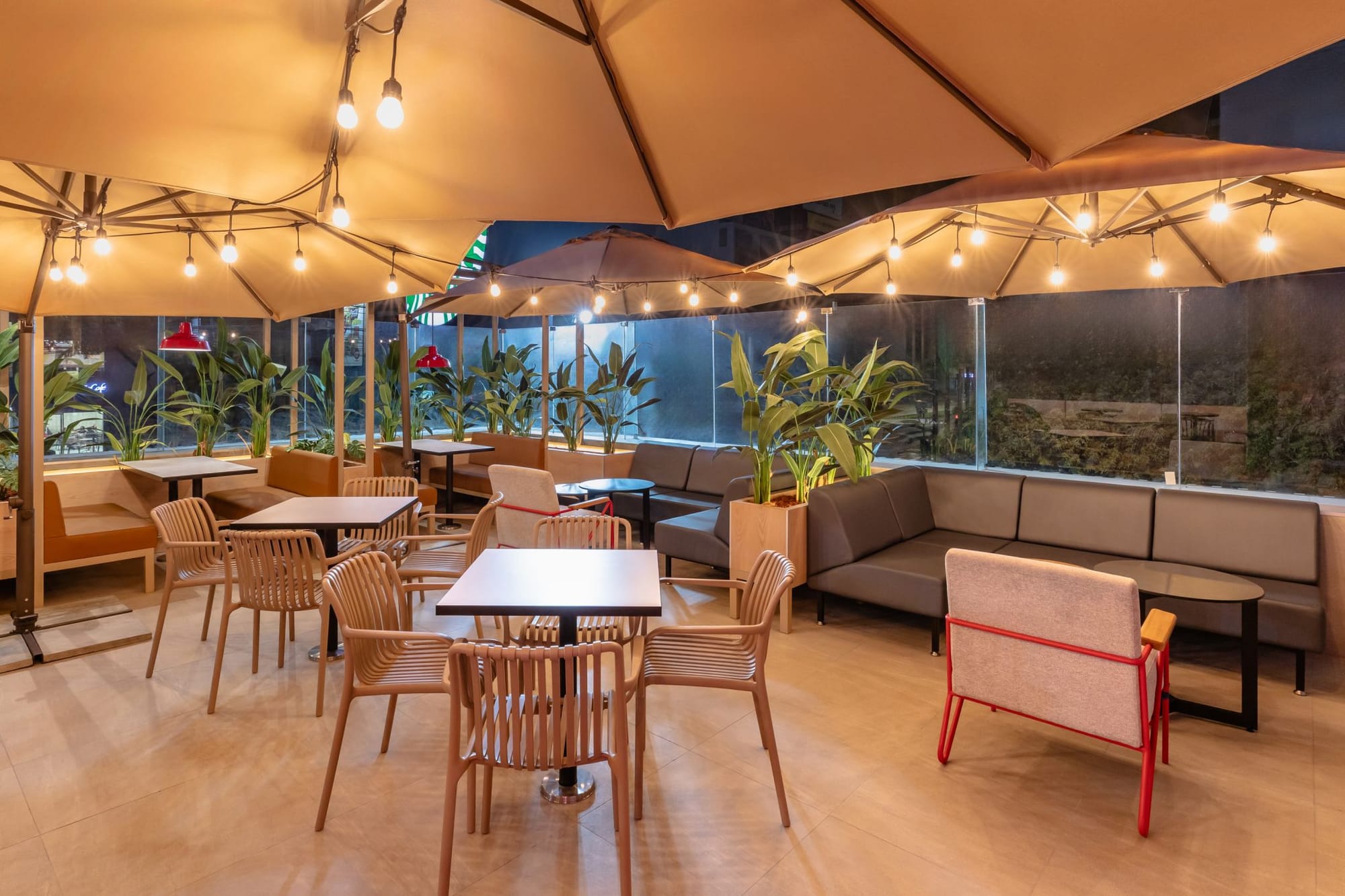 Привлекательно выглядят мини-кабинки для компании со стильным неоновым оформлением и «инстаграмным» акцентом, при этом подчеркивающие приватность, удобство и брендинг. Обратите внимание на интересное решение с окнами/«глазами» в посадочной зоне. И конечно, атмосферы заведению добавляет открытая терраса наверху.