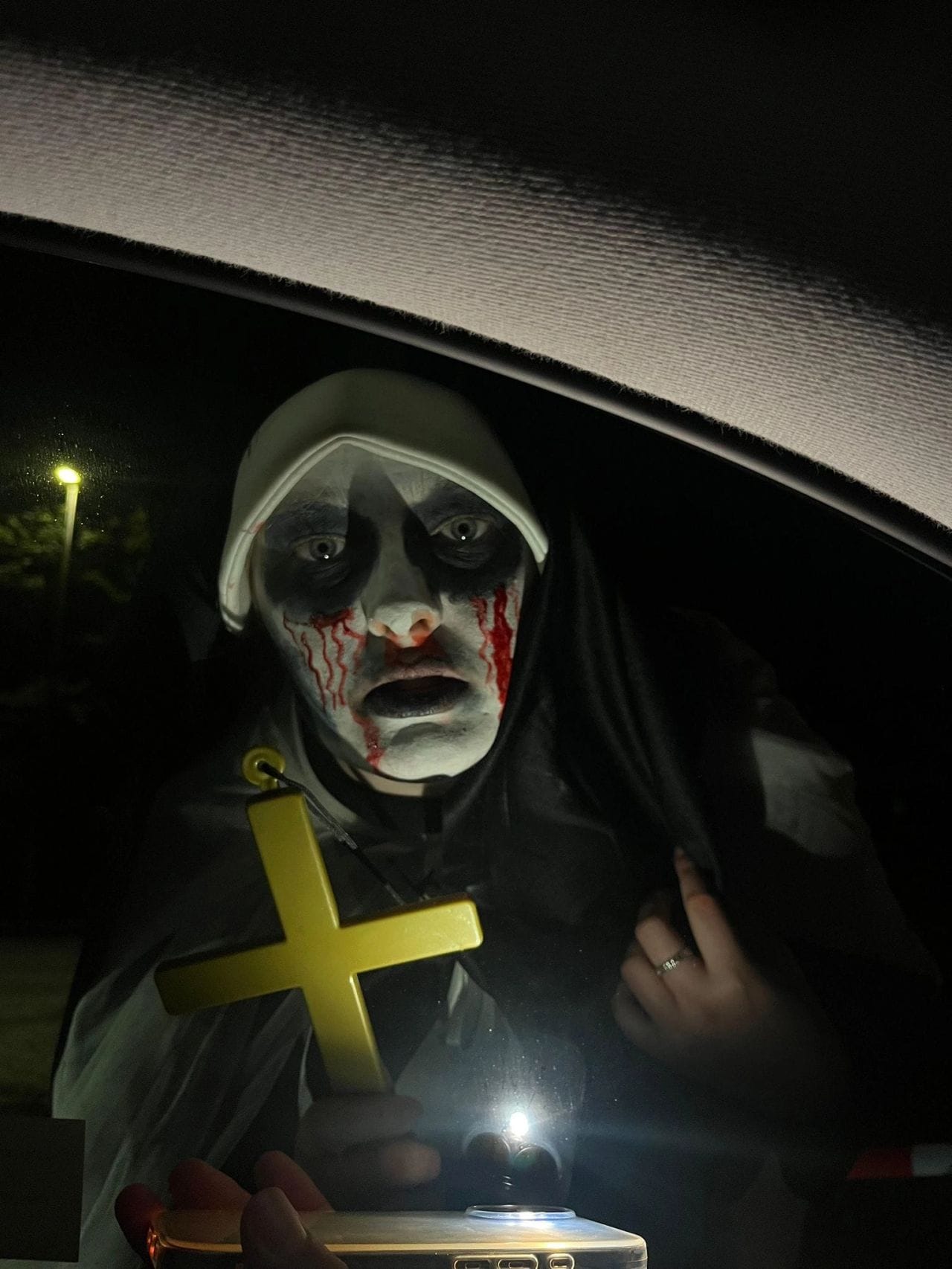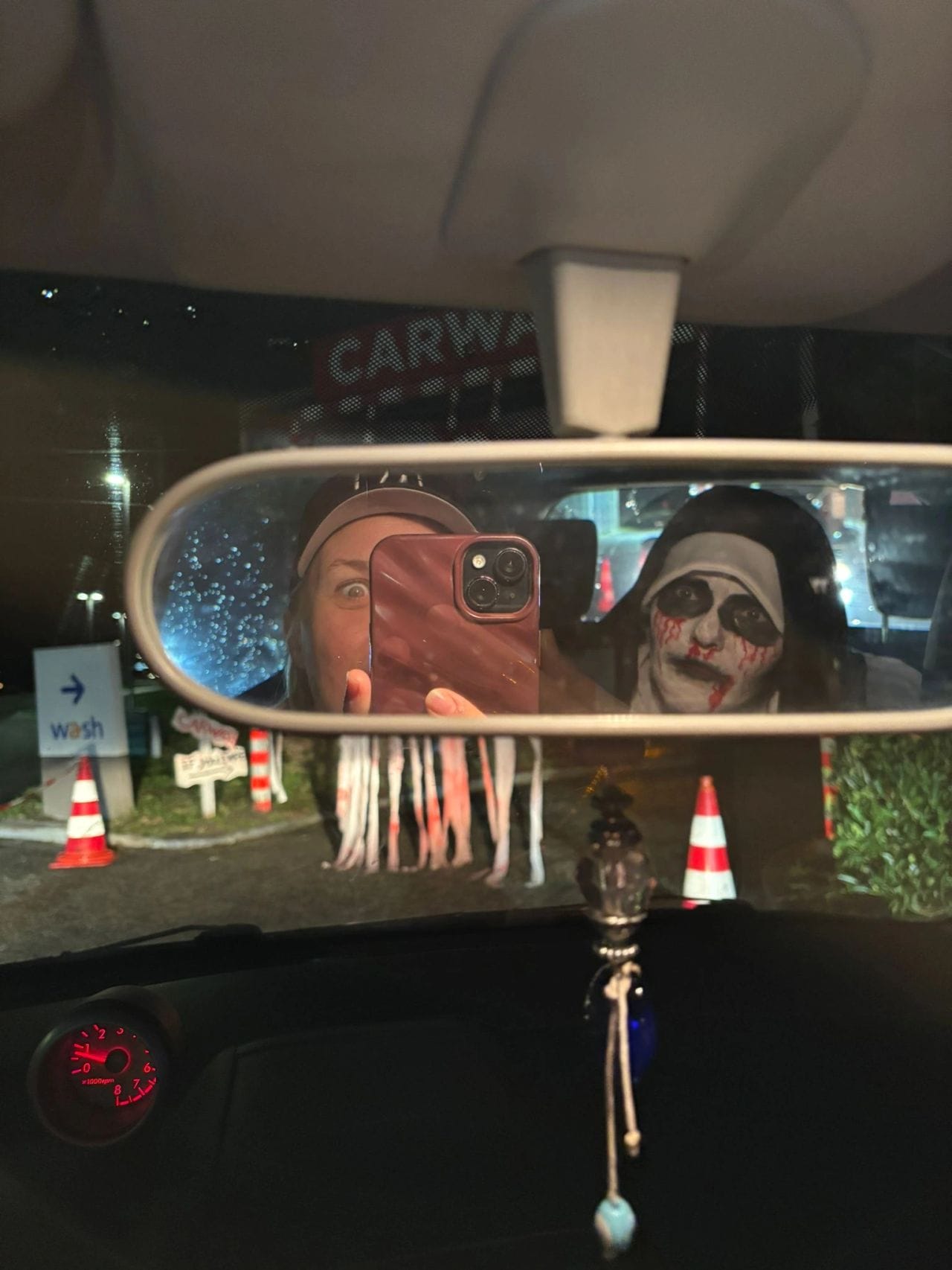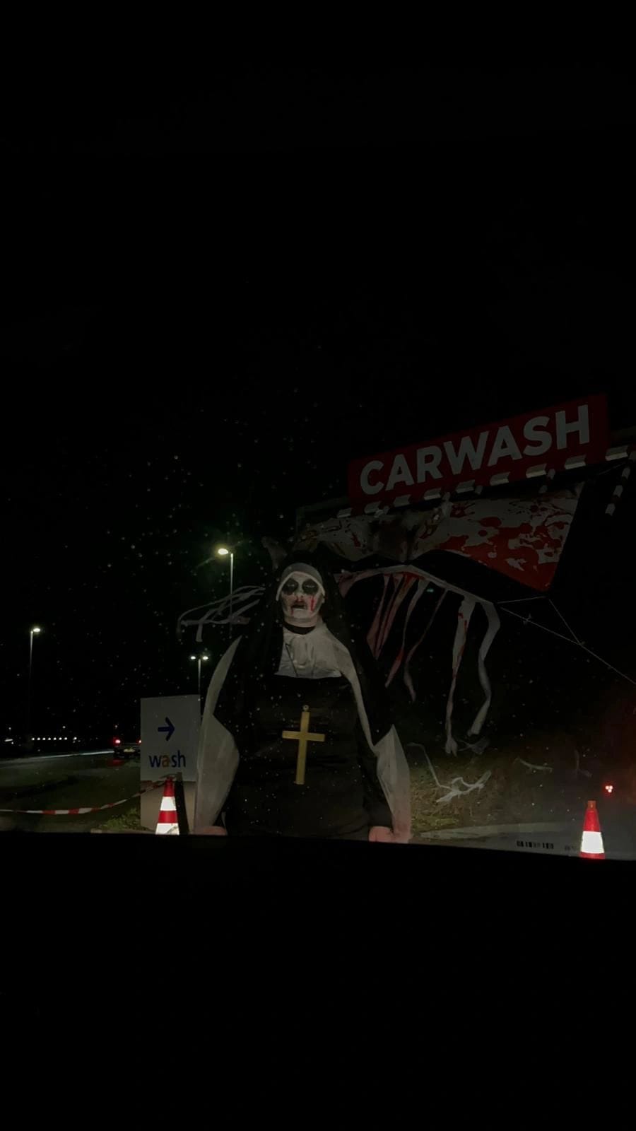 Такой формат довольно популярен в стране — хэллоуин-представление, где клиенты проезжают через «дом с привидениями», оставаясь в машине. По сути, театрализованное представление с актёрами, костюмами, декорациями, светом и музыкой — мини-шоу в формате автомойки. Ну, а чтобы принять участие, нужно было заранее купить билеты — в определённый временной слот с 16:00 до 24:00.