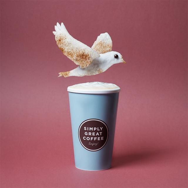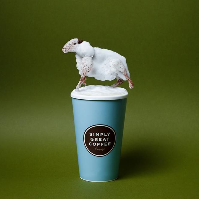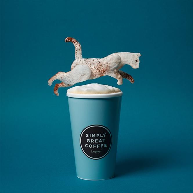 Кусочки были созданы из кофейной пены, помещенной на вырезанные трафареты. Если внимательно присмотреться, то можно увидеть, что каждая часть животного выполнена отдельно, создавая объемное изображение. Творения украшены кофейными зернами и ароматной корицей.