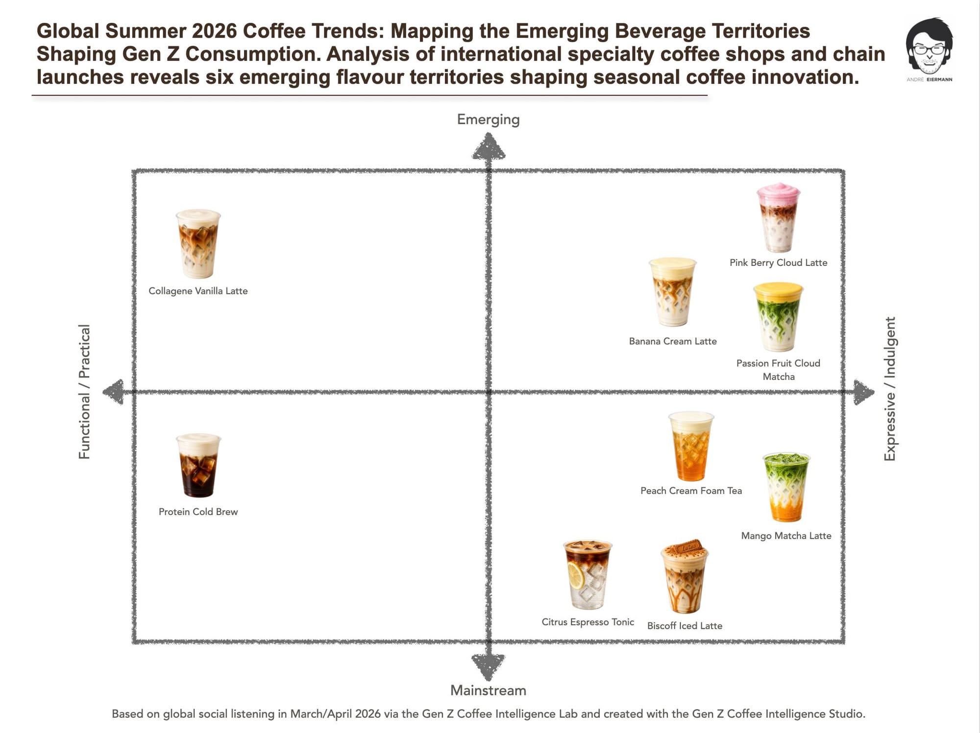 Примечательно, что впервые исследование было проведено с помощью автоматизированного парсинга (сбор данных из открытых источников в интернете — соцсети, сайты, меню кофеен) и социального прослушивания — это позволяет отслеживать тренды значительно динамичнее, чем раньше. При этом карта строилась на основе реальных данных марта-апреля 2026 года, то есть это не прогноз, а уже фиксируемые запросы потребителей. На карте позиционирования напитки распределены по двум осям: от формирующихся трендов к мейнстриму и от практичных и функциональных к ярким, сладким и созданным ради удовольствия.