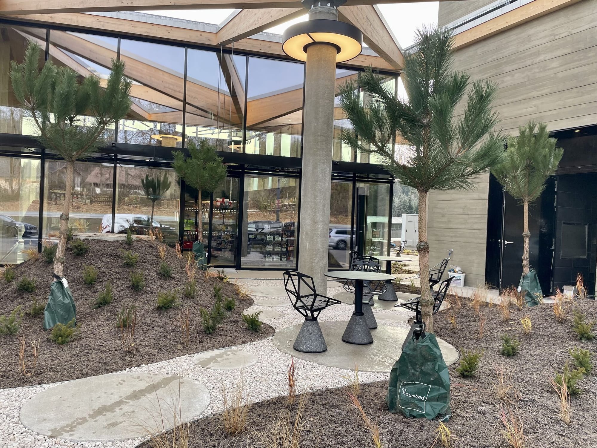 Ближе к зданию навес уже без кровли, чтобы оставить пространство открытым для зон отдыха. Но перед входной группой примыкание выполнено с использованием матового светопропускающего материала, который даёт ровный рассеянный свет и защищает от осадков.