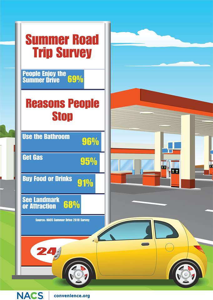 По данным NACS (National Association of Convenience Stores) - 96% автомобилистов, путешествующих летом, заезжают на автозаправочную станцию, чтобы воспользоваться туалетом.