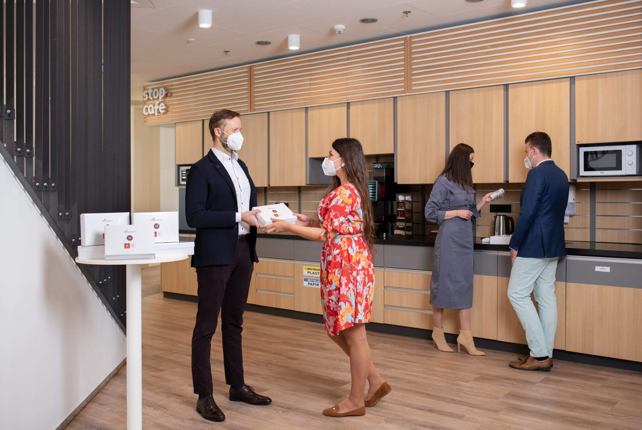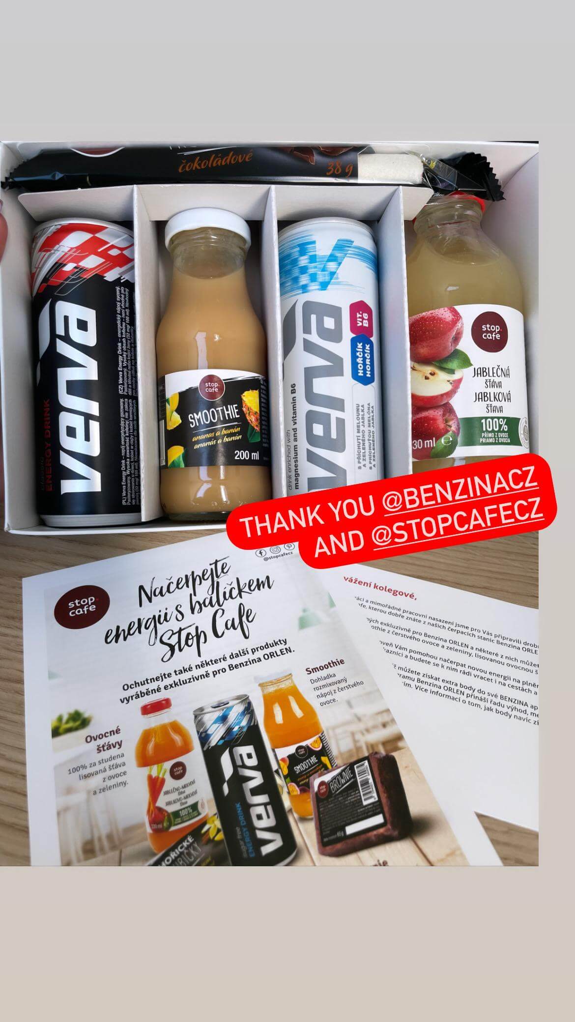 Внутри подарочной упаковки были новинки от премиального бренда Stop Cafe. Сотрудники могли попробовать смузи, свежевыжатые соки, энергетические напитки и популярные шоколадные батончики Hořice. Все эти продукты и напитки доступны в ассортименте на автозаправочных станциях сети Benzina ORLEN.