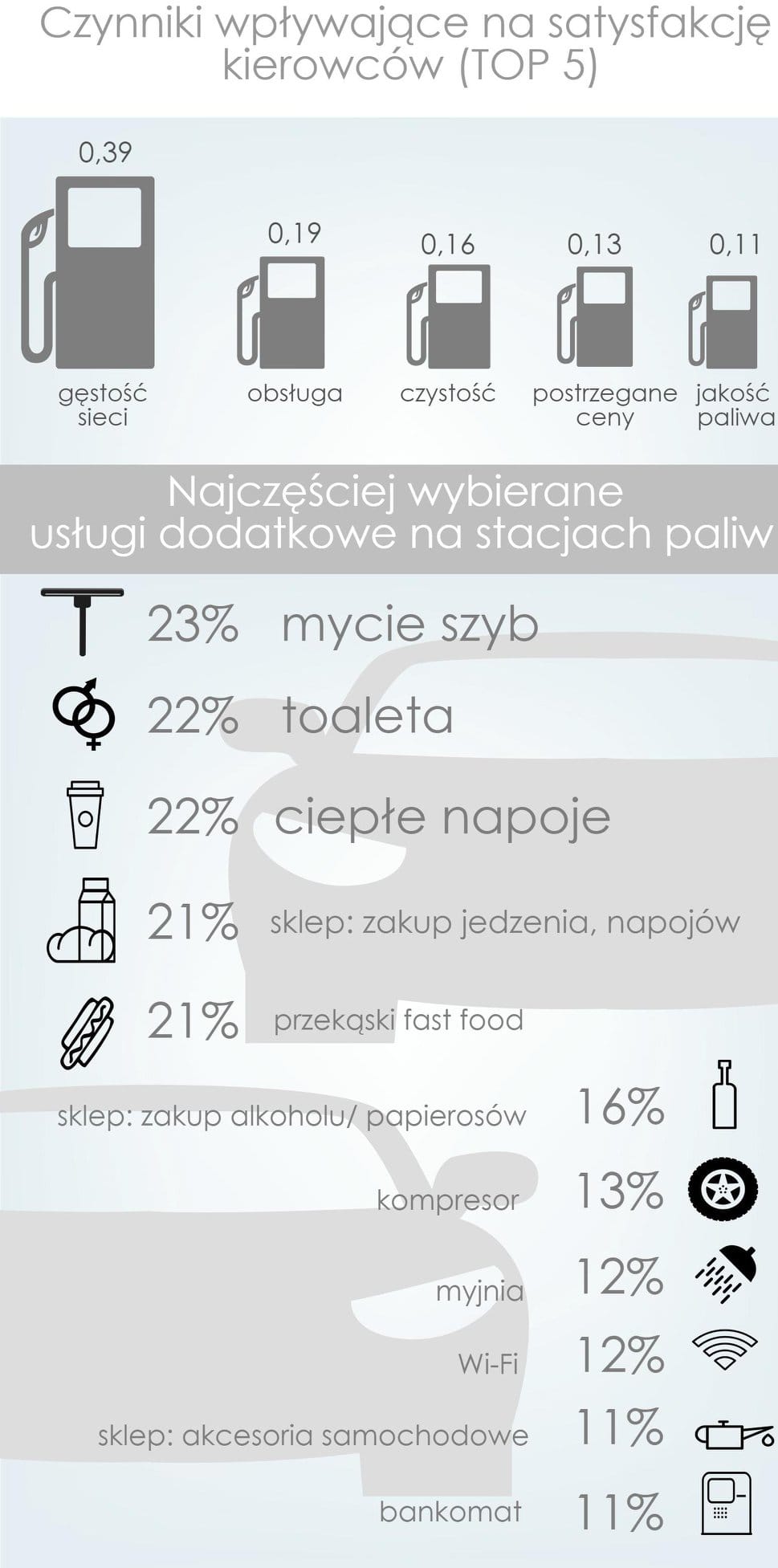 При оценке сетей АЗС польские водители уделяют особое внимание их разветвлённости. Из пяти наиболее важных факторов, влияющих на степень удовлетворённости клиентов, цены оказались на предпоследнем месте. Больше внимания уделяется уровню обслуживания персоналом и чистоте станции.