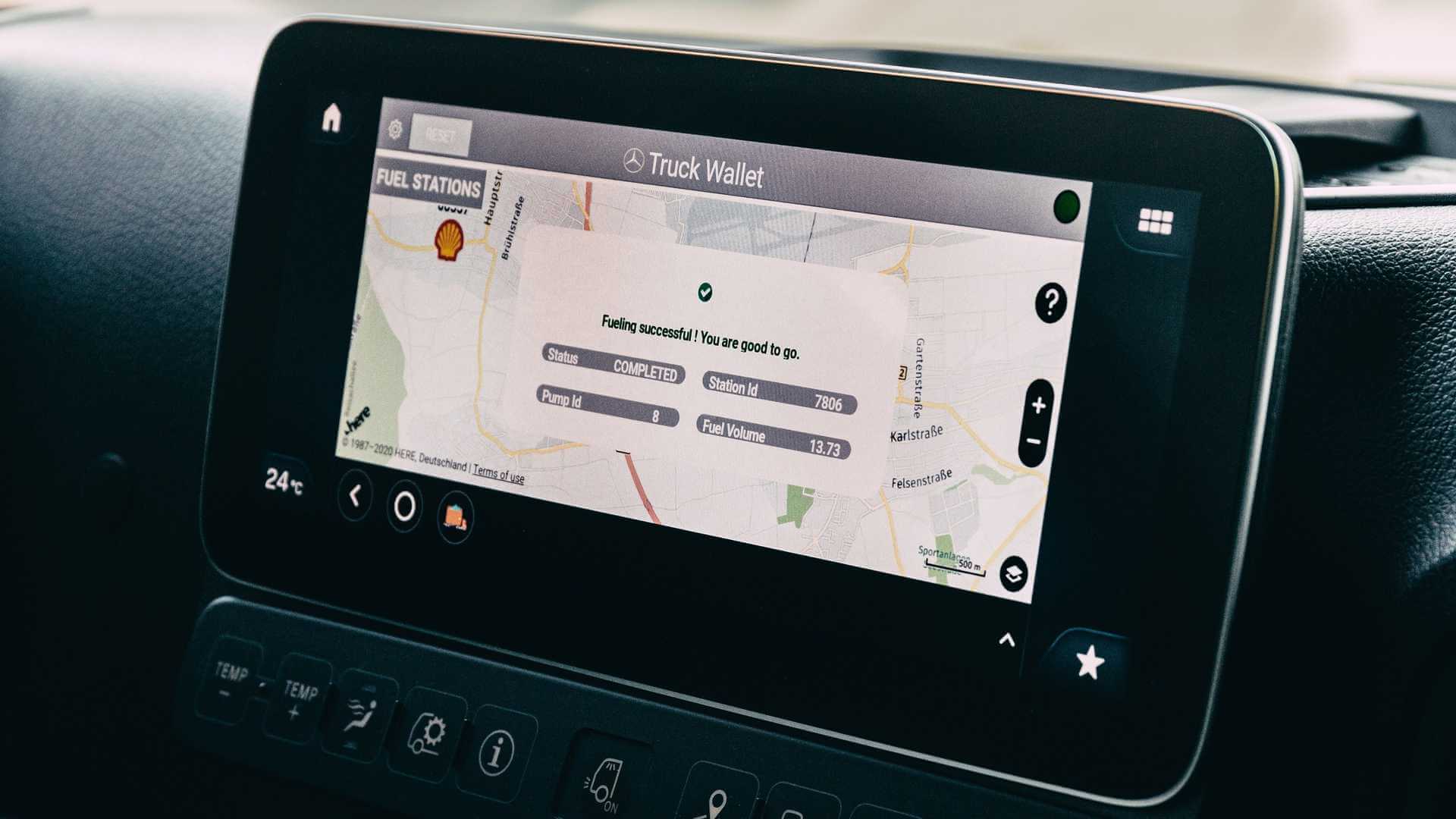 Mercedes-Benz Trucks также связал топливную карту с Truck Wallet – технологией, которая работает как классический кошелек смартфонов для всех приложений, которые могут получить доступ к Truck-ID для различных целей. В рамках тестов цифровая топливная карта получила доступ к функции Truck-ID через кошелек Truck Wallet, а также аутентифицировала и авторизовала грузовик в системе центральной станции обслуживания во время процесса онлайн-платежей.