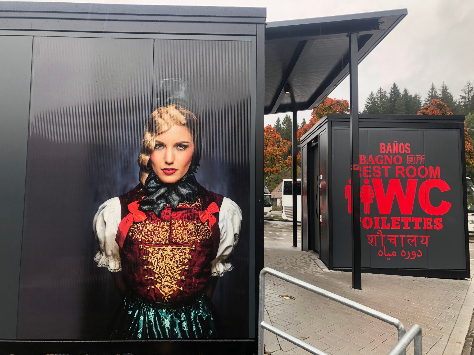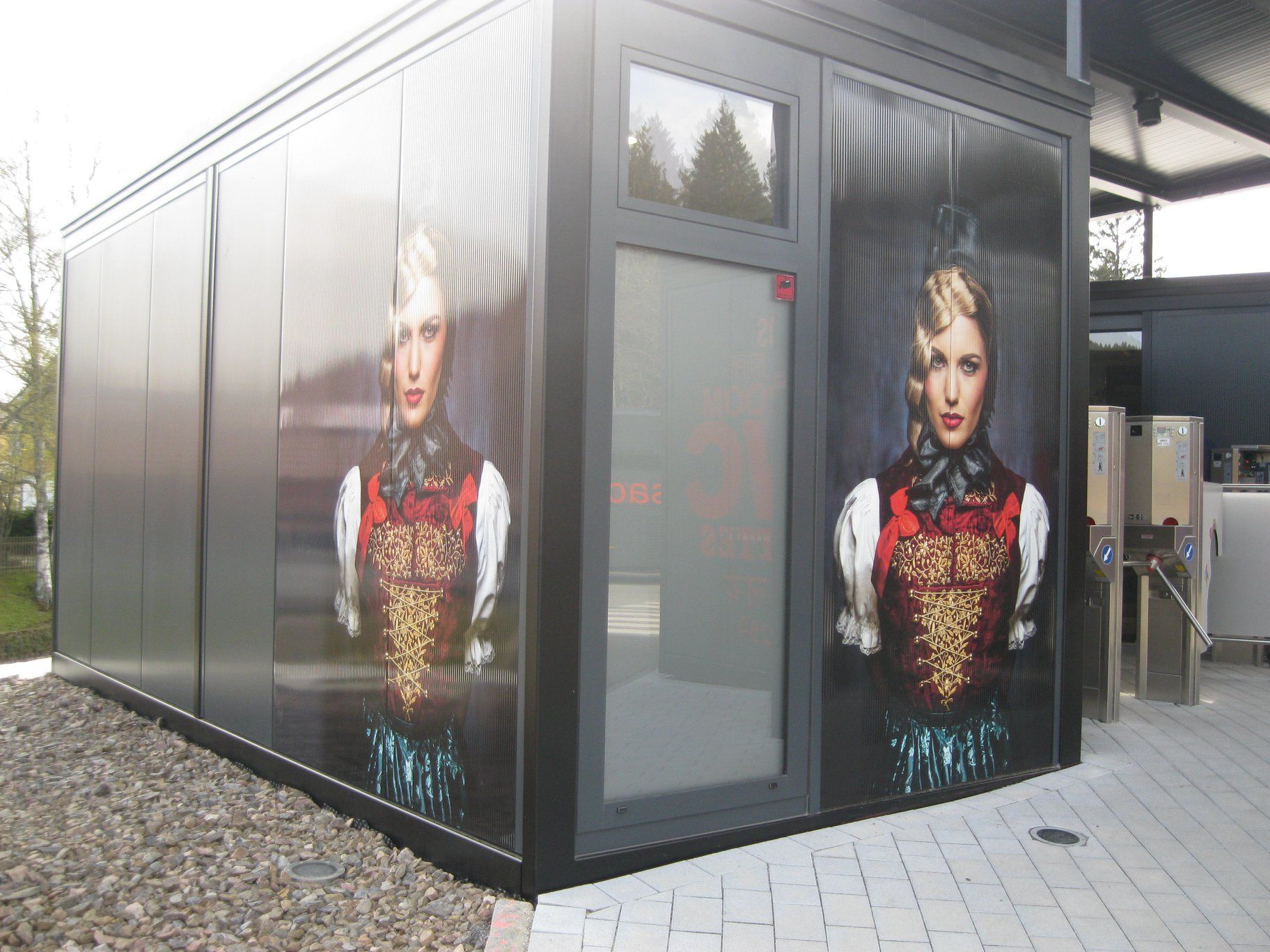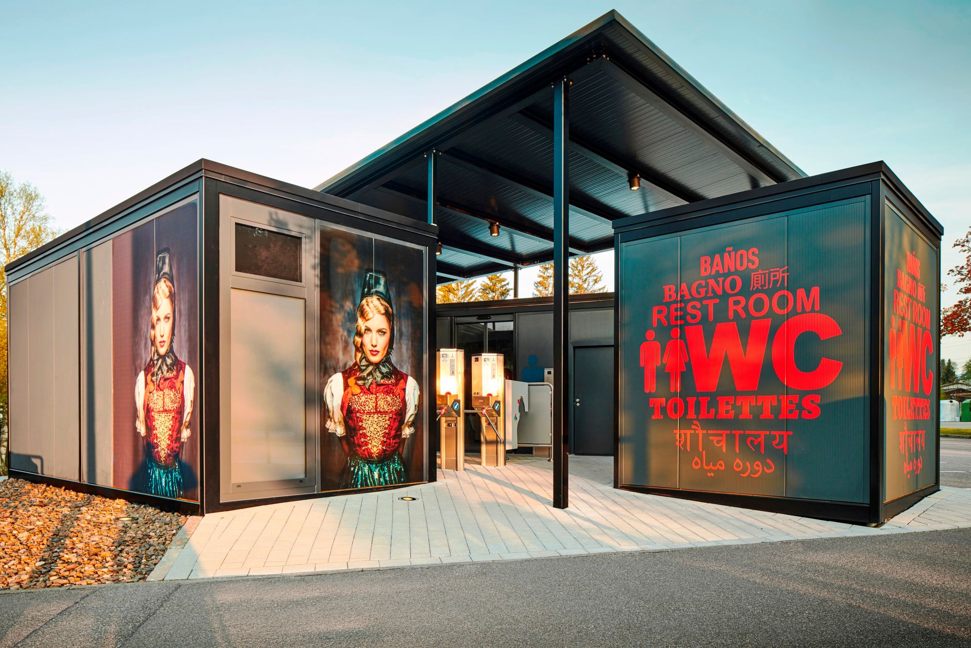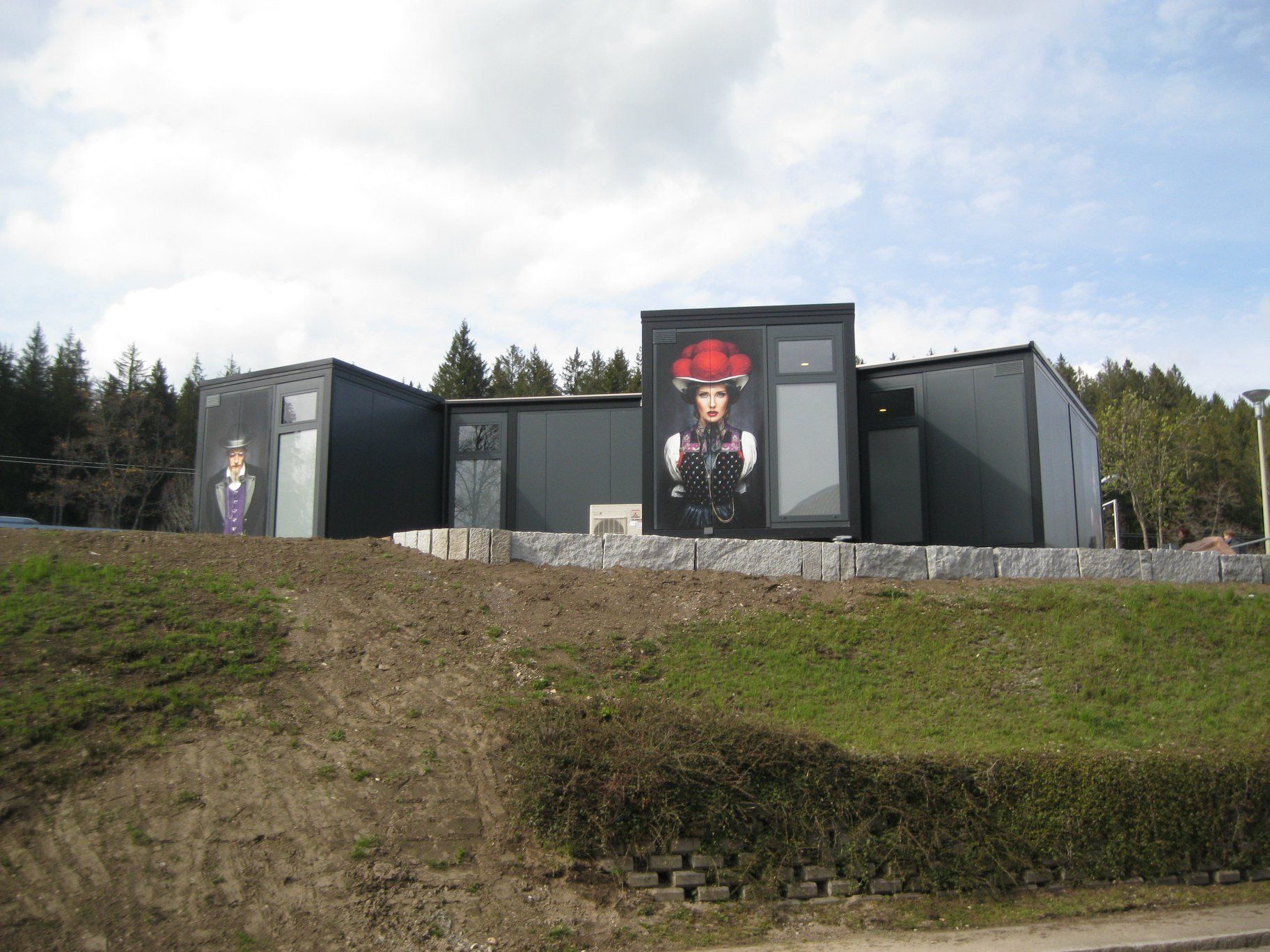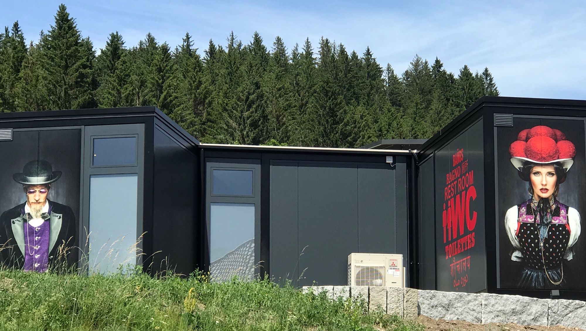 Снаружи модульный комплекс выглядит достаточно современно. В дизайне фасадов использованы работы известного немецкого фотографа Себастьяна Верле – портреты людей в традиционной для данной местности одежде, что усиливает связь с регионом. Кроме того, они обозначают мужской и женский туалеты.