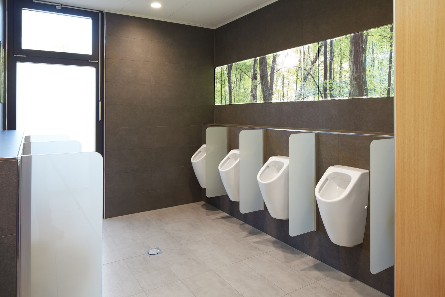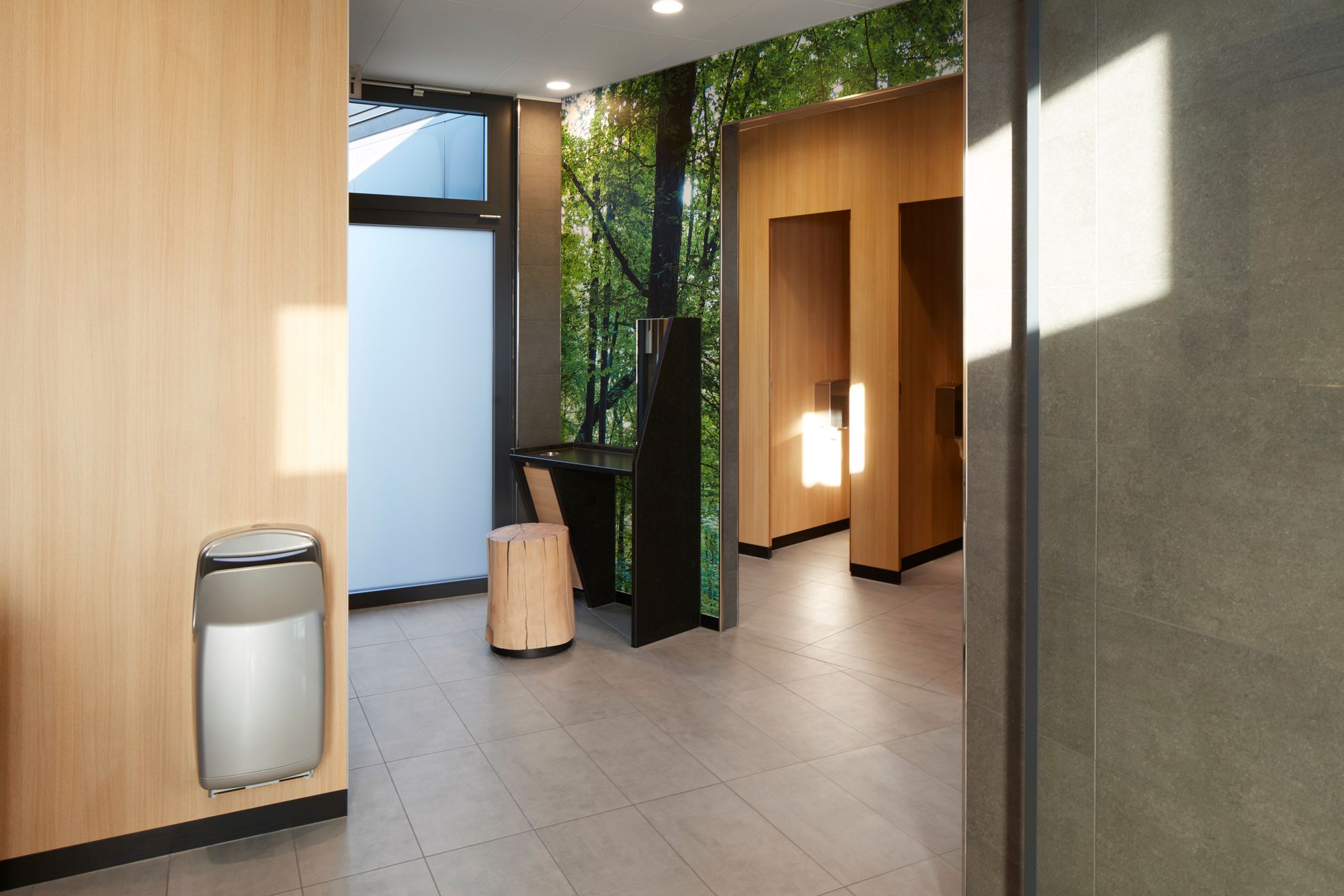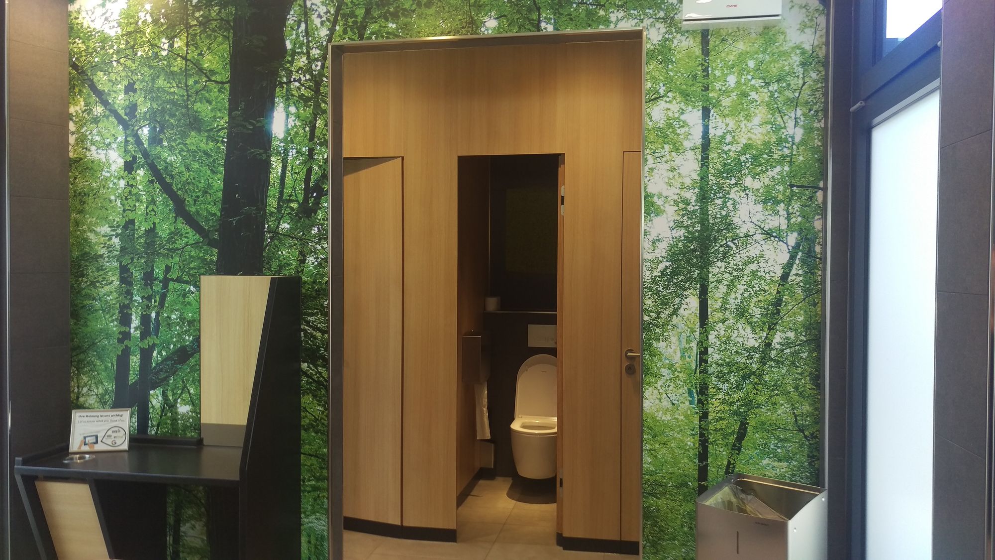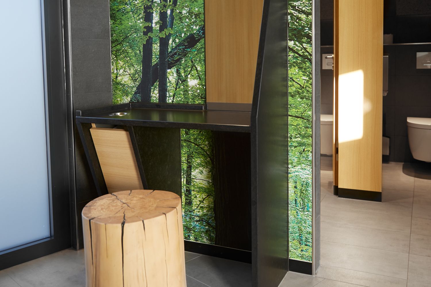 Внутри посетителей туалета ожидают лесные мотивы за плексигласом и звукопоглощающие панели из ароматного мха с подсветкой. Умывальники выполнены с основанием из натурального камня, а аромат елей вместе со звуками природы – пением местных птиц и шелестом деревьев из динамиков создают атмосферу региона Верхнего Шварцвальда.