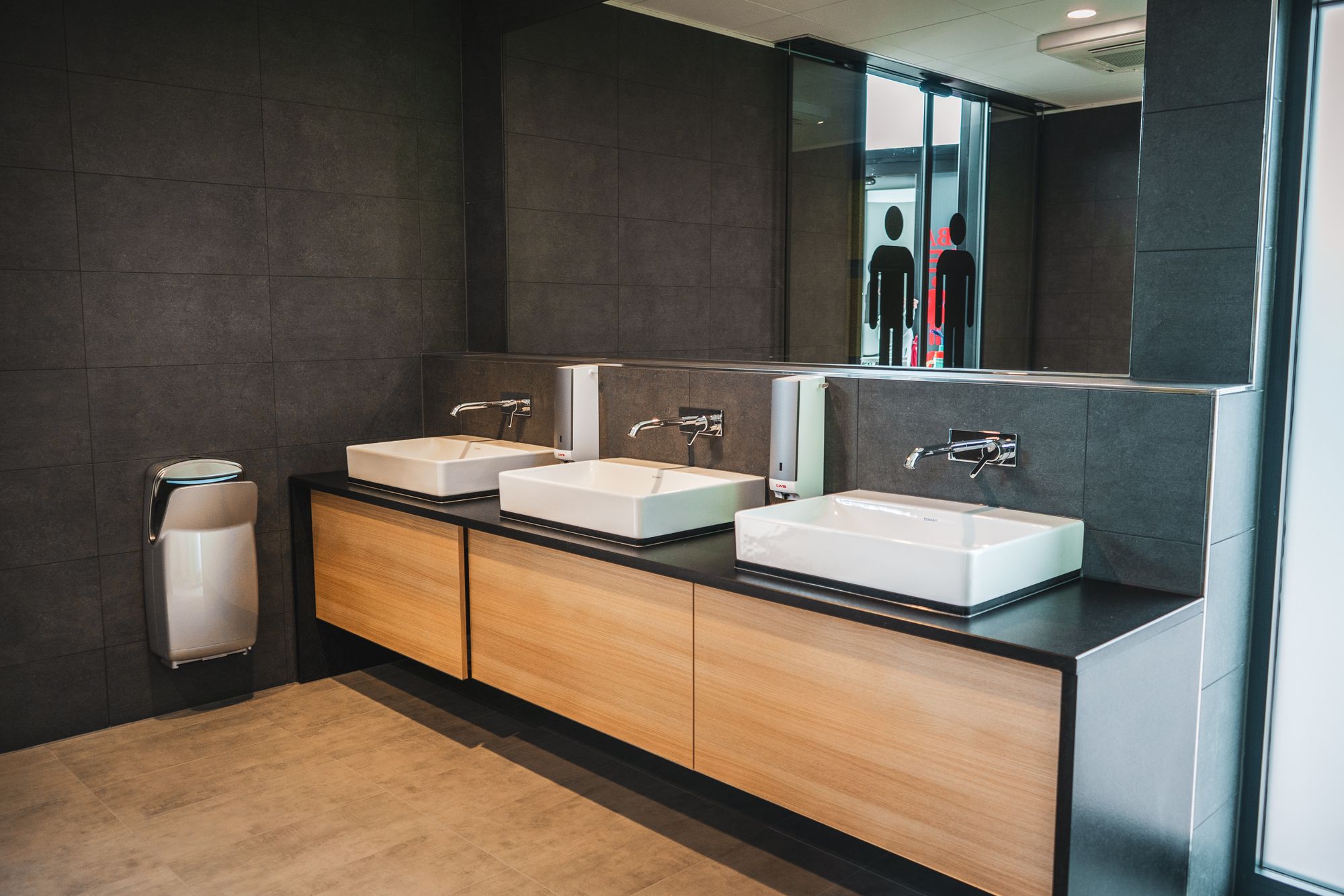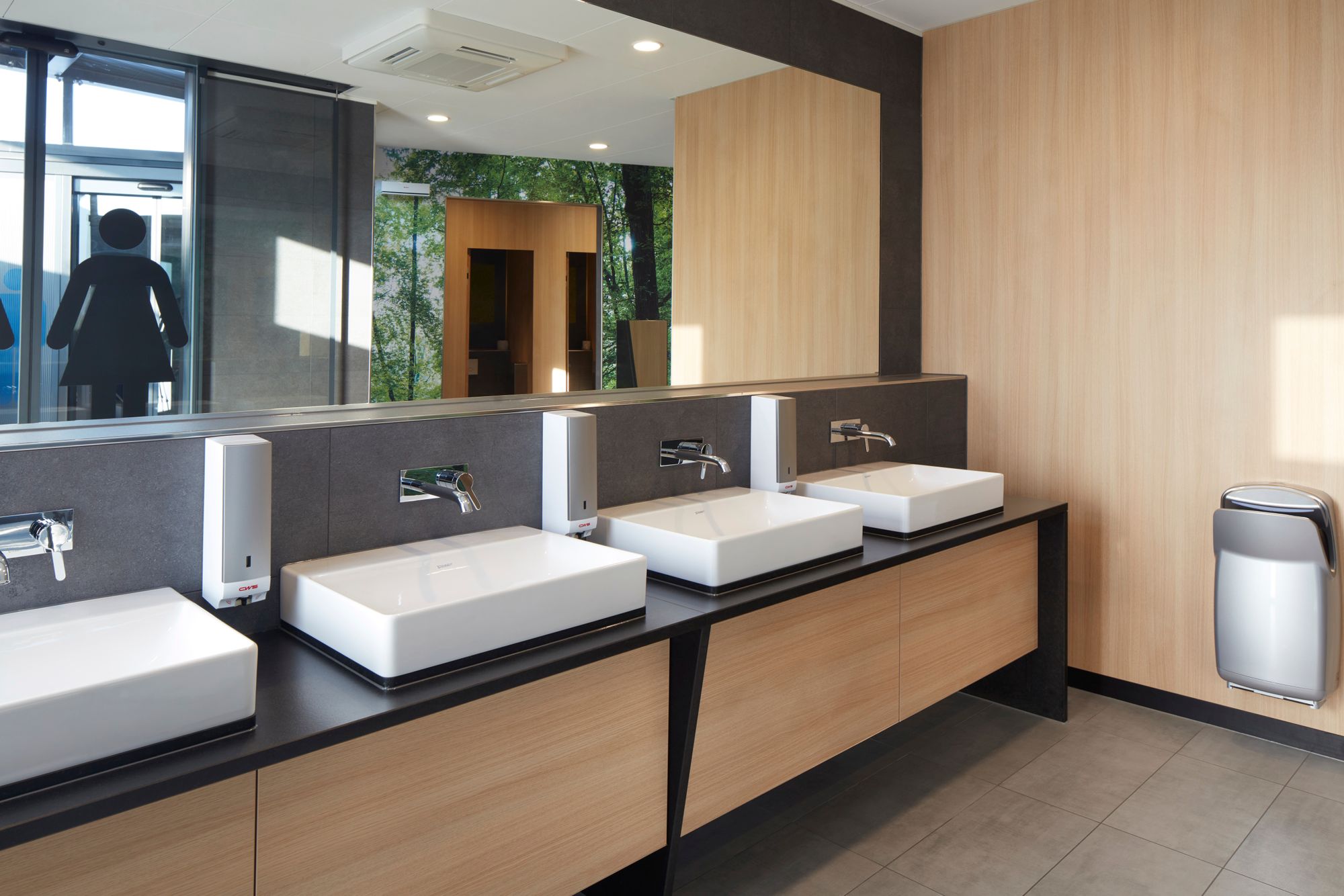 Чтобы соответствовать различным гигиеническим нормам и стандартам, например, для гостей из арабских и азиатских стран оборудованы дополнительные санузлы с унитазами-биде (SensoWash). Также есть индивидуальные кабинки с отдельными умывальниками и пеленальными столиками. Везде установлено высококачественное сантехническое оборудование Duravit, сенсорные смесители и дозаторы, электрические сушилки для рук. Технологическая система автоматически регулирует вентиляцию и кондиционирование всех помещений.
