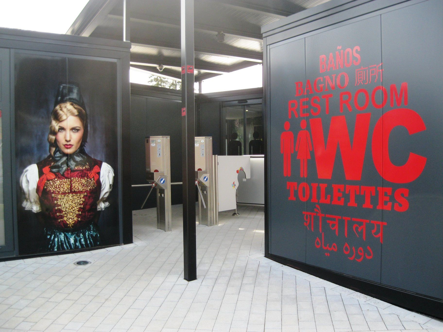 Туалет состоит из пяти соединенных между собой модулей с общей площадью помещений 74 м2. Каждый из двух совмещенных блоков образует умывальную и санитарную зоны для мужчин и женщин; пятый – служит безбарьерным туалетом. Каждый отдельный модуль изготавливался по индивидуальному заказу и точно соответствует его предполагаемому использованию.