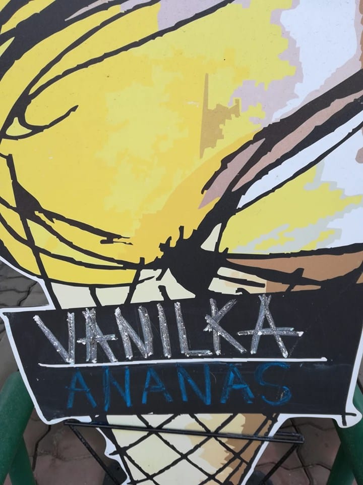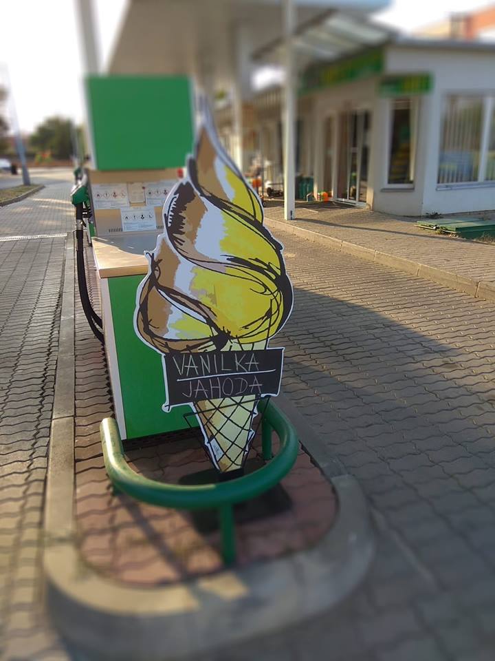 На небольшой автозаправочной станции в городе Литен (Чехия) покупателям предлагают мягкое мороженое. Прямо на въезде к топливораздаточным колонкам на АЗС установлена реклама рожка. На ней указано, какие вкусы мороженого доступны в продаже сегодня. Надпись обновляют при каждой замене смеси для изготовления мороженого, поэтому покупатели всегда знают, какие вкусы можно попробовать.