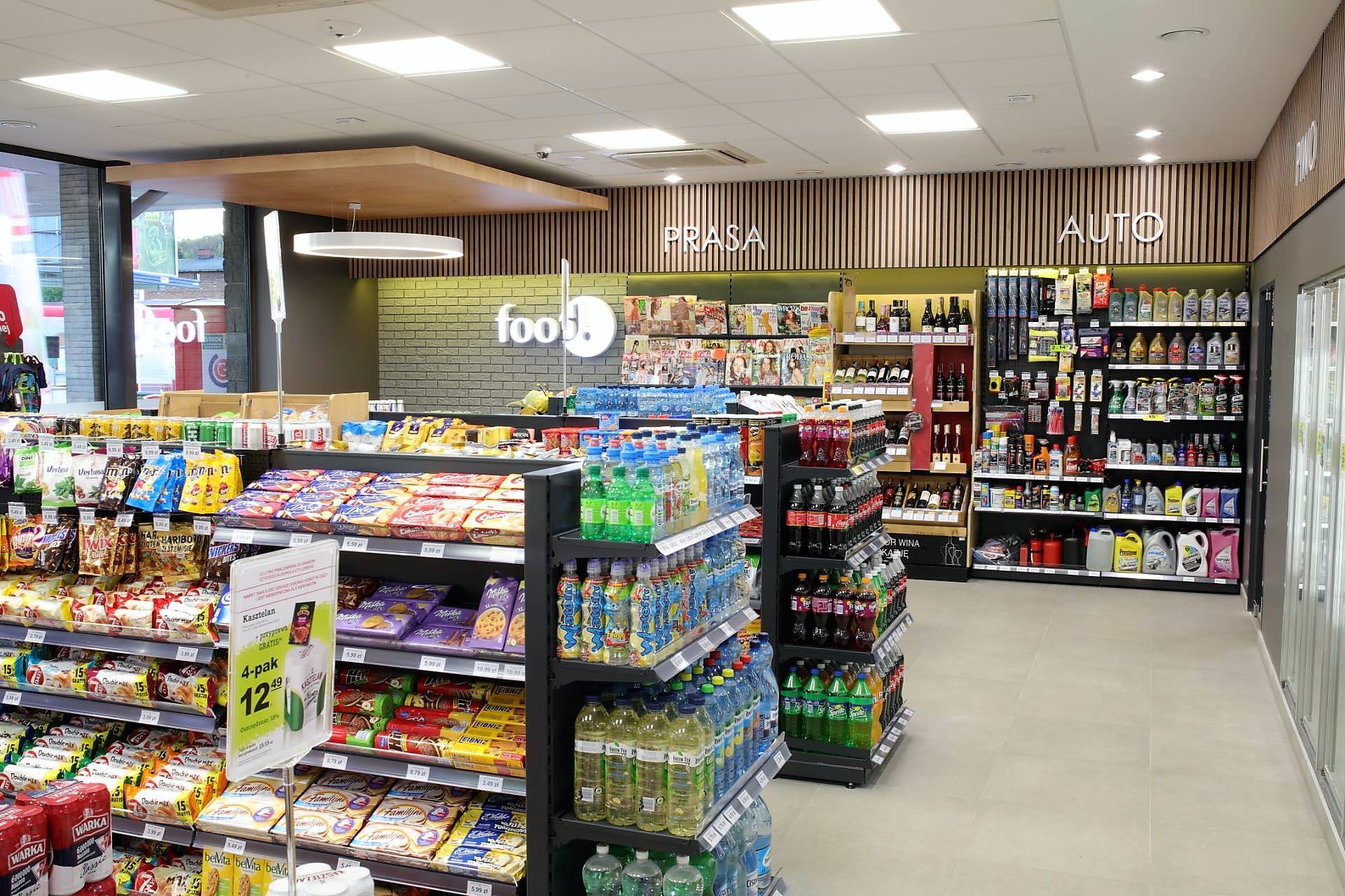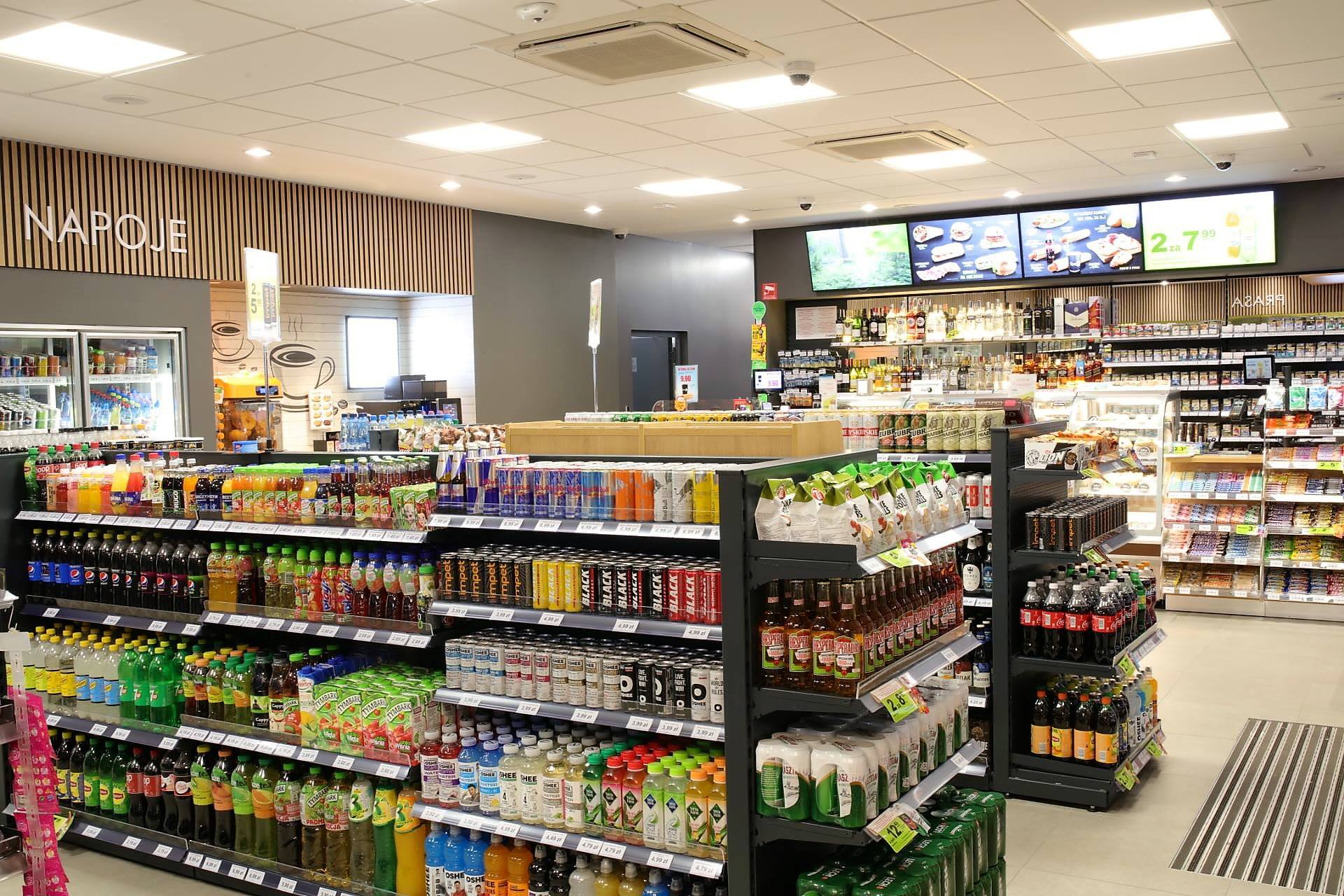 Магазин на АЗС предлагает широкий ассортимент товаров, в т.ч. свежеприготовленные сэндвичи, запеканки и хот-доги.