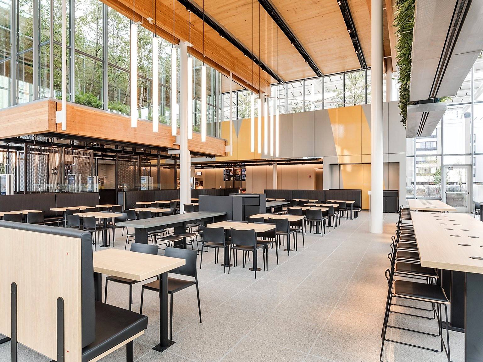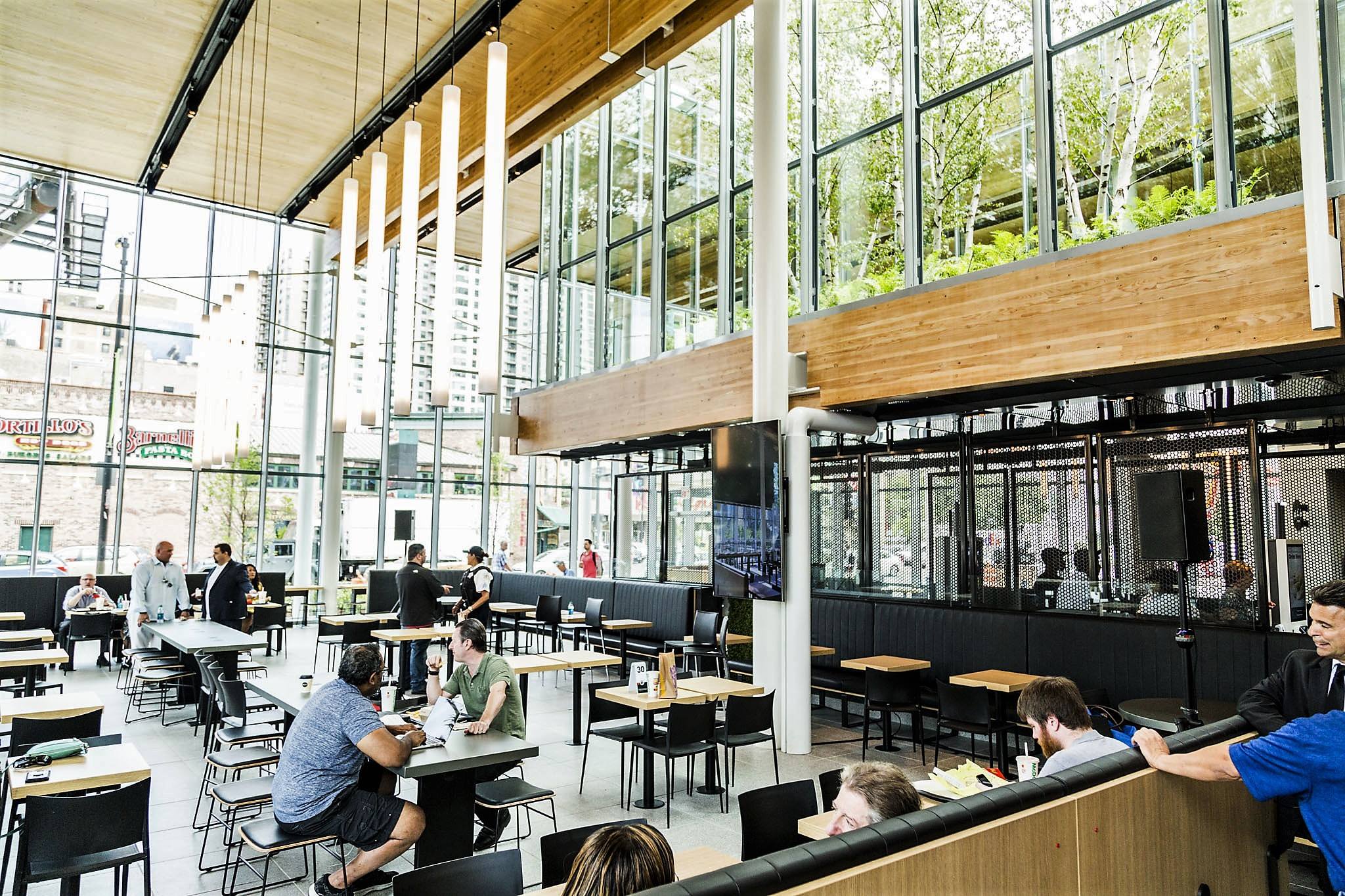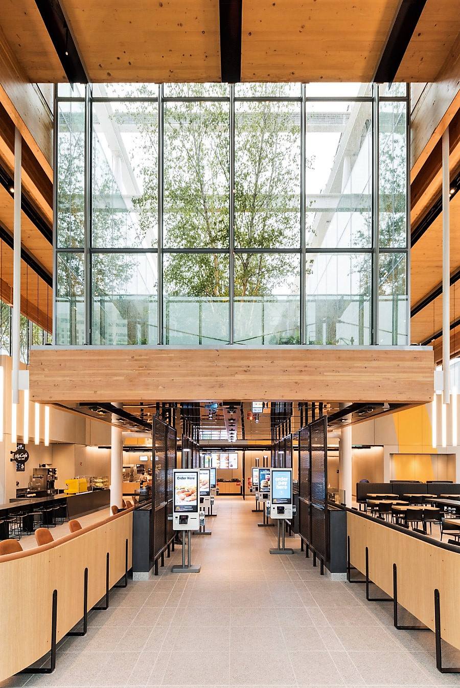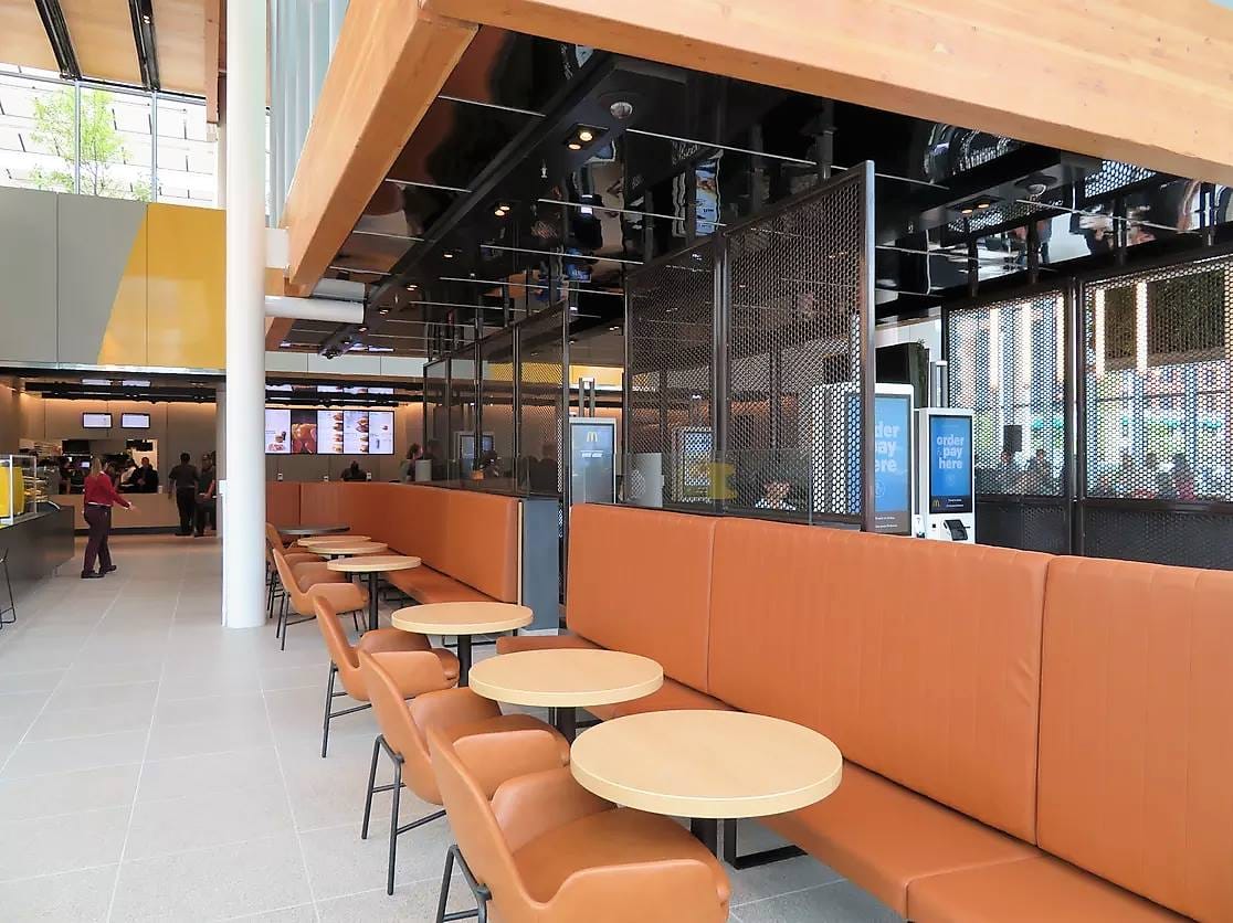 Внутренняя часть ресторана, скорее всего, больше похожа на Apple Store, чем на McDonald's. В интерьере преобладают теплые тона, элементы отделки и балки выполнены из ламинированного дерева. Яркое пространство массивного атриума разделяет центральный проход, по сторонам которого расположены шесть двухсторонних киосков самооблуживания. Под общими столами размещены беспроводные зарядные устройства и розетки.