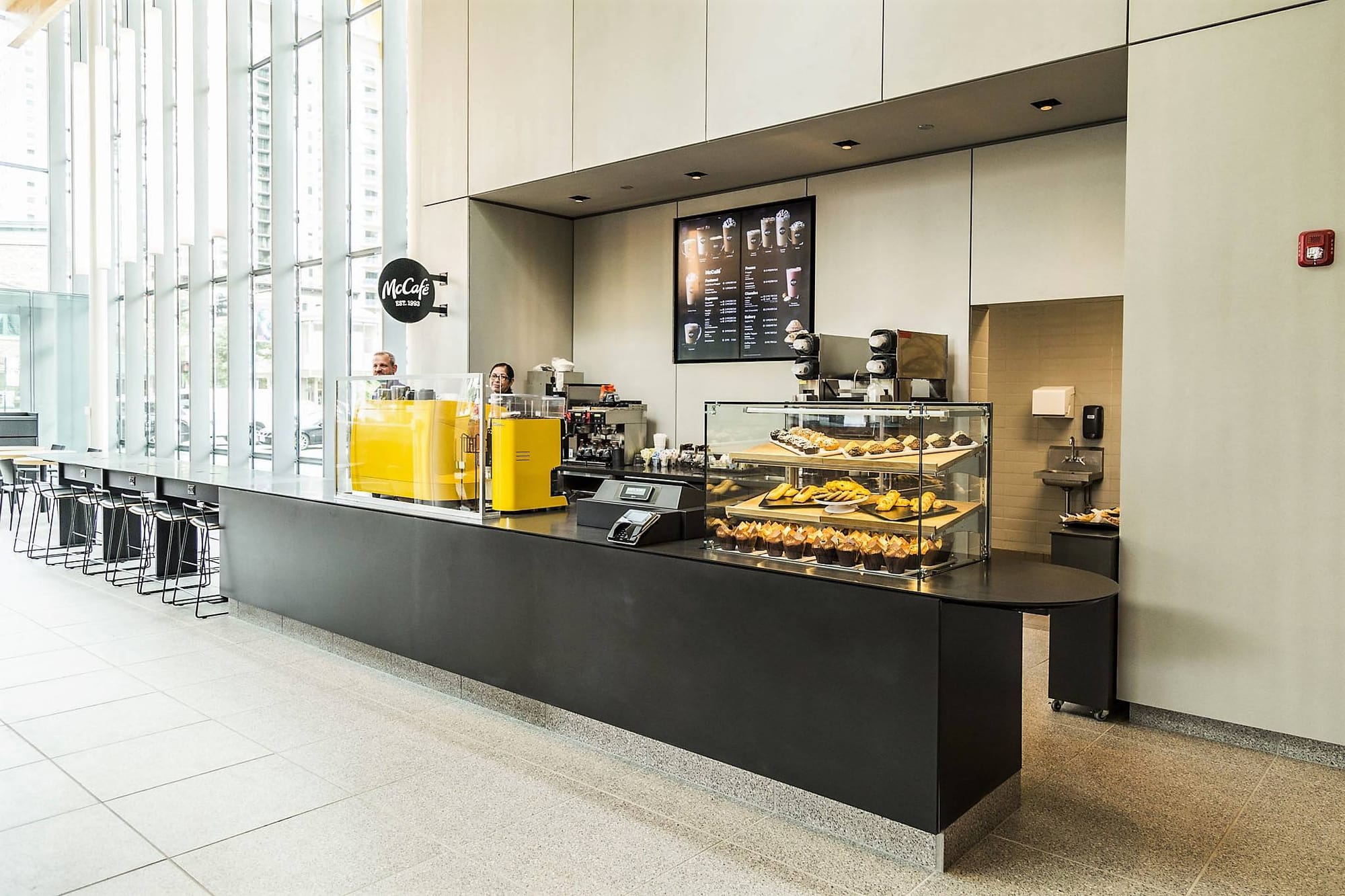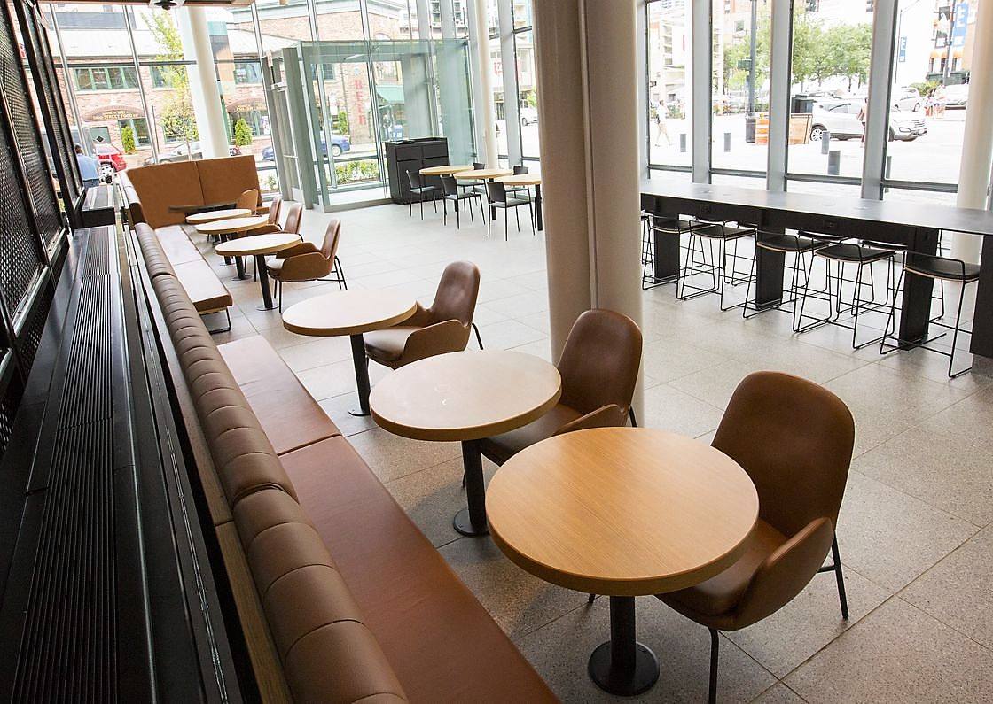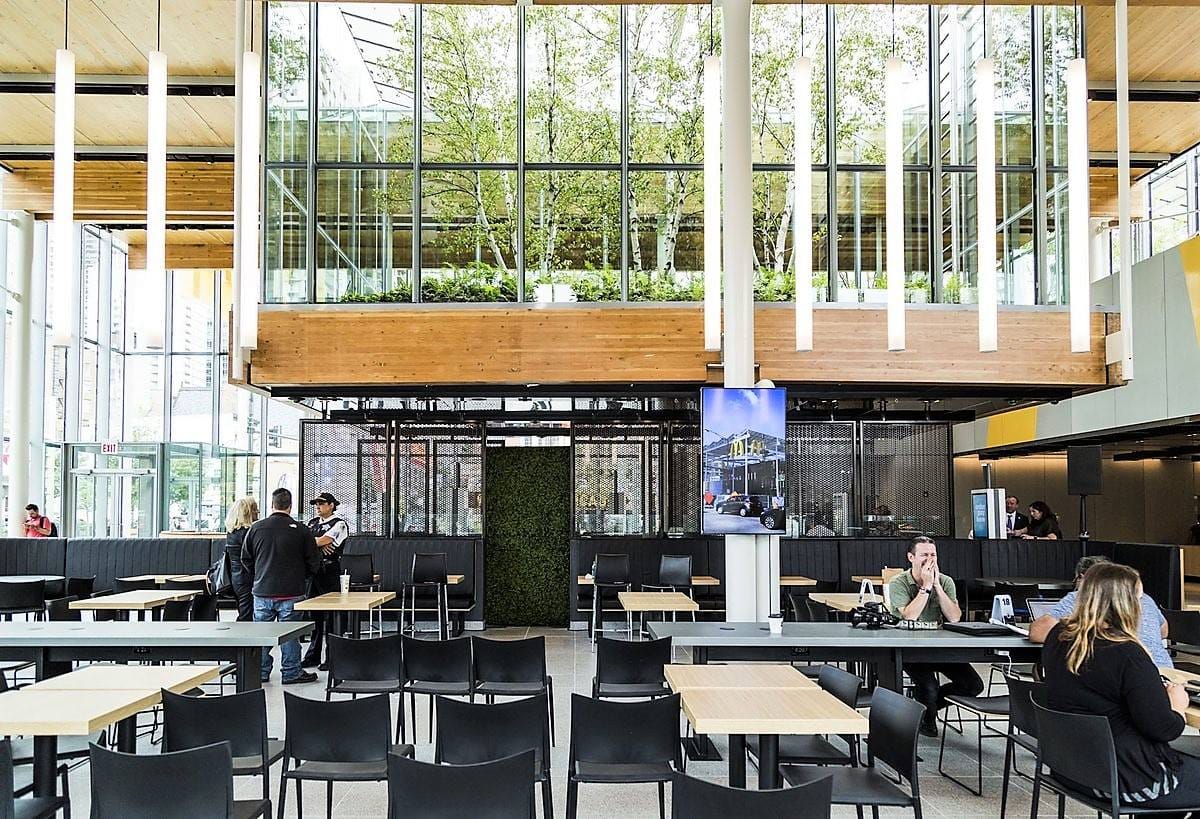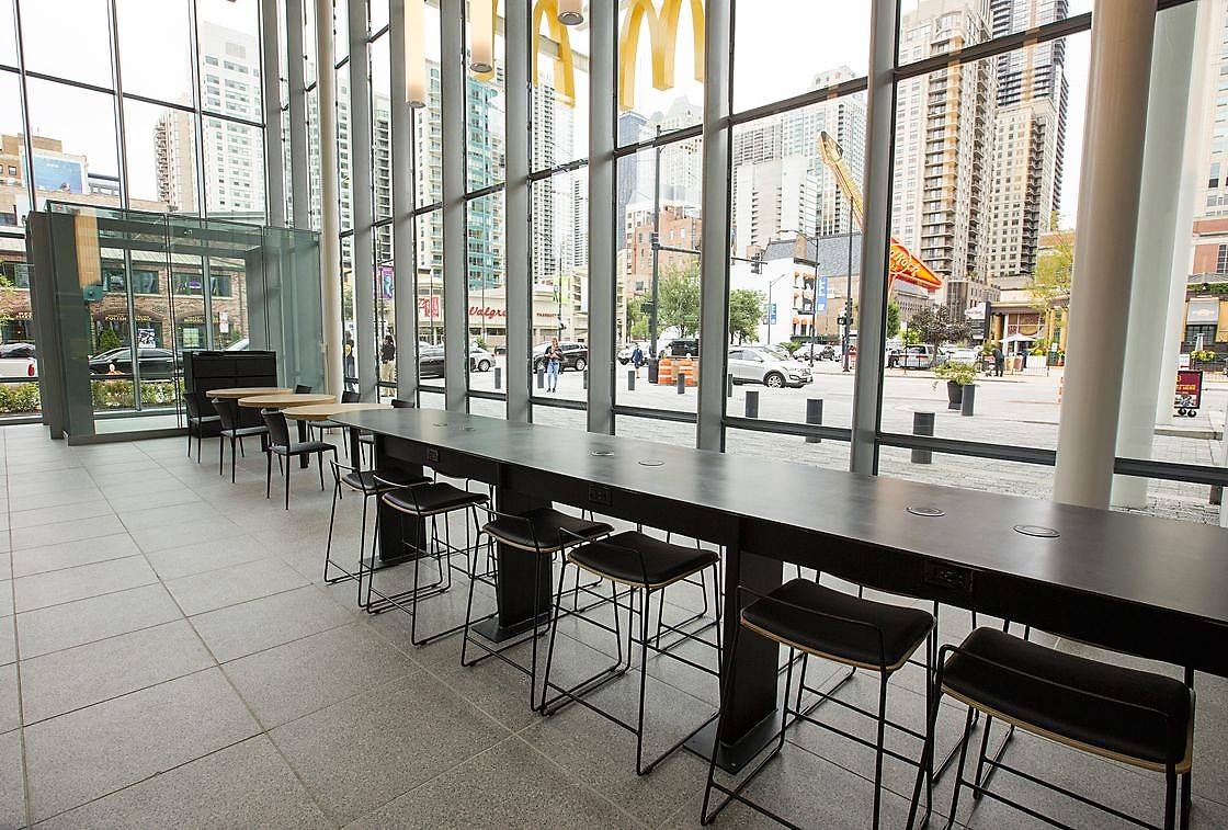 Внутренняя часть ресторана, скорее всего, больше похожа на Apple Store, чем на McDonald's. В интерьере преобладают теплые тона, элементы отделки и балки выполнены из ламинированного дерева. Яркое пространство массивного атриума разделяет центральный проход, по сторонам которого расположены шесть двухсторонних киосков самооблуживания. Под общими столами размещены беспроводные зарядные устройства и розетки.