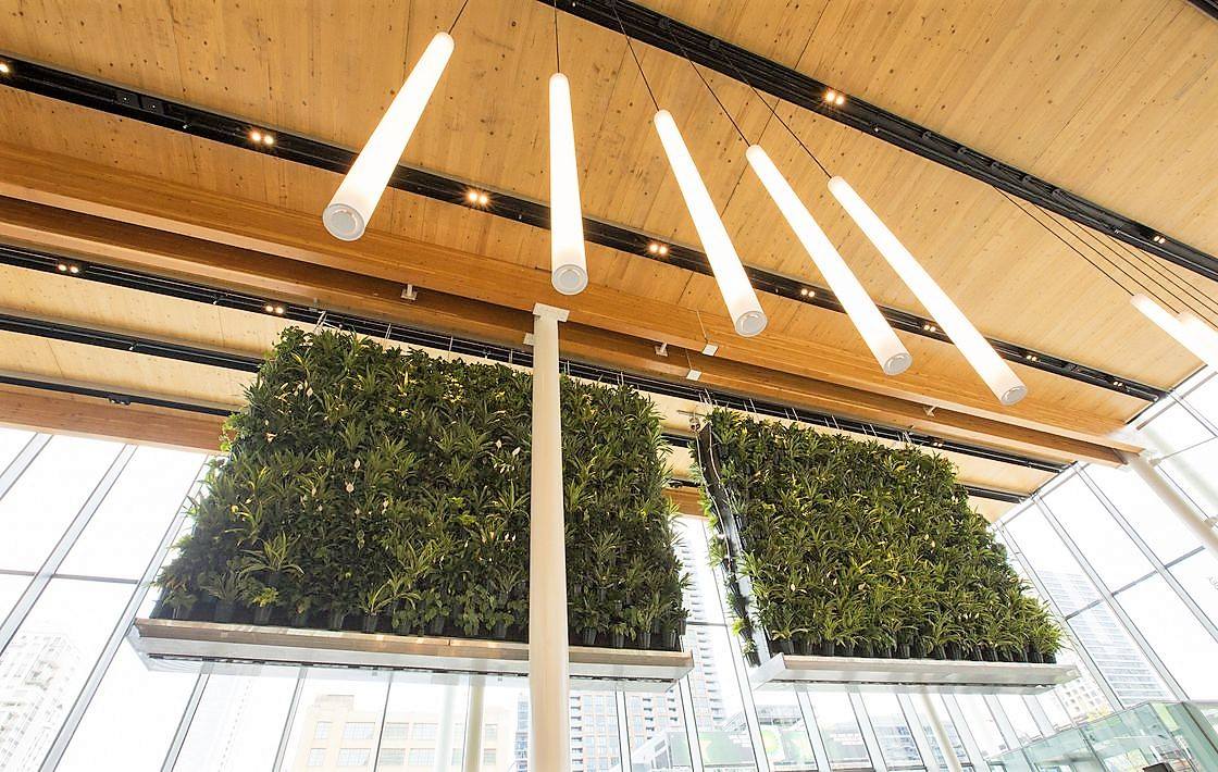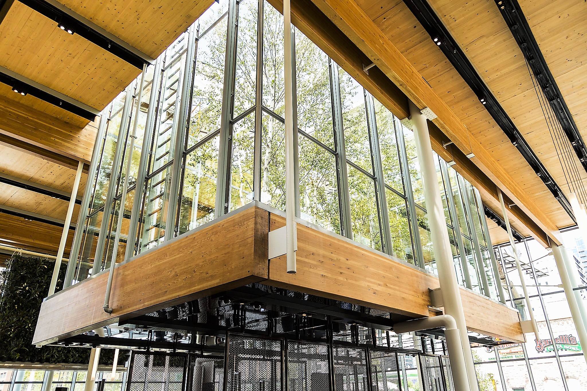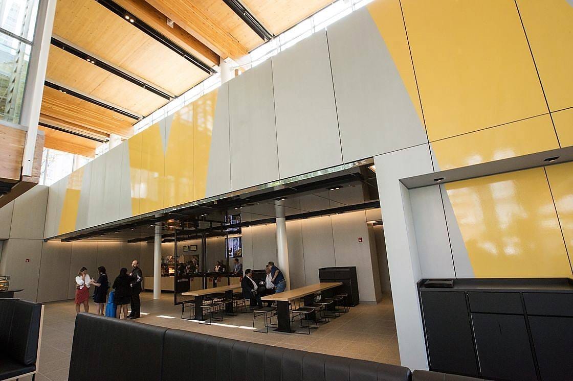 Конструкция здания выполнена из стали, стекла и кросс-ламинированной древесины, с гигантскими окнами от пола до потолка и цилиндрическим освещением. Внутренняя часть ресторана площадью около 2000 кв.м и высотой потолка до 8,5 м. Это определенно не типичный McDonald's - на крыше размещены солнечные батареи, парковочная стоянка собирает, рециркулирует дождевую воду и есть массивная живая стена, выложенная сотнями растений.